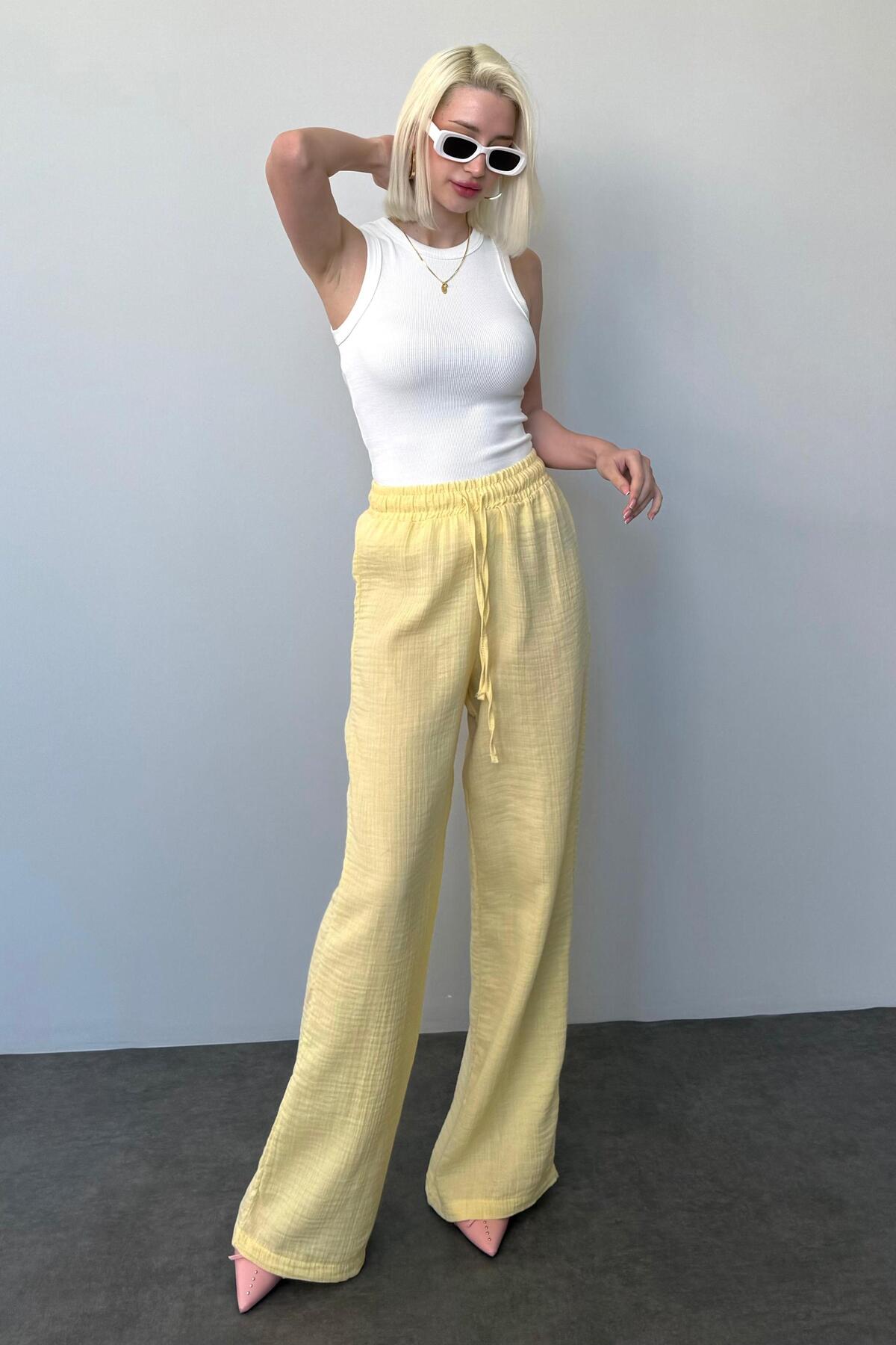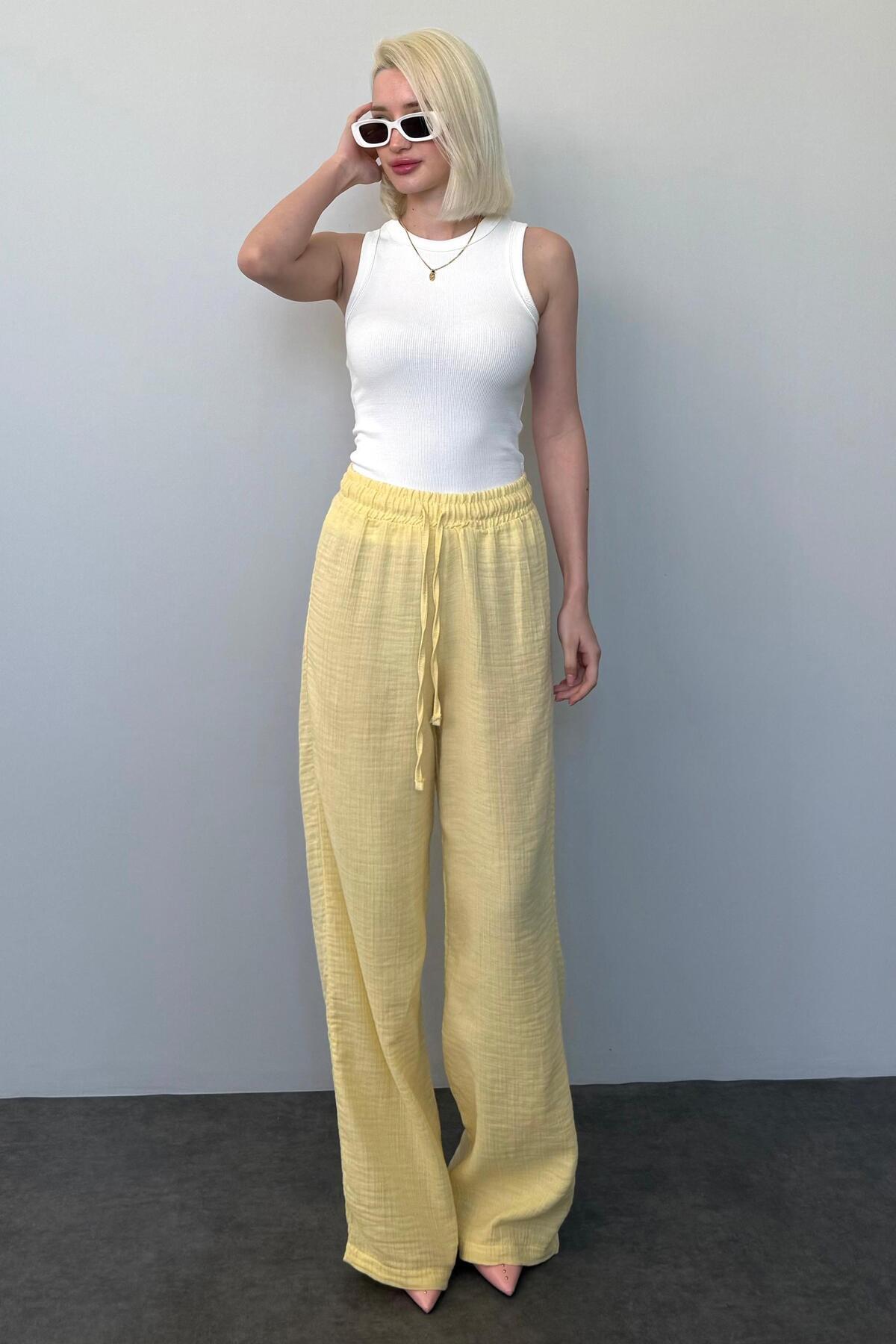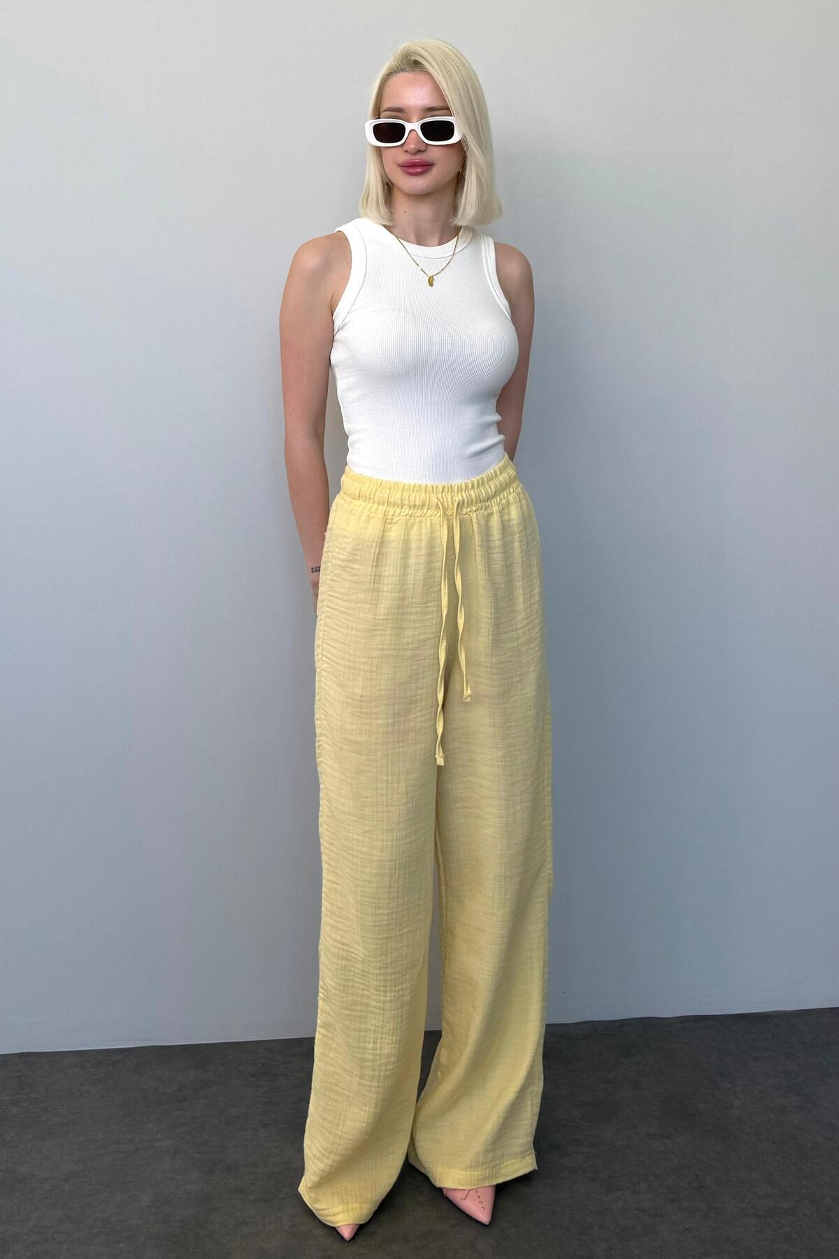 Women's yellow wide leg muslin trousers ideal for daily use with a comfortable cut.