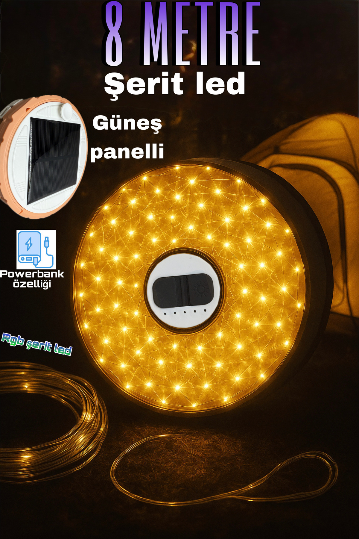 Spice up your camping adventures with the Solar Rechargeable RGB Camping Light! This multifunctional 8-meter-long LED strip light offers both a decorative and functional solution.