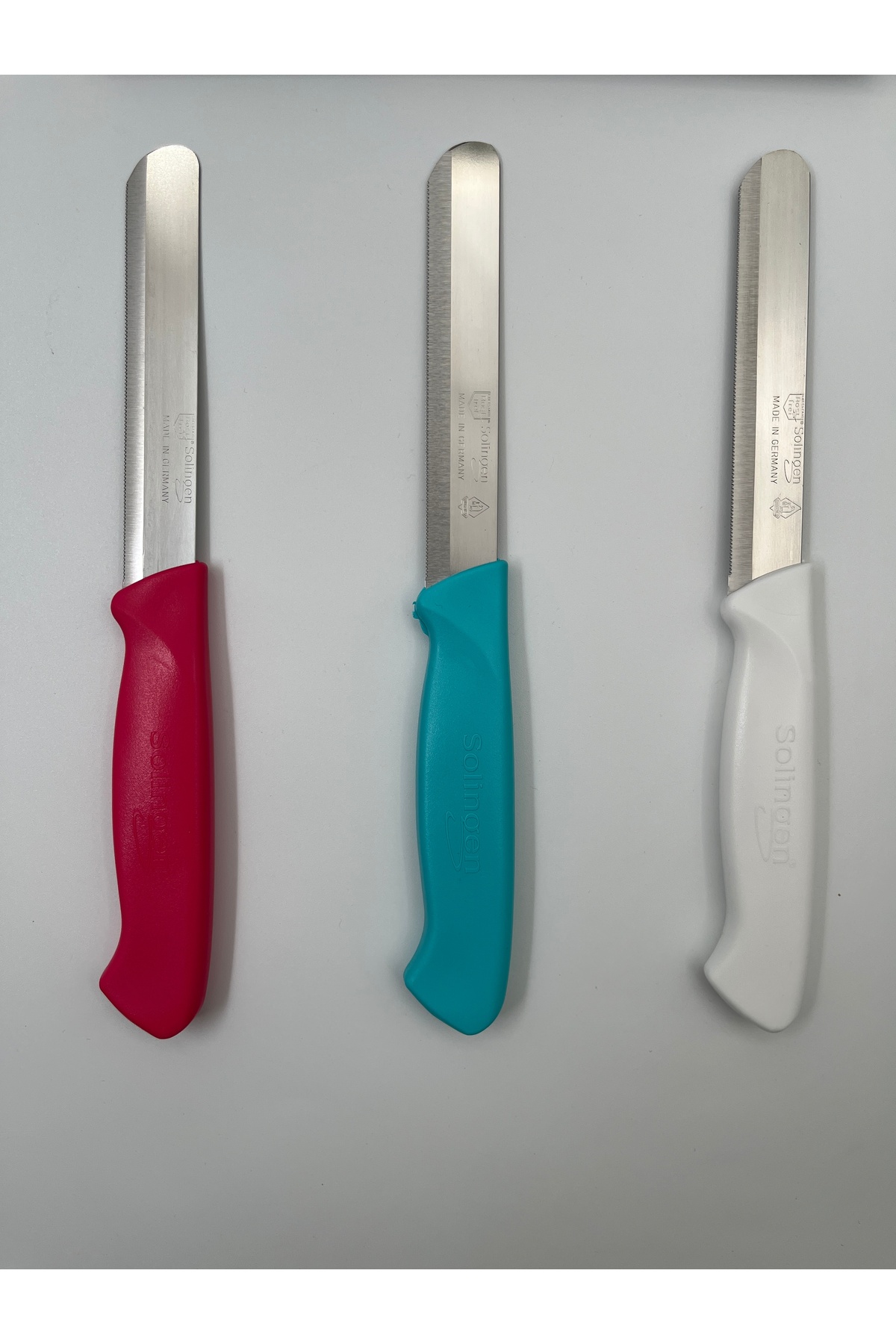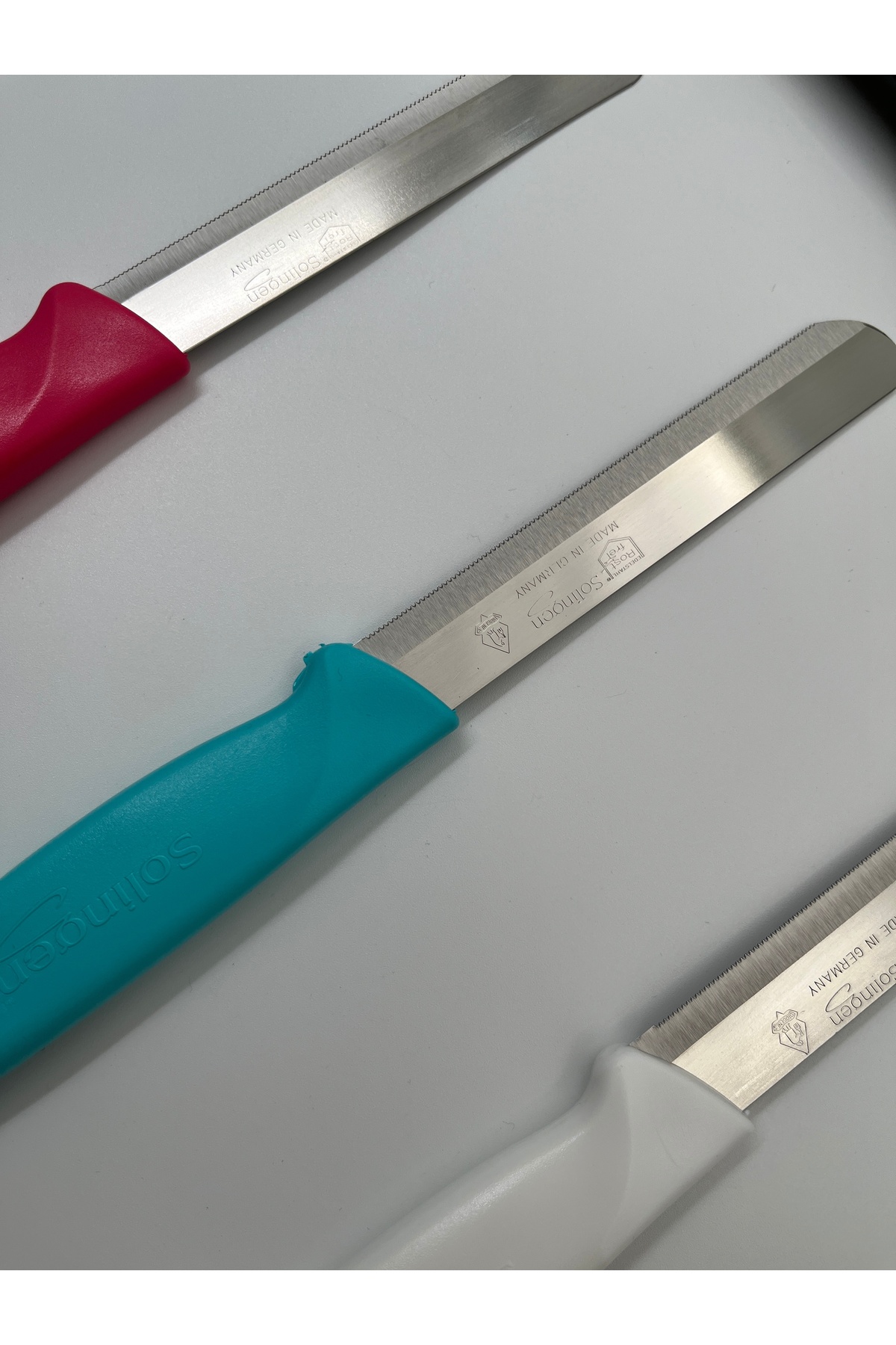 🔪 Product Features: • Brand: Solingen • Knife Type: Serrated Cut • Size: 22 cm (including handle) • Material: High quality stainless steel • Handle Colors: Turquoise, White, Yellow, Green, Red, Purple, Navy Blue, Black, Pink • Comfortable grip with ergonomic handle design • Long-lasting, does not lose its sharpness easily ✨ Uses: Superior performance in bread, tomatoes, vegetables, fruits and all kitchen works.