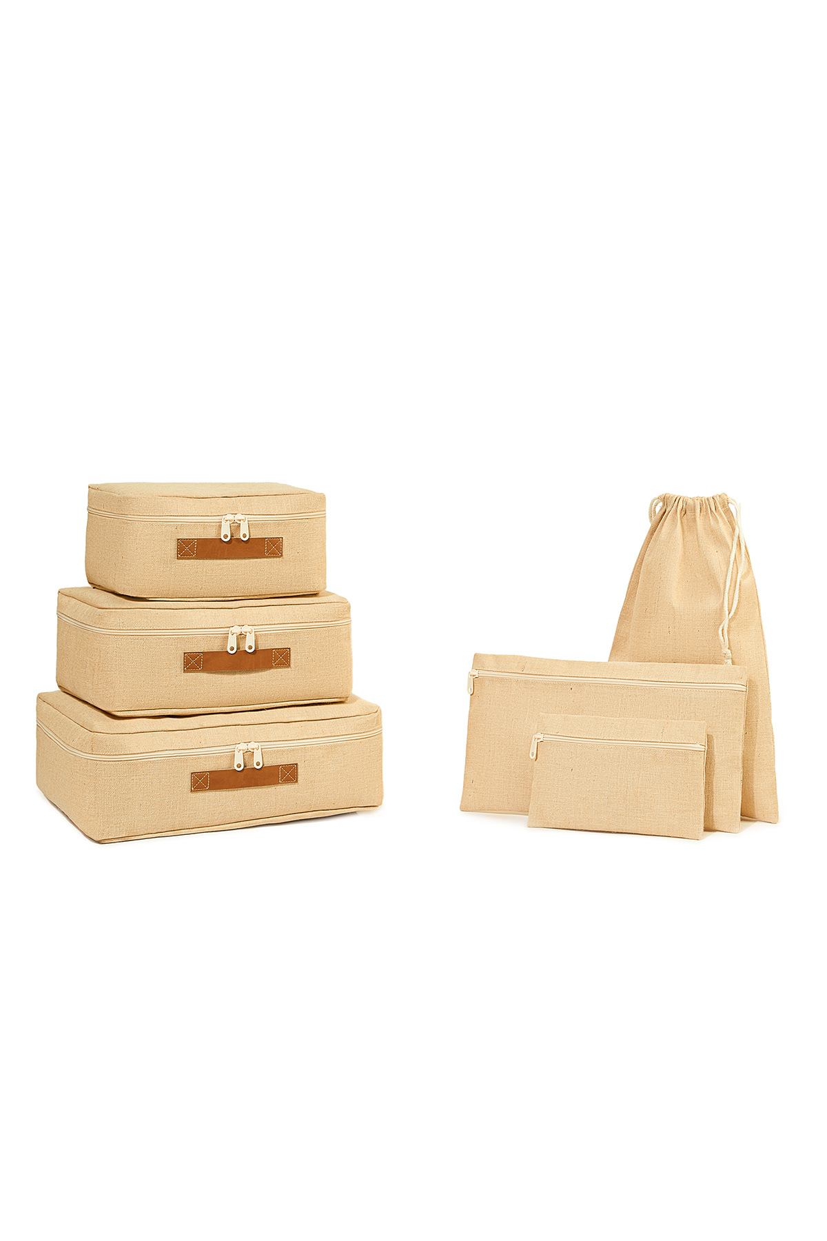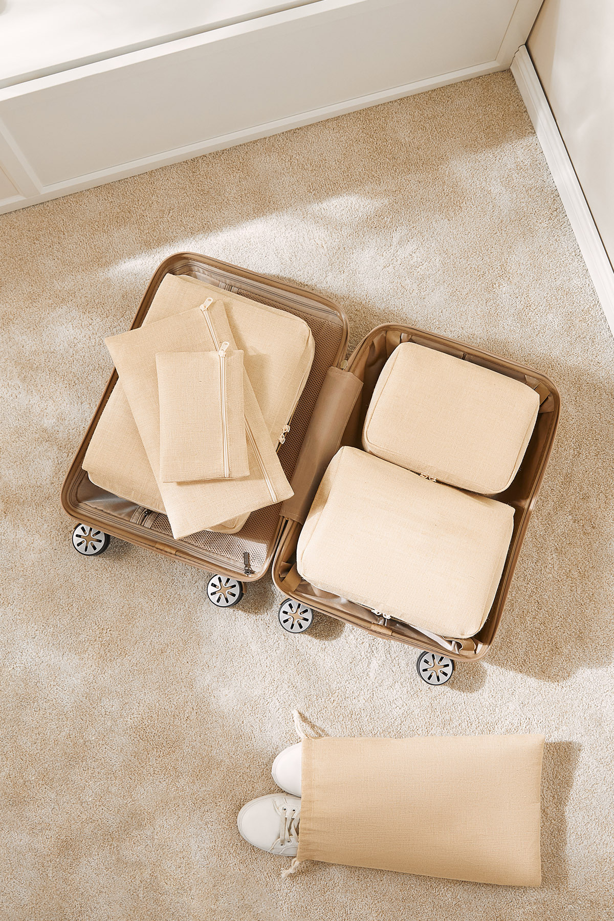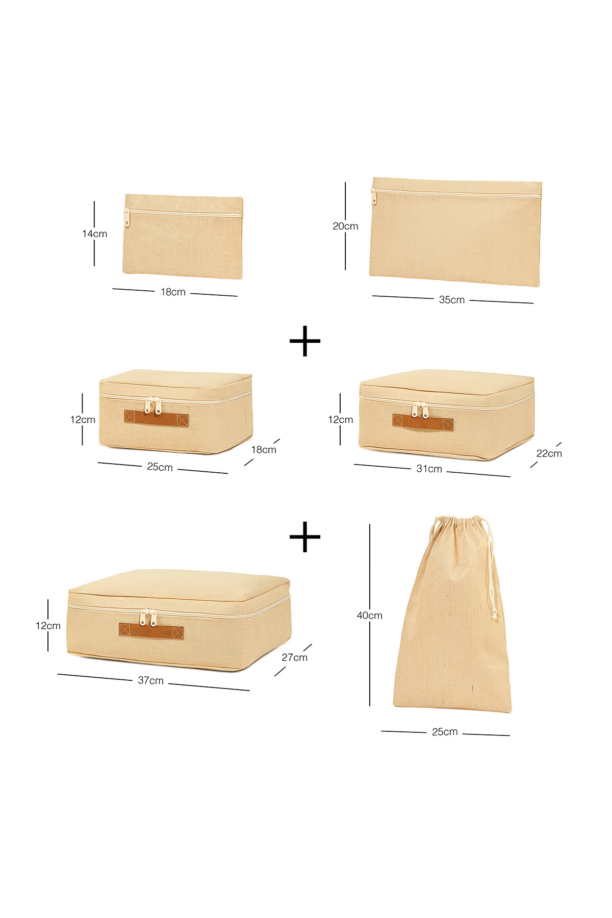 6 Pieces Natural Color Organizer in Suitcase 1 Piece Organizer Size: 18 x 14 cm (width x height) 1 Piece Organizer Size: 35 x 20 cm (width x height) 1 Piece Shirred Storage Bag Size: 25 x 40 cm (width x height) 1 Piece Organizer Size: 25 x 18 x 12 cm (width x depth x height) Volume: 5 L1 Small Size Organizer Size: 31 x 22 x 12 cm (width x depth x height) Volume: 8 L1 Medium Size Organizer Size: 37 x 27 x 12 cm (width x depth x height) Volume: 16 L