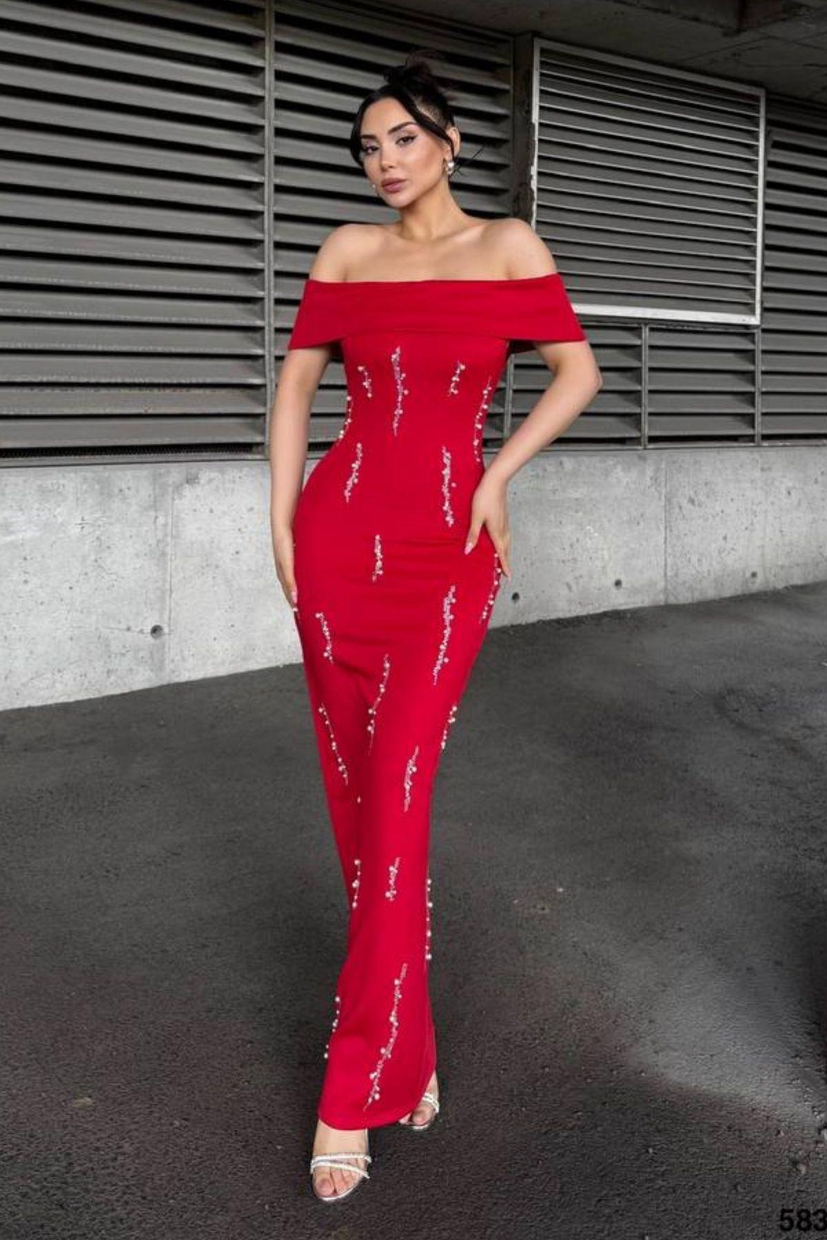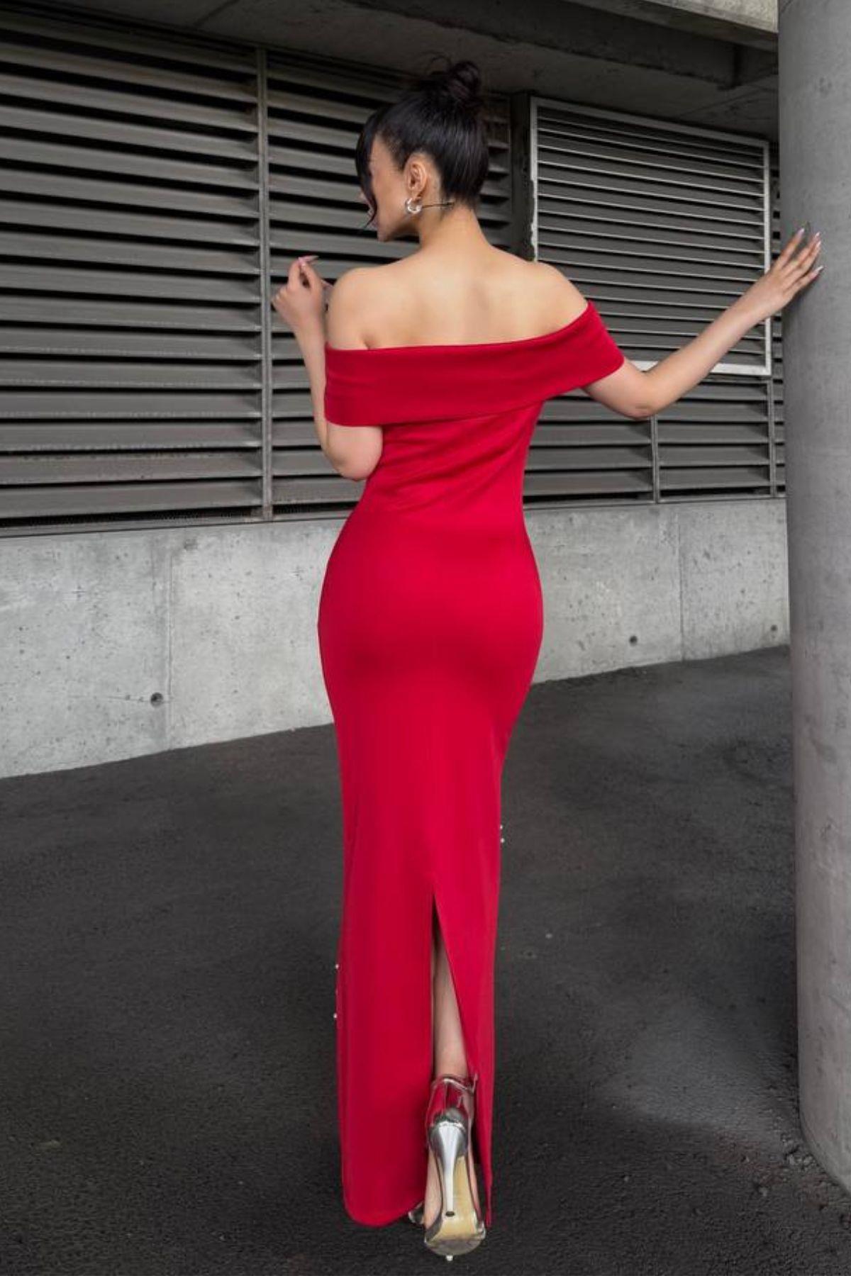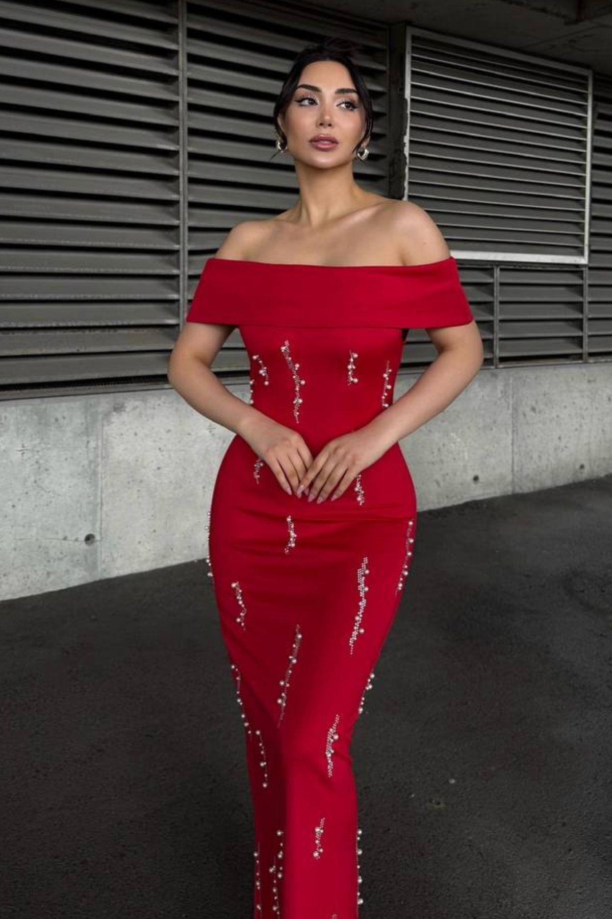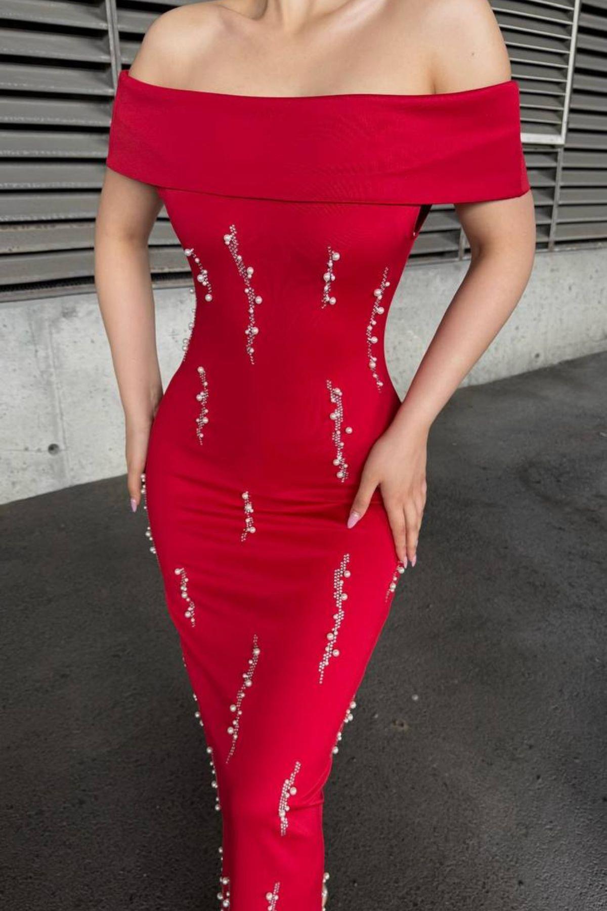 Modafeminen Stone Detailed Strapless Collar Scuba Fabric Dress Red 583241 | ByTR