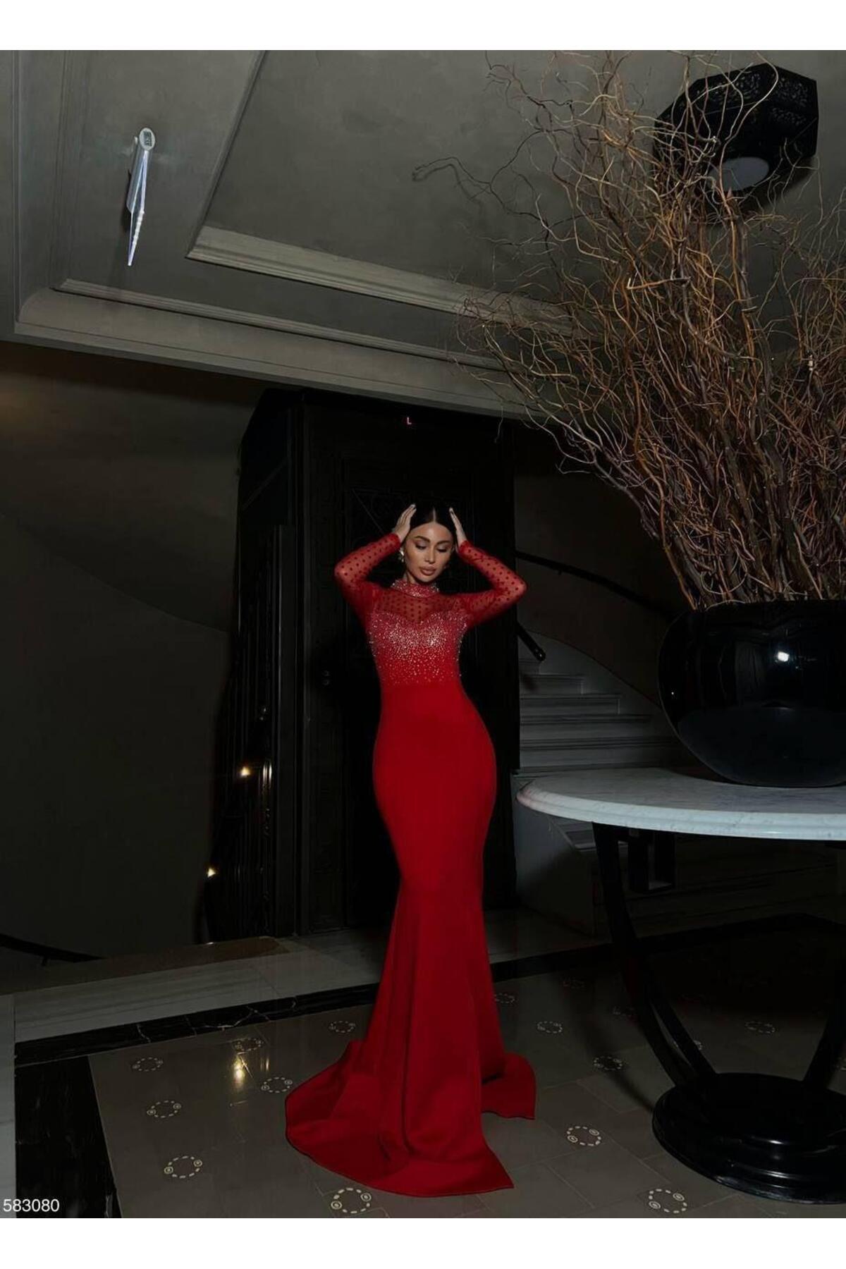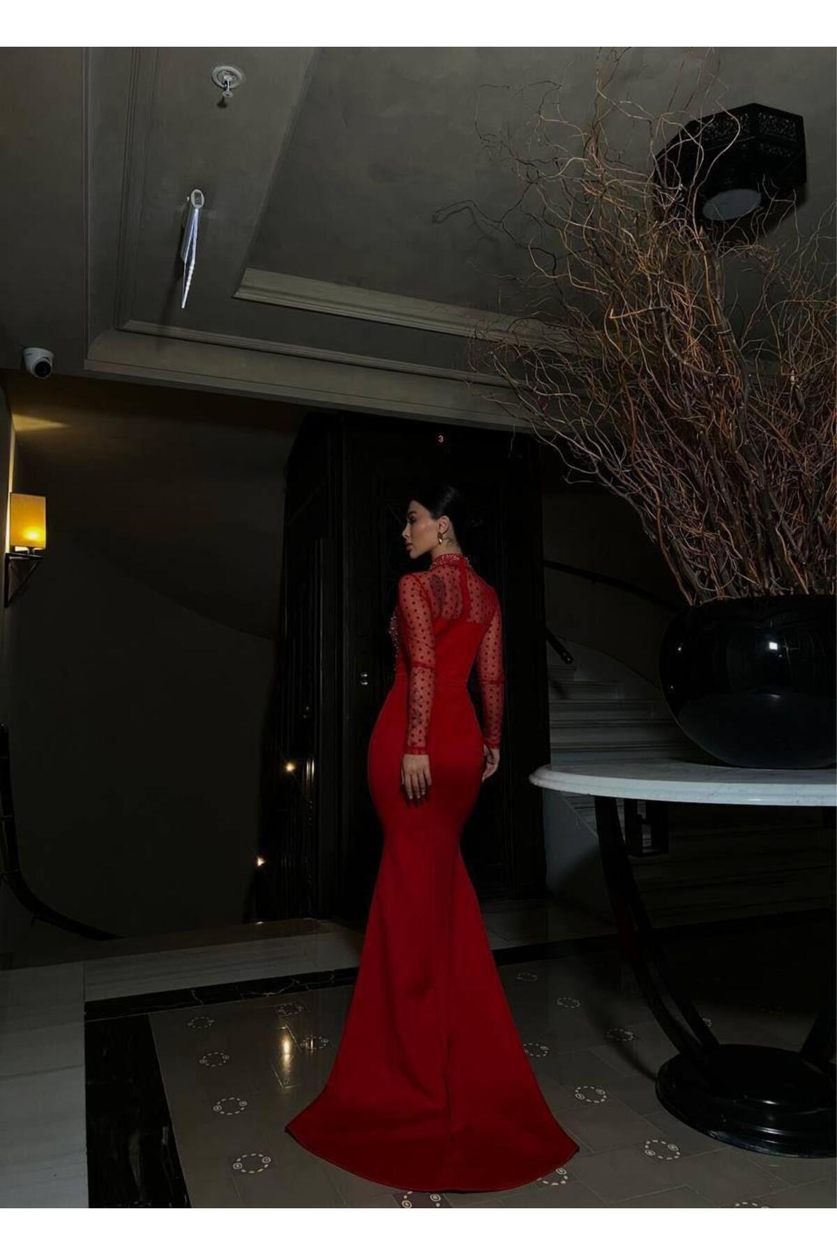 Modafeminen Asra Tulle Detail Shimmering Evening Dress Red 583080 | ByTR