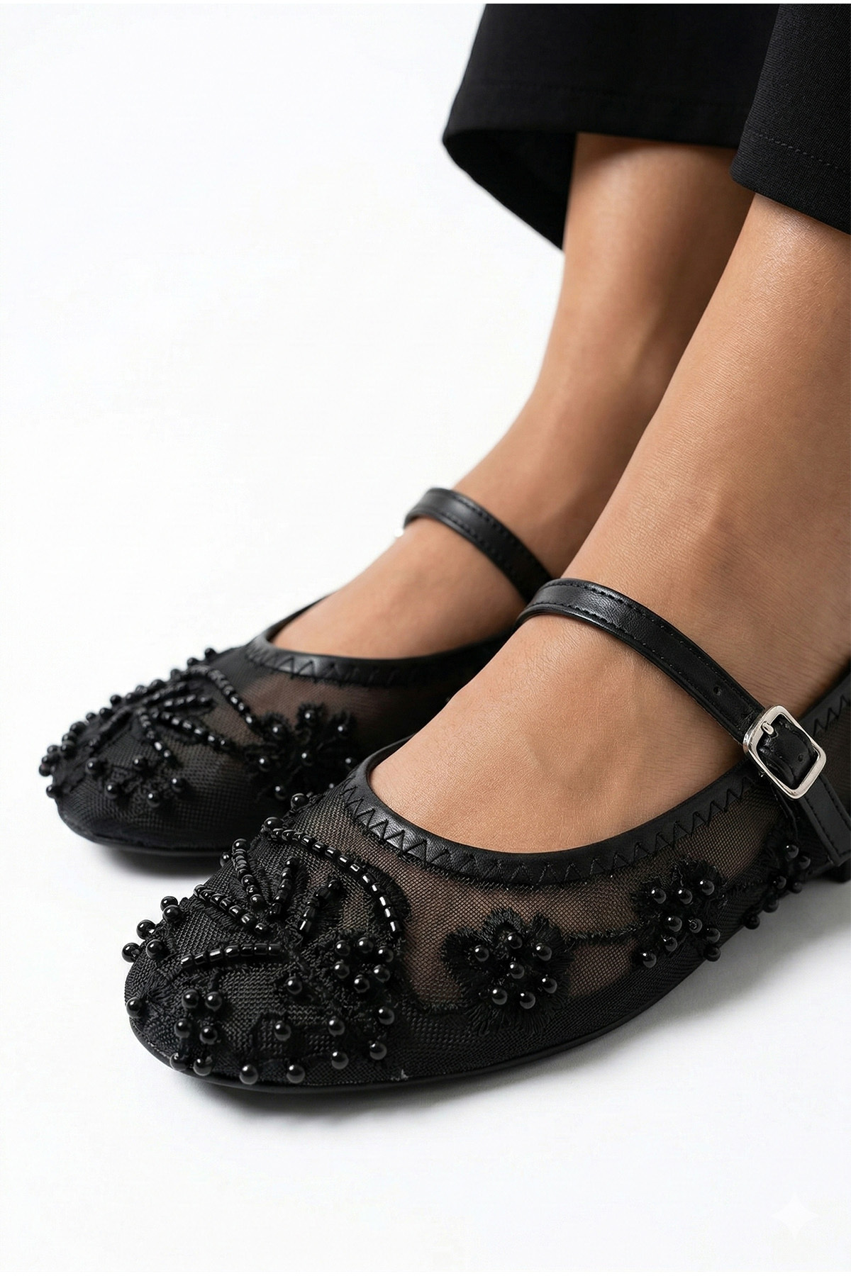 Black Pearl Mesh Embroidery Detailed Round Nose Luxury Stylish Orthopedic Lightweight Sole Women Flats Dice