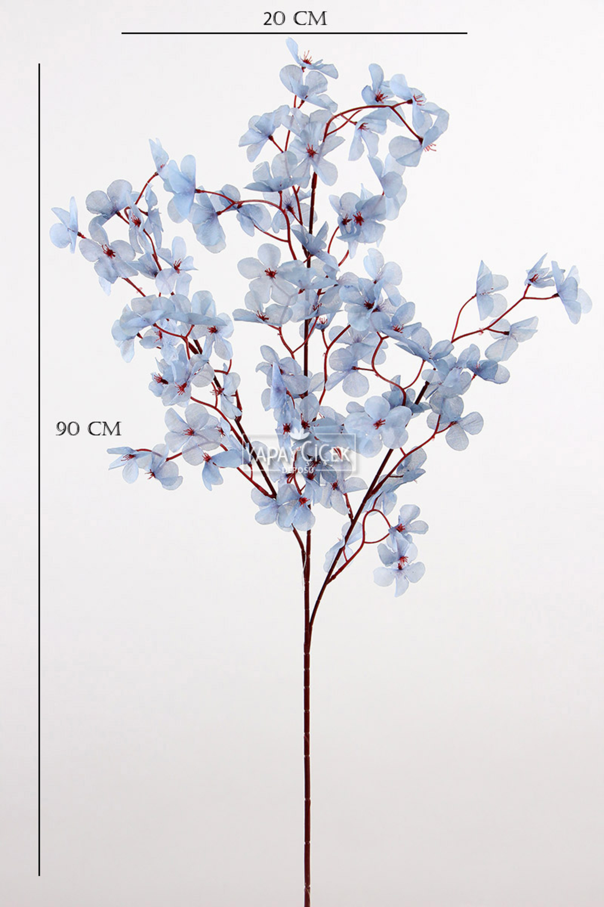 Long branch height: 90 cm (Stem part 30 cm) Diameter length for long branch: 20 cm 1 flower diameter: 3 cm Artificial Cherry Blossom Branch adds elegance to the environment with its 90 cm length and thin red branches.