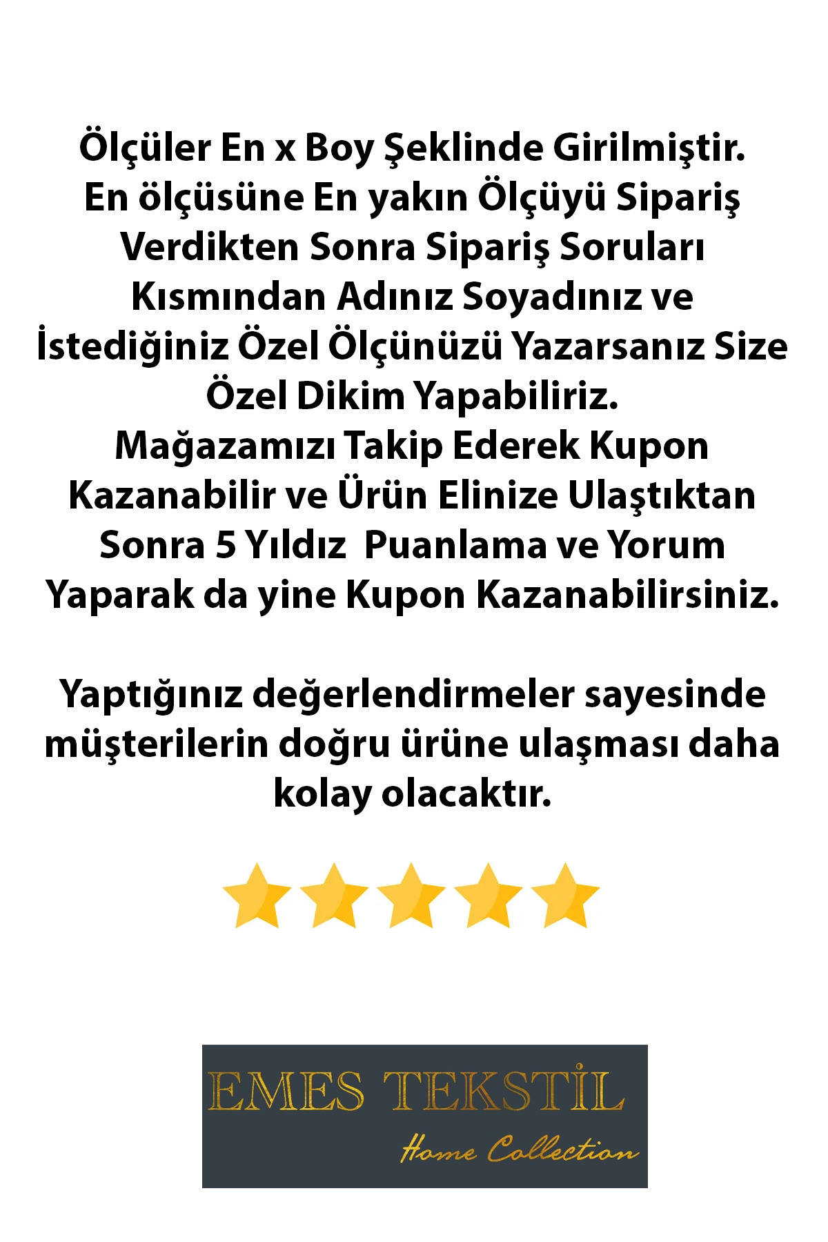 After receiving your order and being satisfied, if you make a 5-star product review and a 5-star seller review, you will receive a 150 TL coupon to use on your next purchase.
