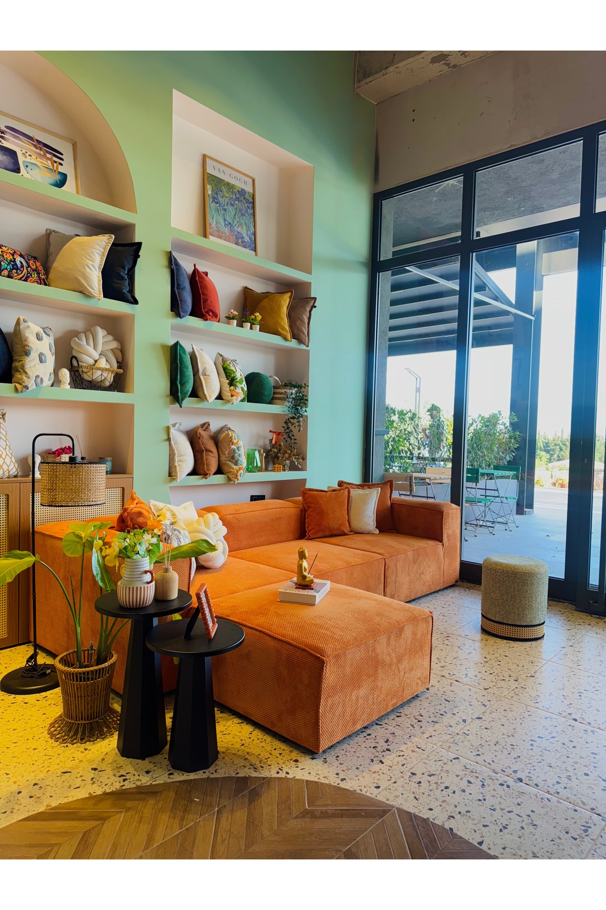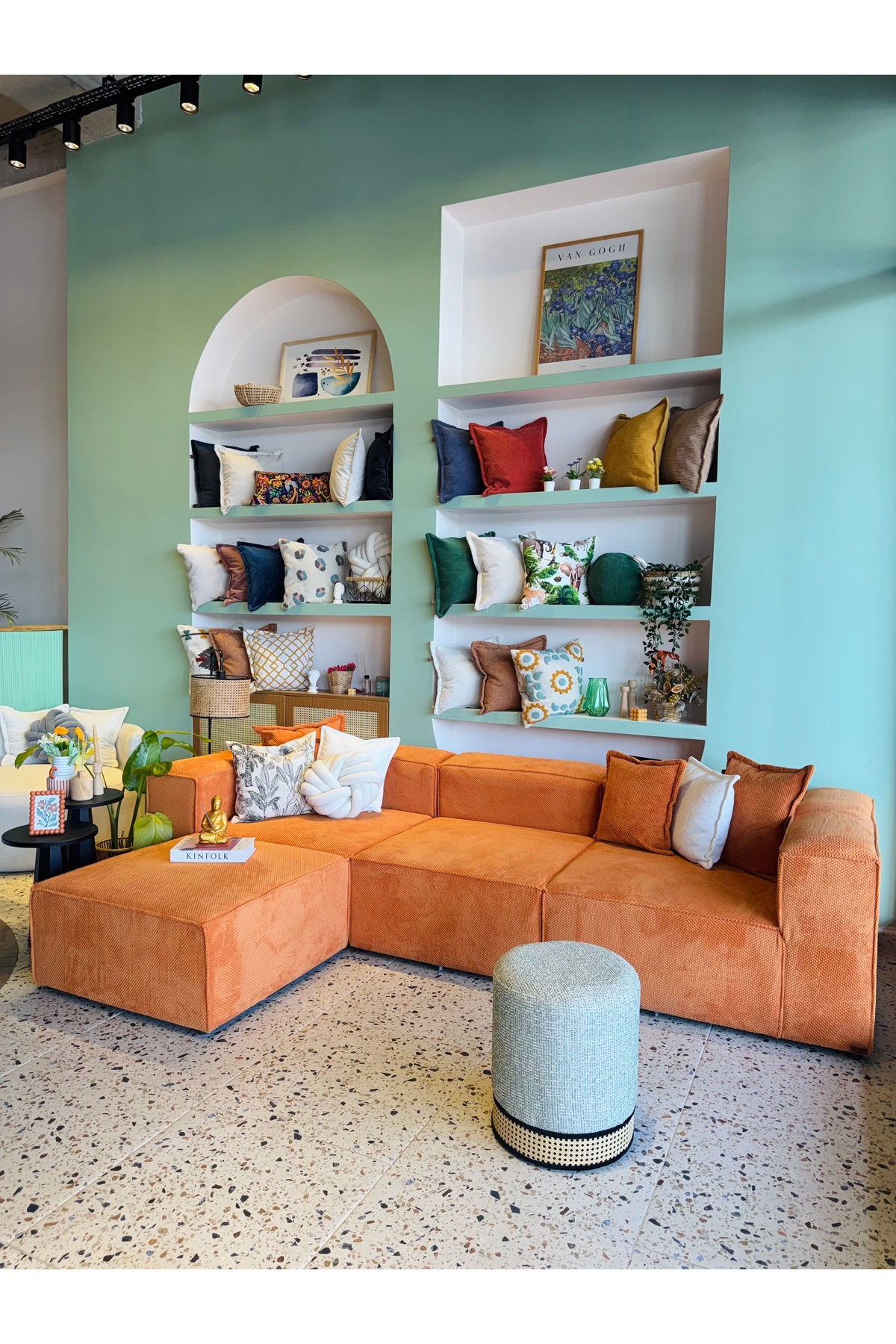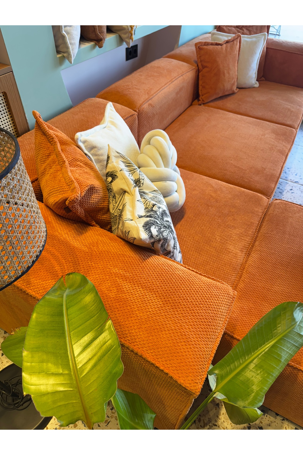Frida 4 Modul Pofidik Modular Sofa Set, which adds elegance to the decoration of your home with its modern design, creates an eye-catching atmosphere with its textured velvet orange color.