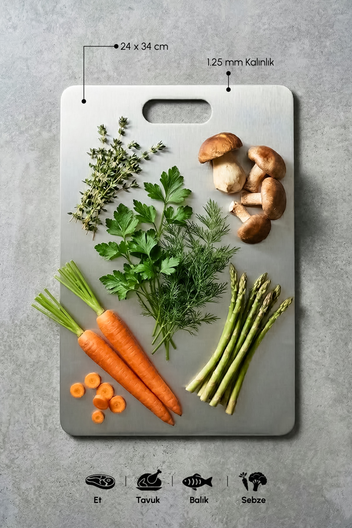Perotti Cutmate Stainless Steel Cutting Board Set , Hygienic Surface, Machine Washable -Product Size:24x34 cm - Wall Thickness:1.25 mm - Meet the Perotti Cutmate Cutting Board Set, which offers a hygienic, durable and practical kitchen experience! Highlights: - 100% stainless steel body - and hygienic surface - Suitable for dishwasher - Safe to use thanks to non-slip silicone feet - Ideal structure for cutting meat, vegetables, fruits -Caution: There may be scratches on the steel surface
