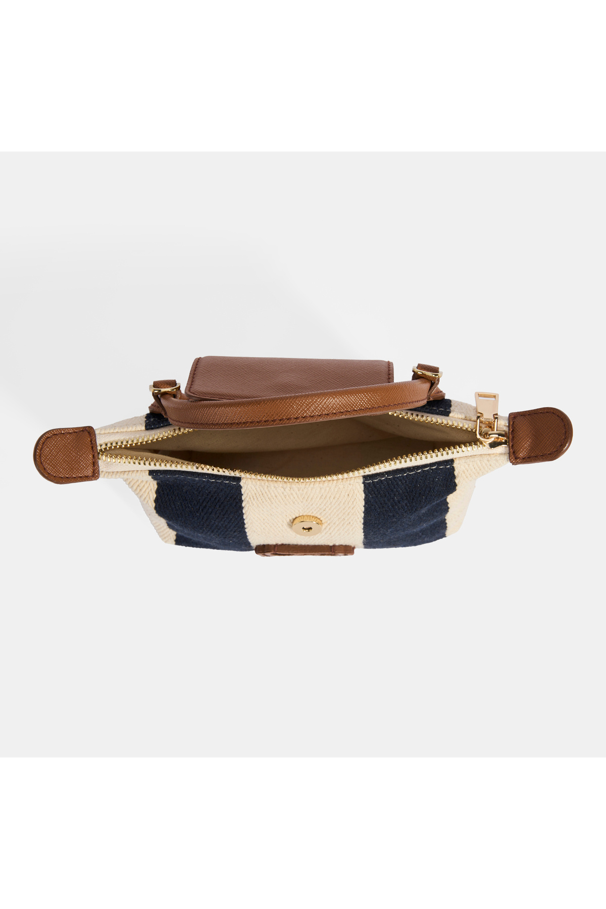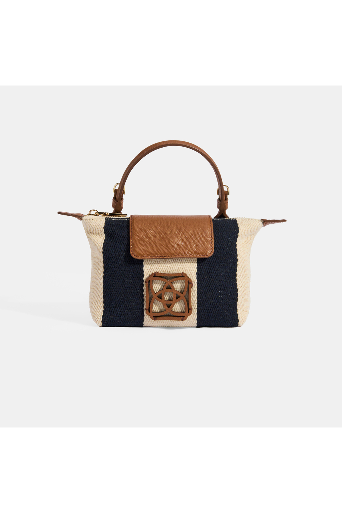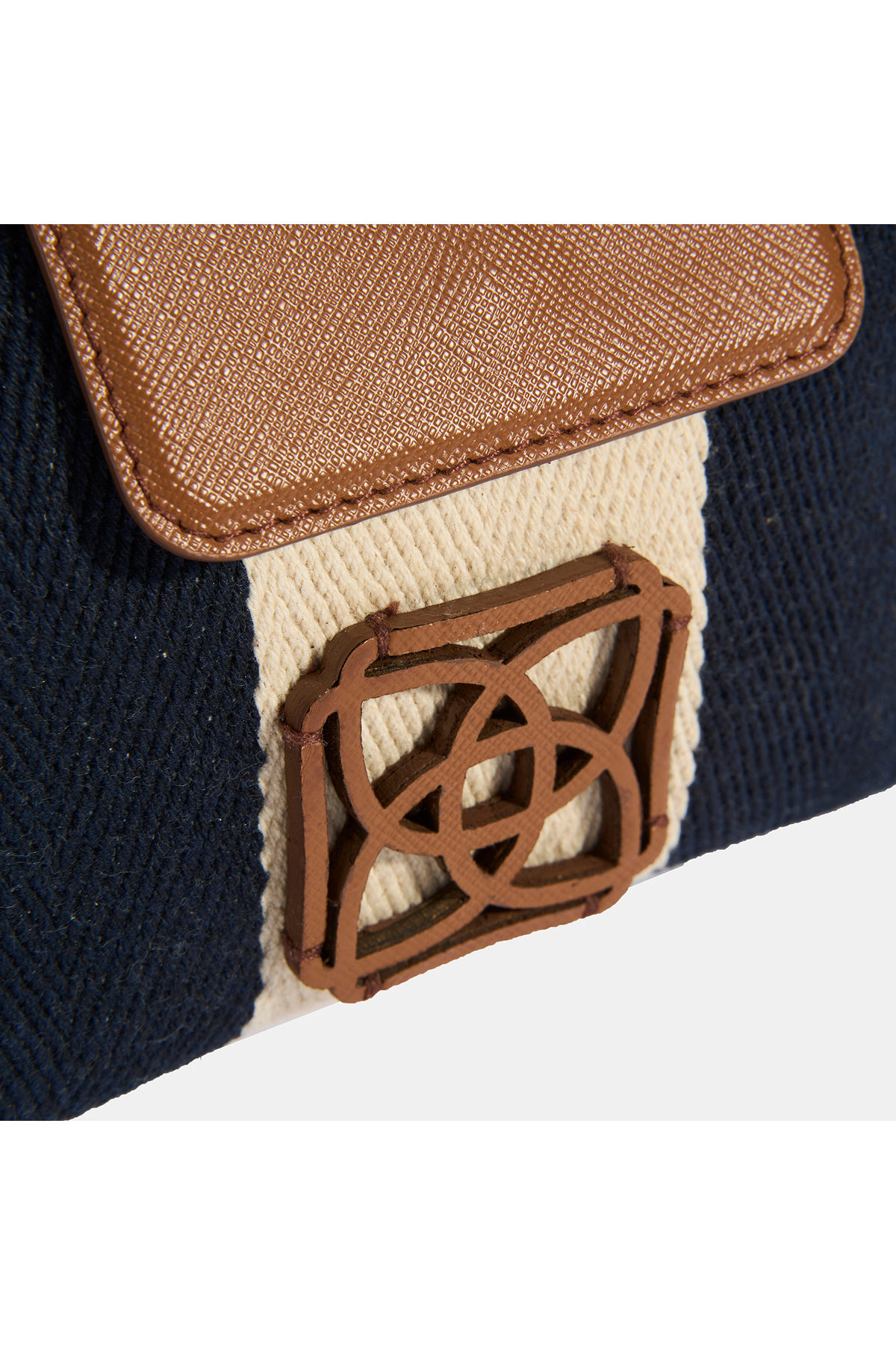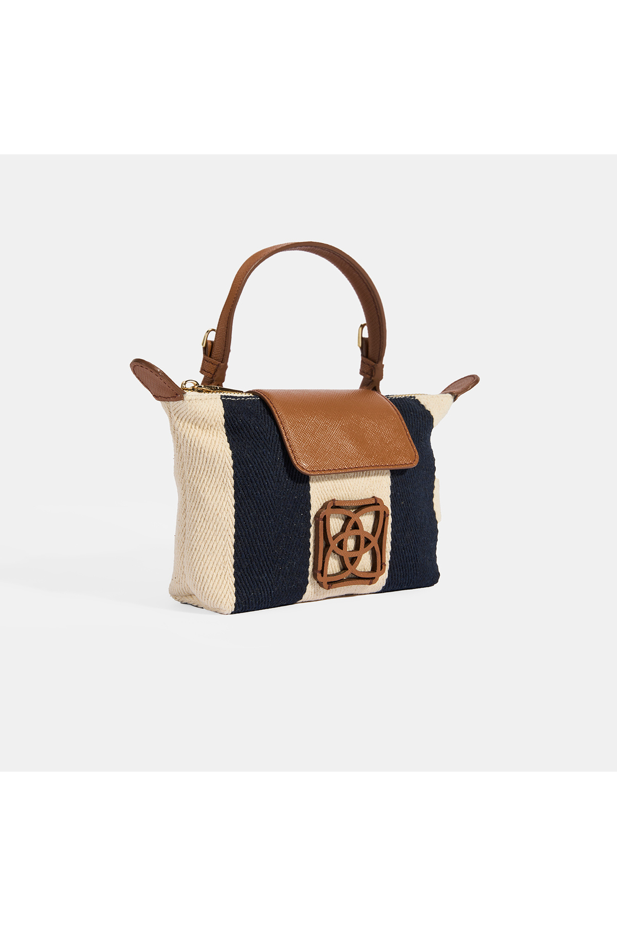 The handbag, which is made of navy blue striped fabric, is completed with a tan colored cover and hanger.