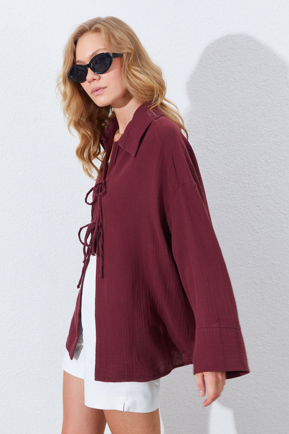 Muslin Natural Cotton Tied Kimono Shirt | Burgundy MKS161023-01 - Attracting attention with its burgundy color, this kimono shirt offers both elegance and comfort together.