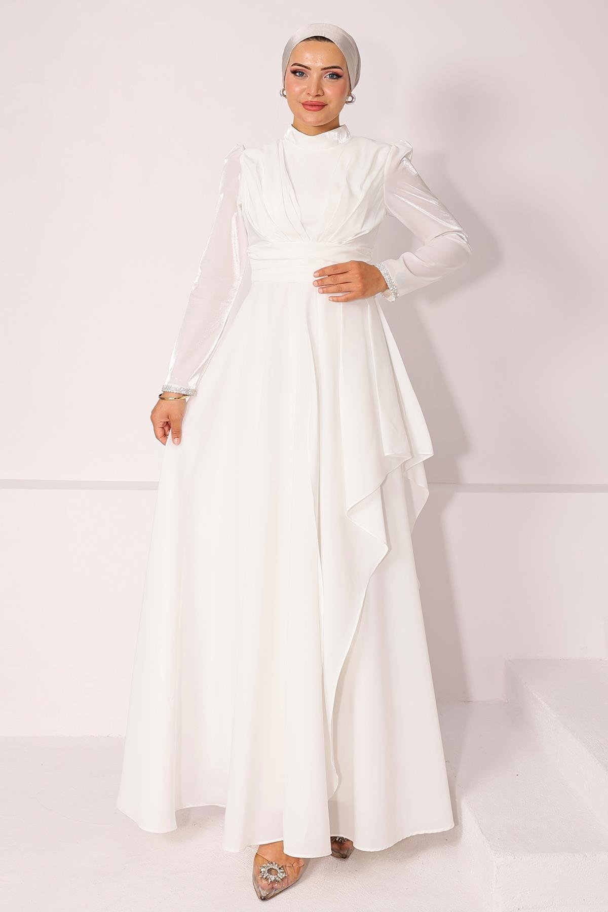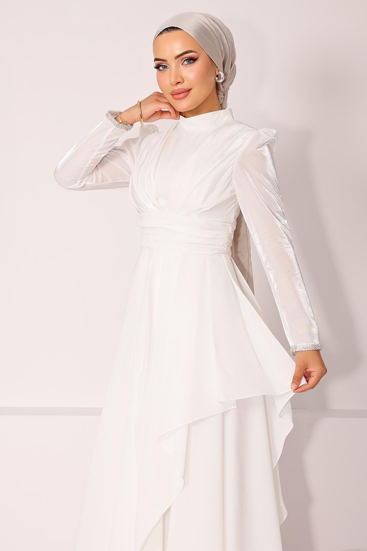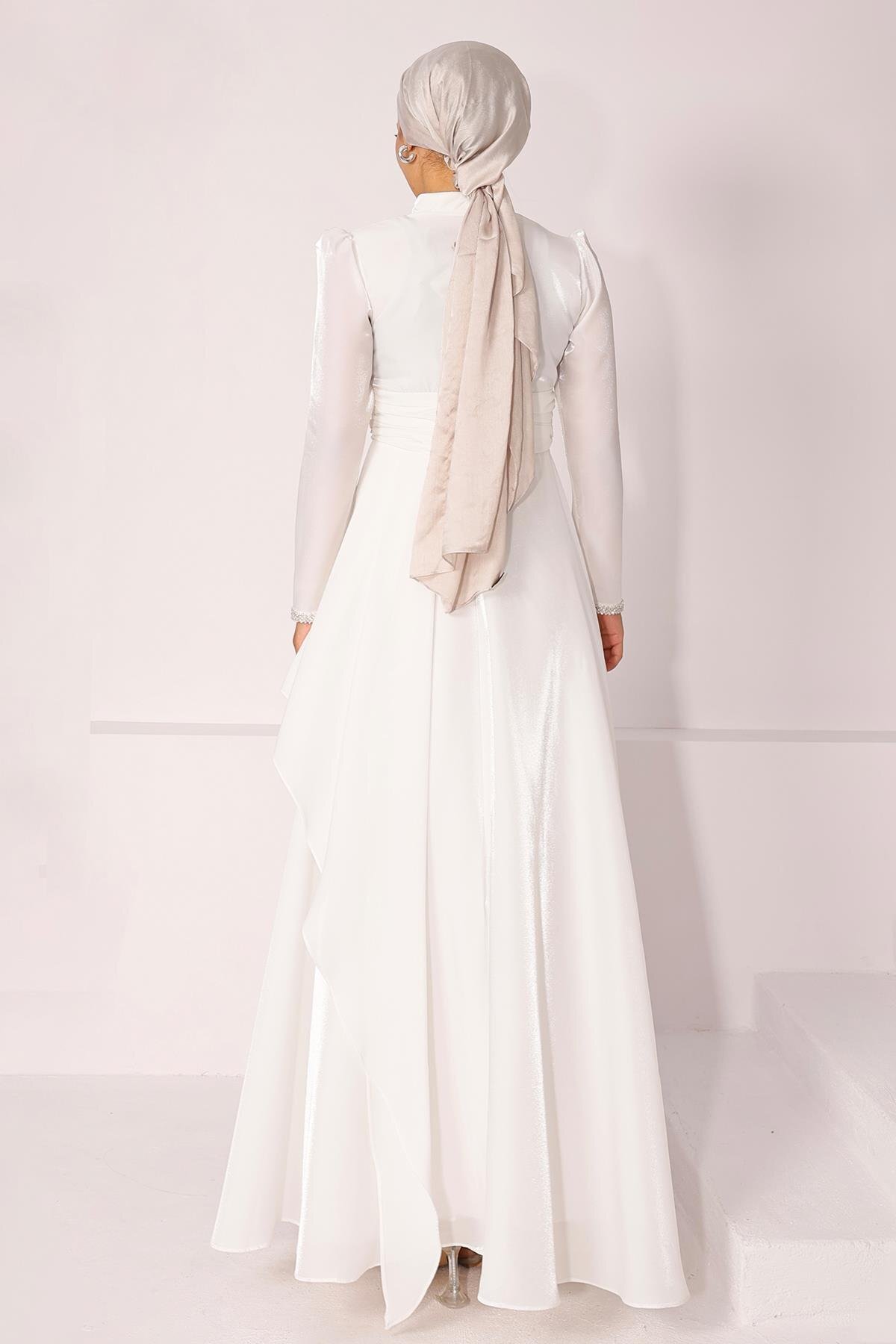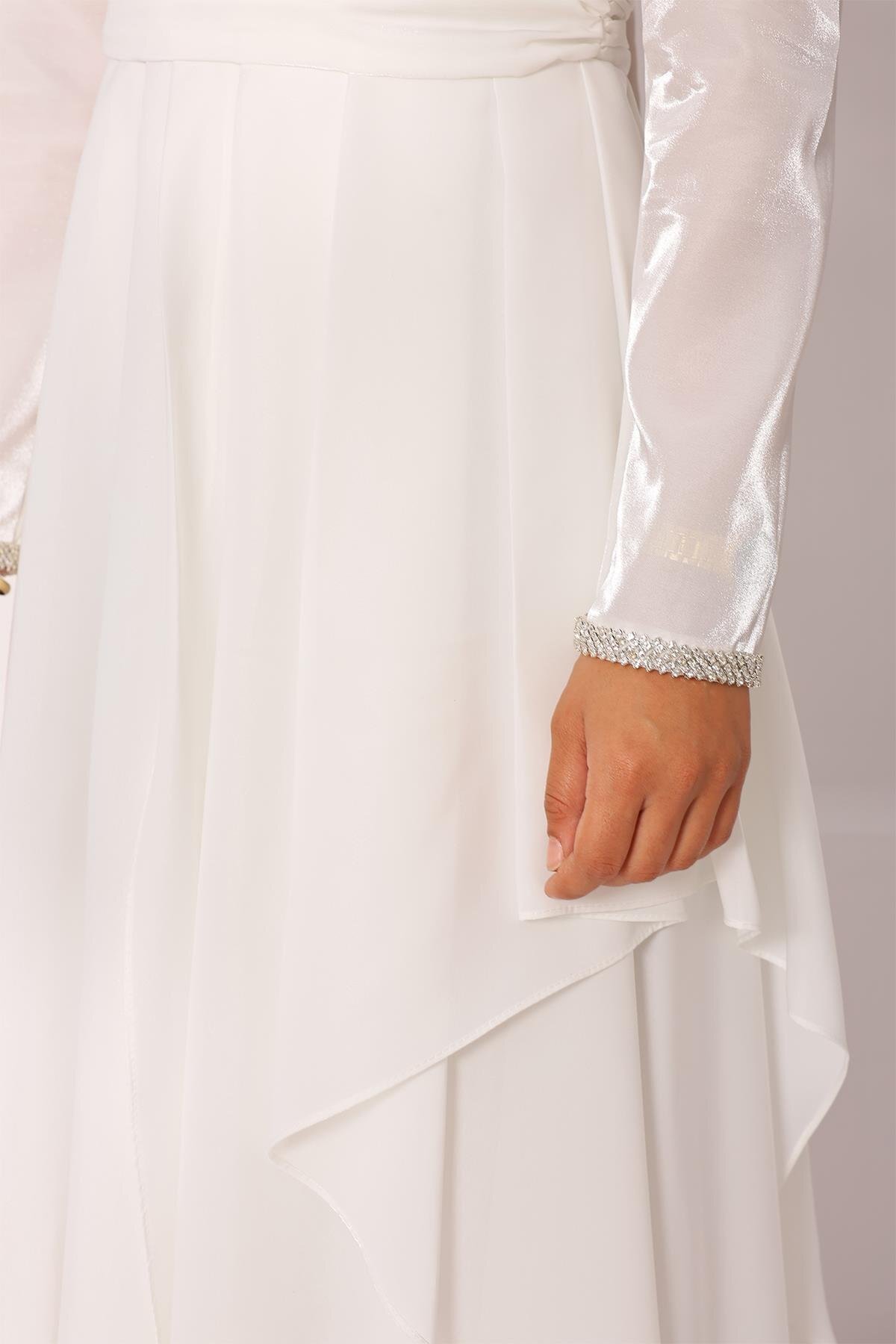 Olcay Sleeve Stone Embroidered Pleat and Flywheel Detailed Taffeta Satin Modest Evening Dress WHITE 1215 | ByTR