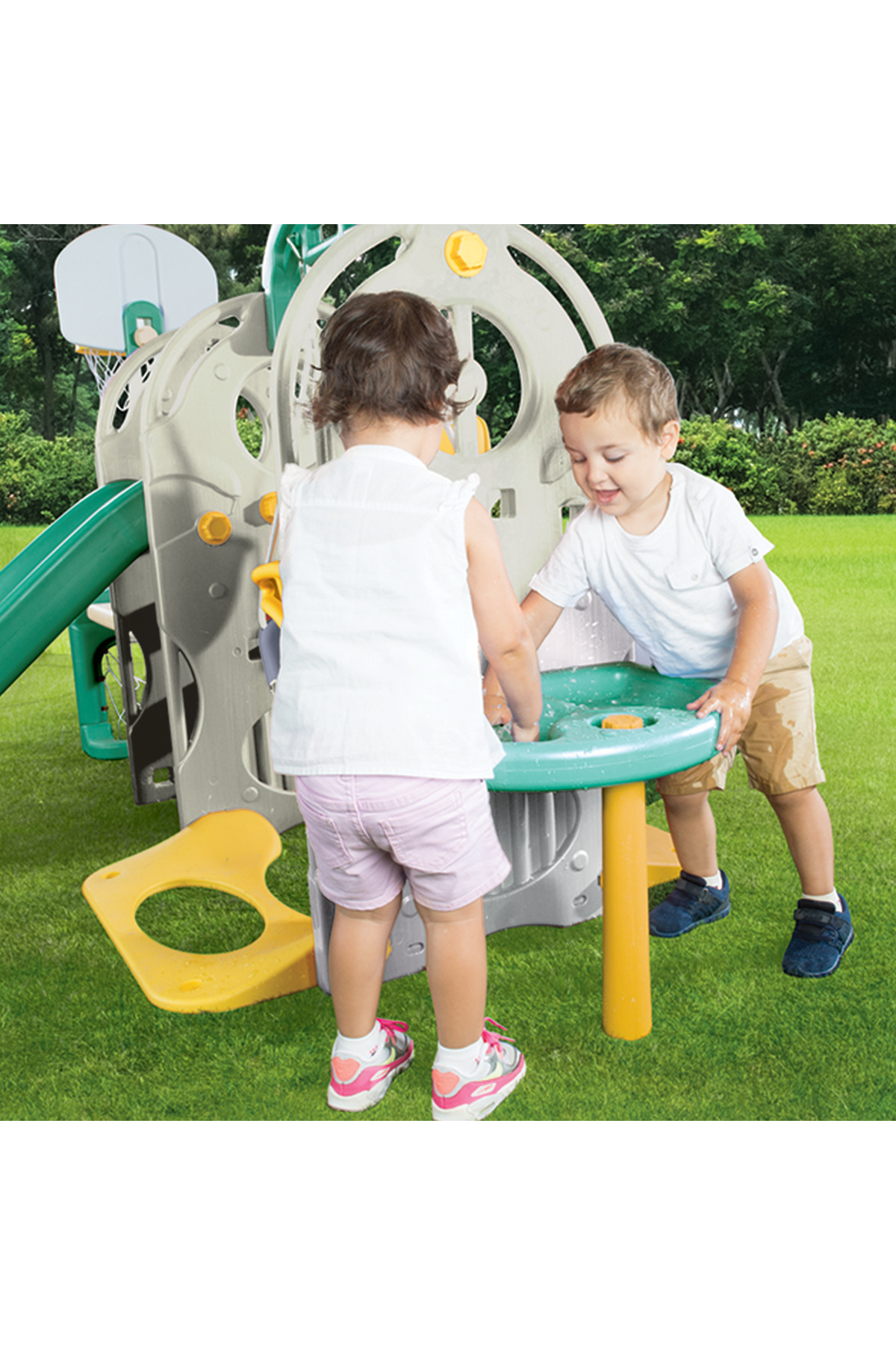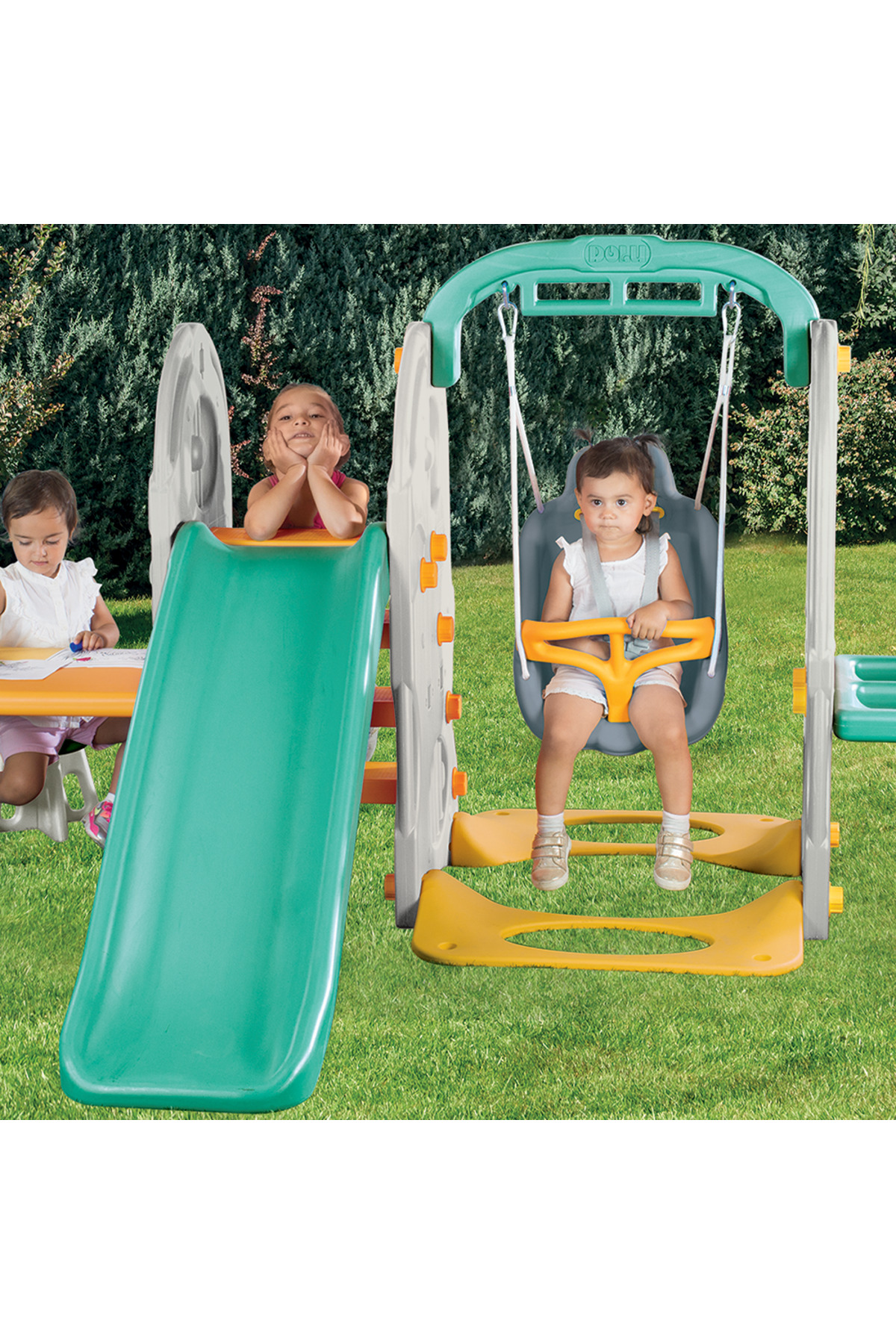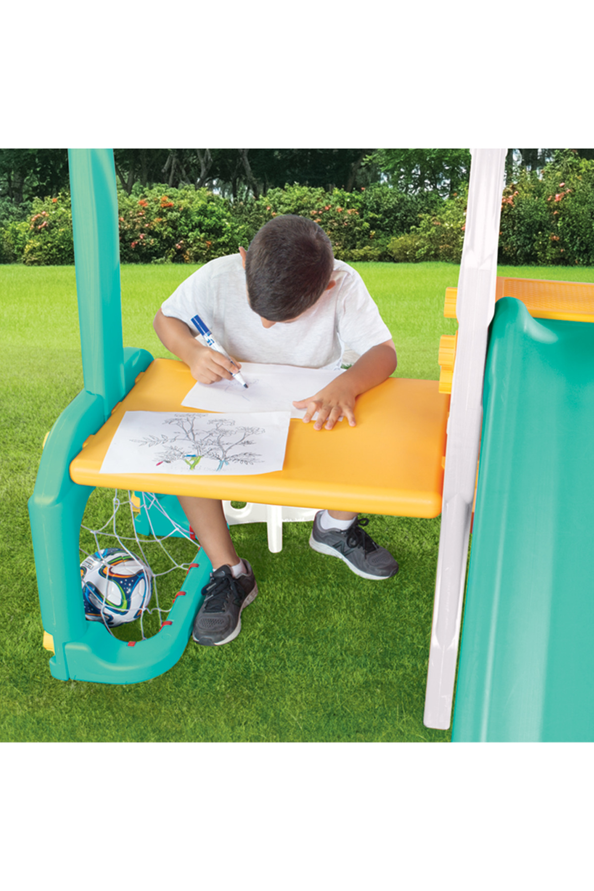 There is an activity table,pull-up, swing, slide , stool work table, basketball hoop and football castle. The slide location is 126 cm.