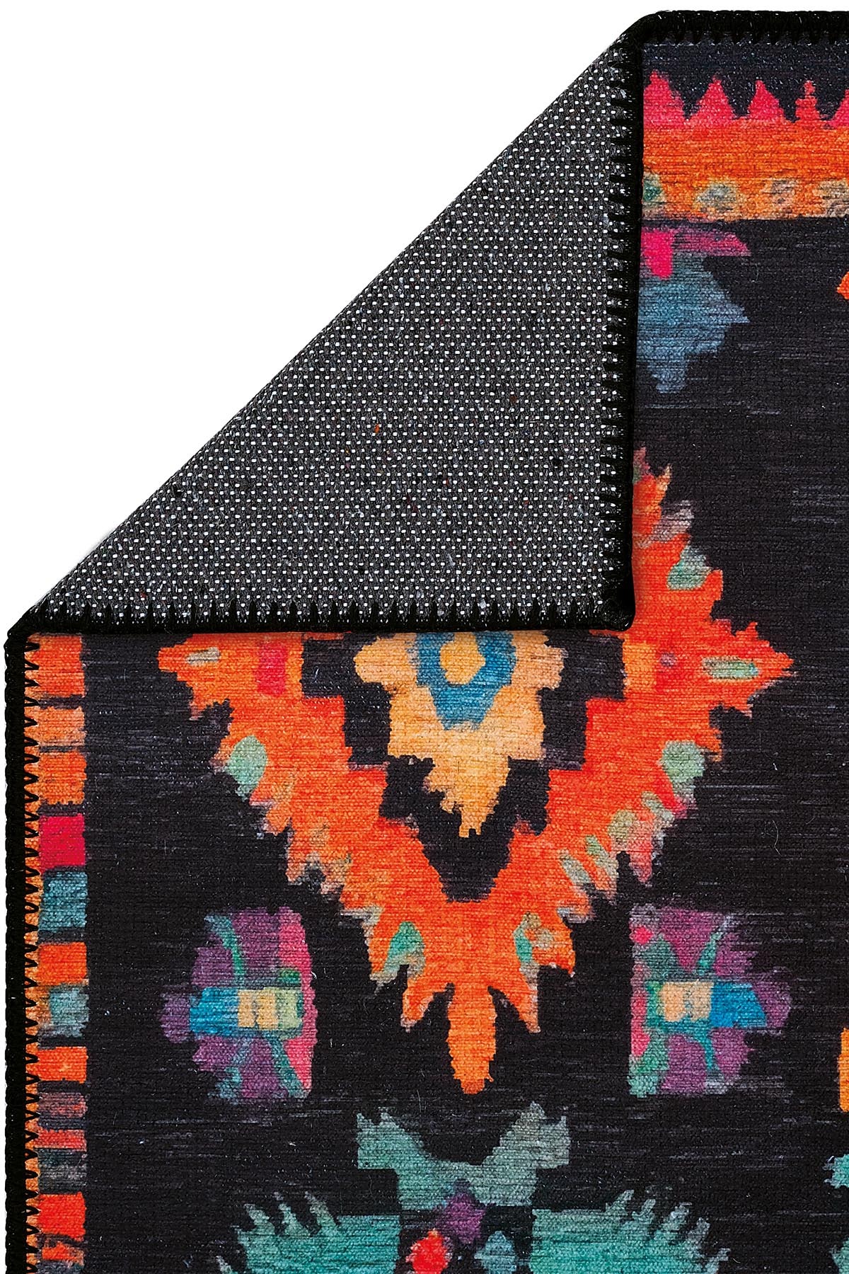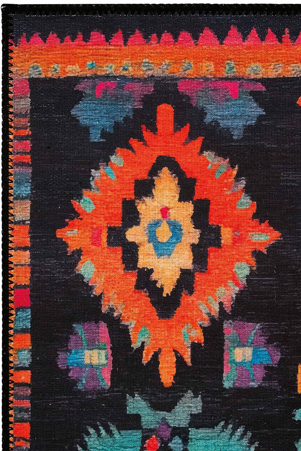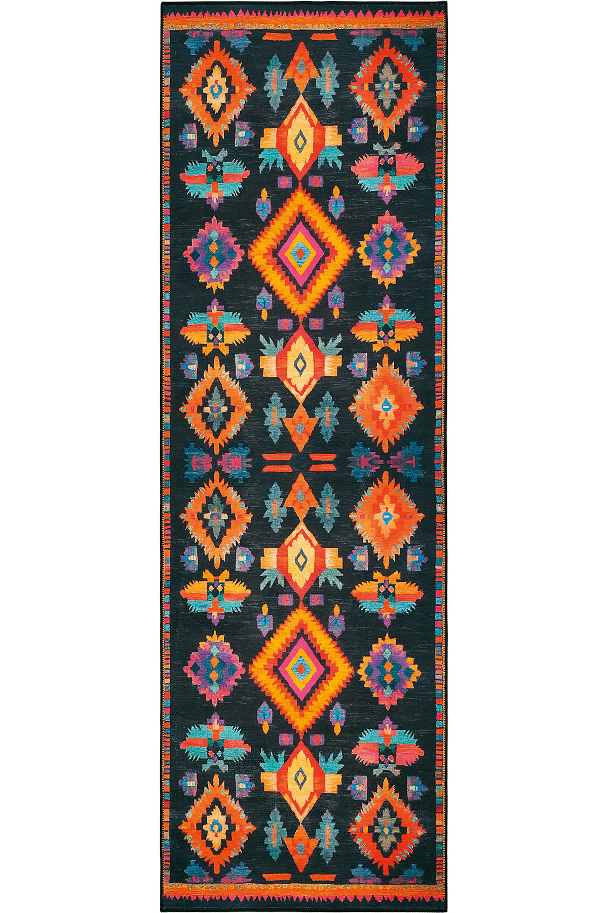 Product Description, Lumina LMN 310 Colorful Ethnic Patterned Runner with Black Backing – Modern Tasseled Woven Chenille, Washable Design.