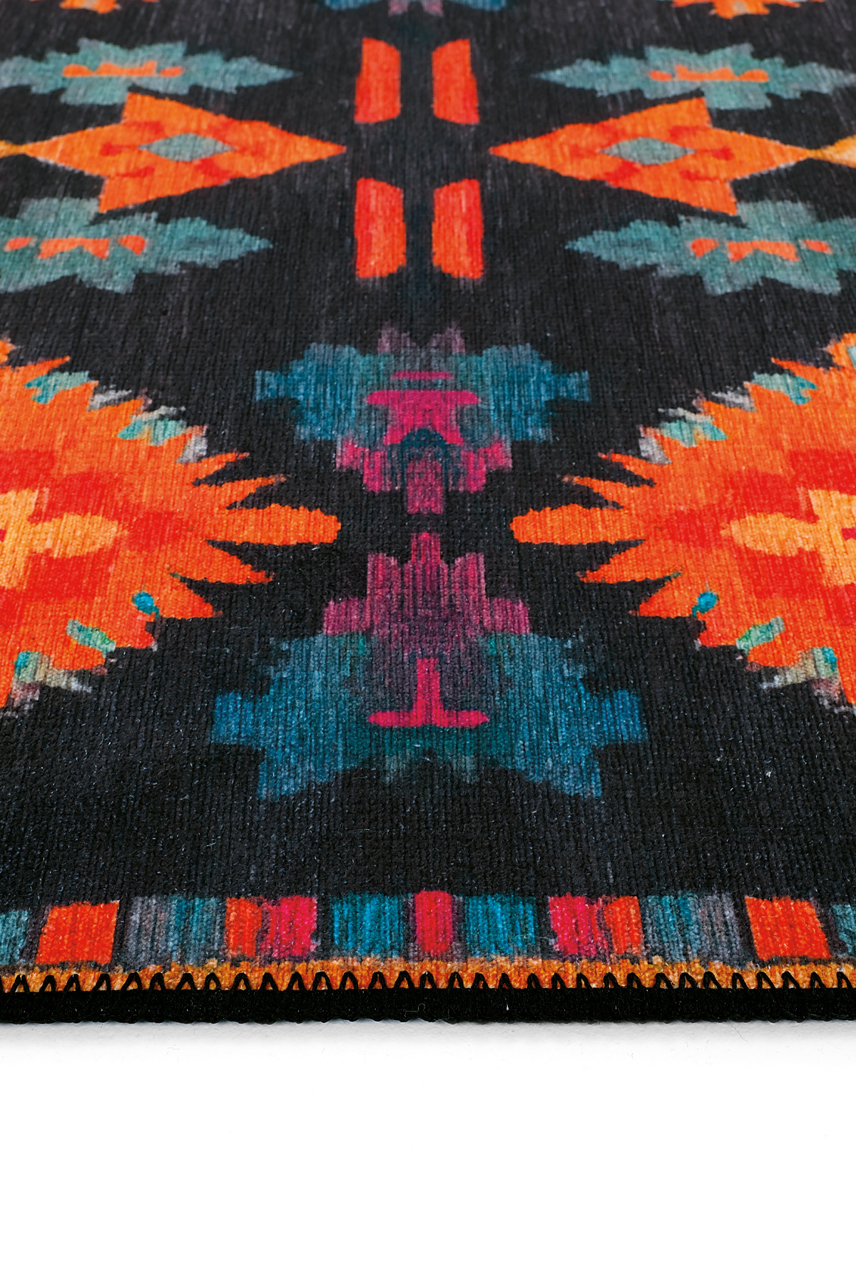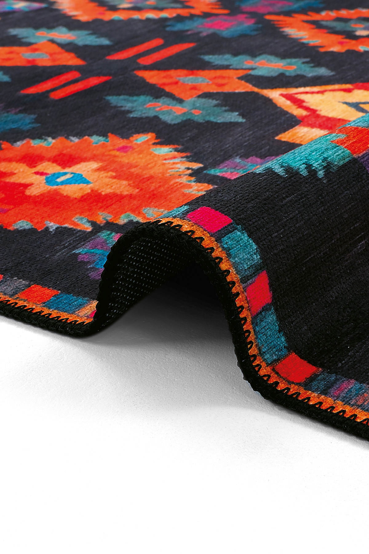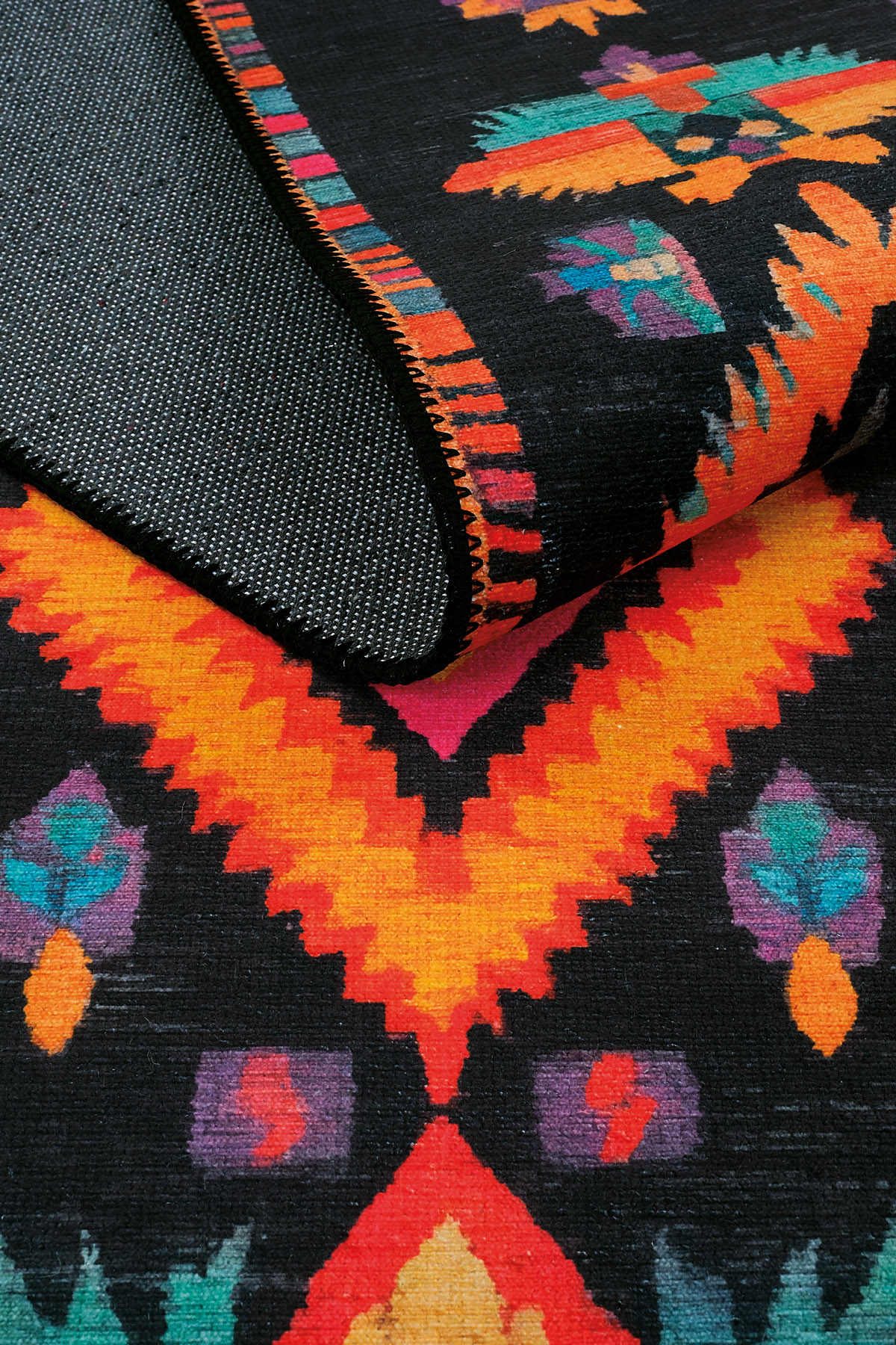 Product Description, Lumina LMN 310 Colorful Ethnic Patterned Runner with Black Backing – Modern Tasseled Woven Chenille, Washable Design.