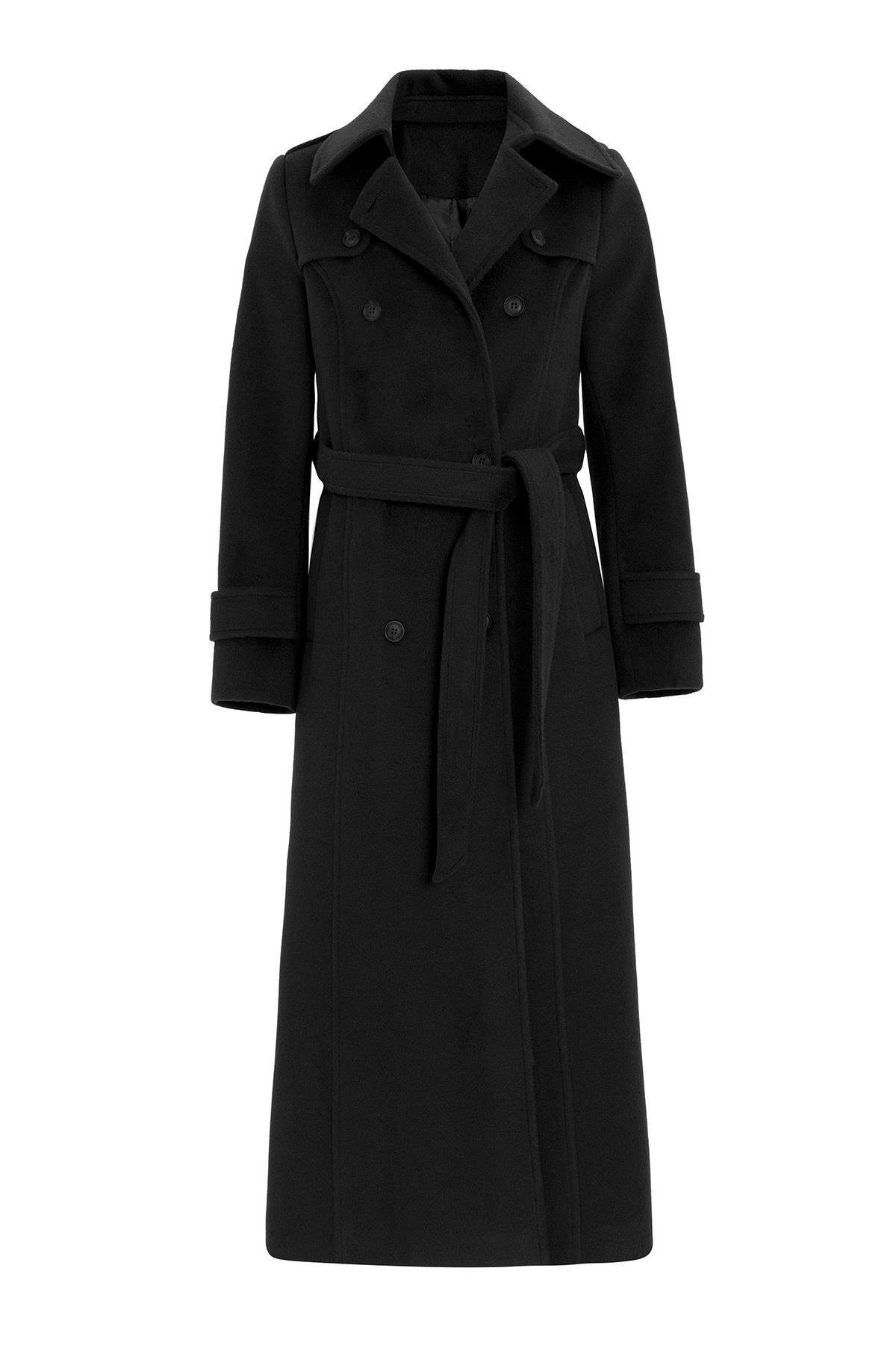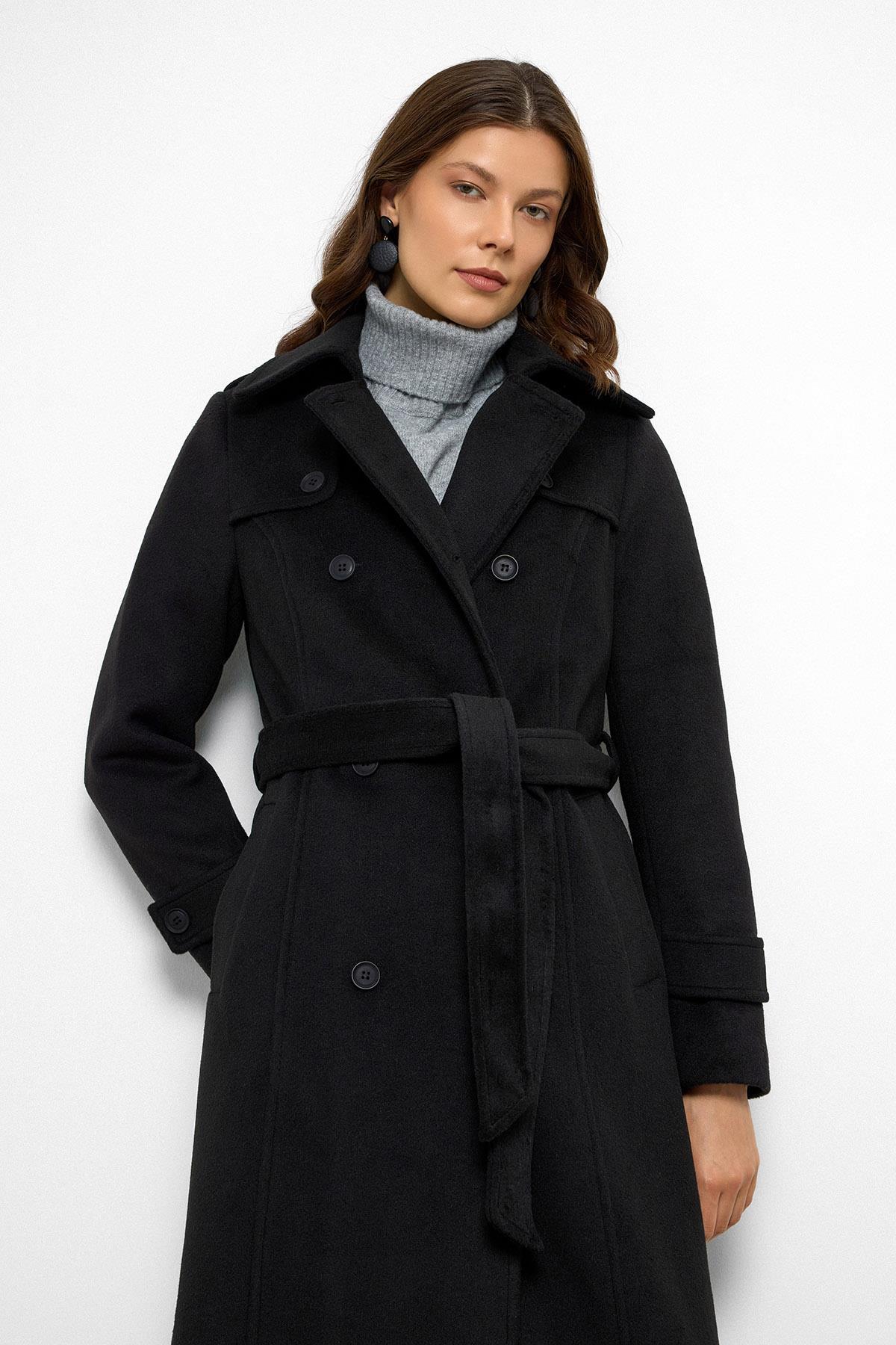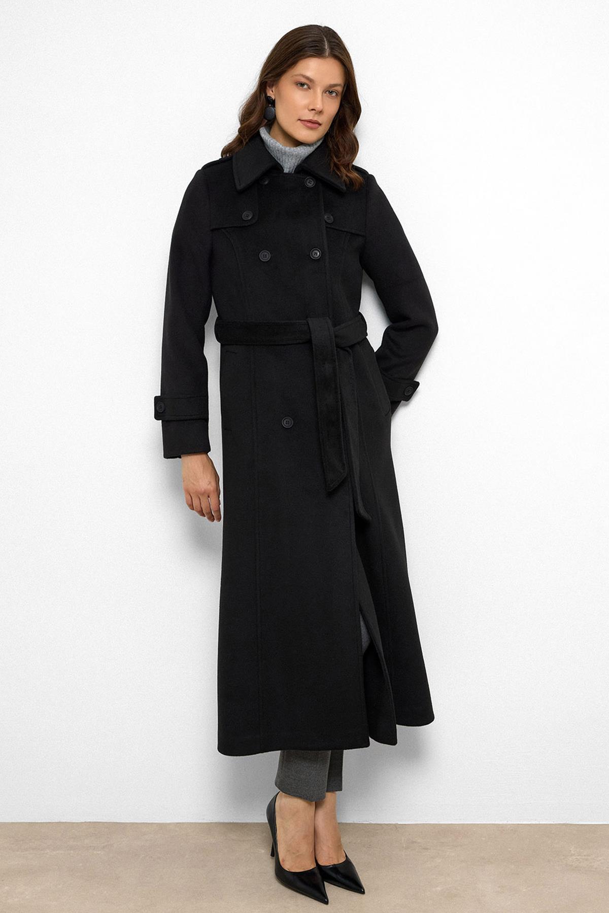Olcay Cape Detailed Double Breasted Long Coat BLACK 3087 | ByTR