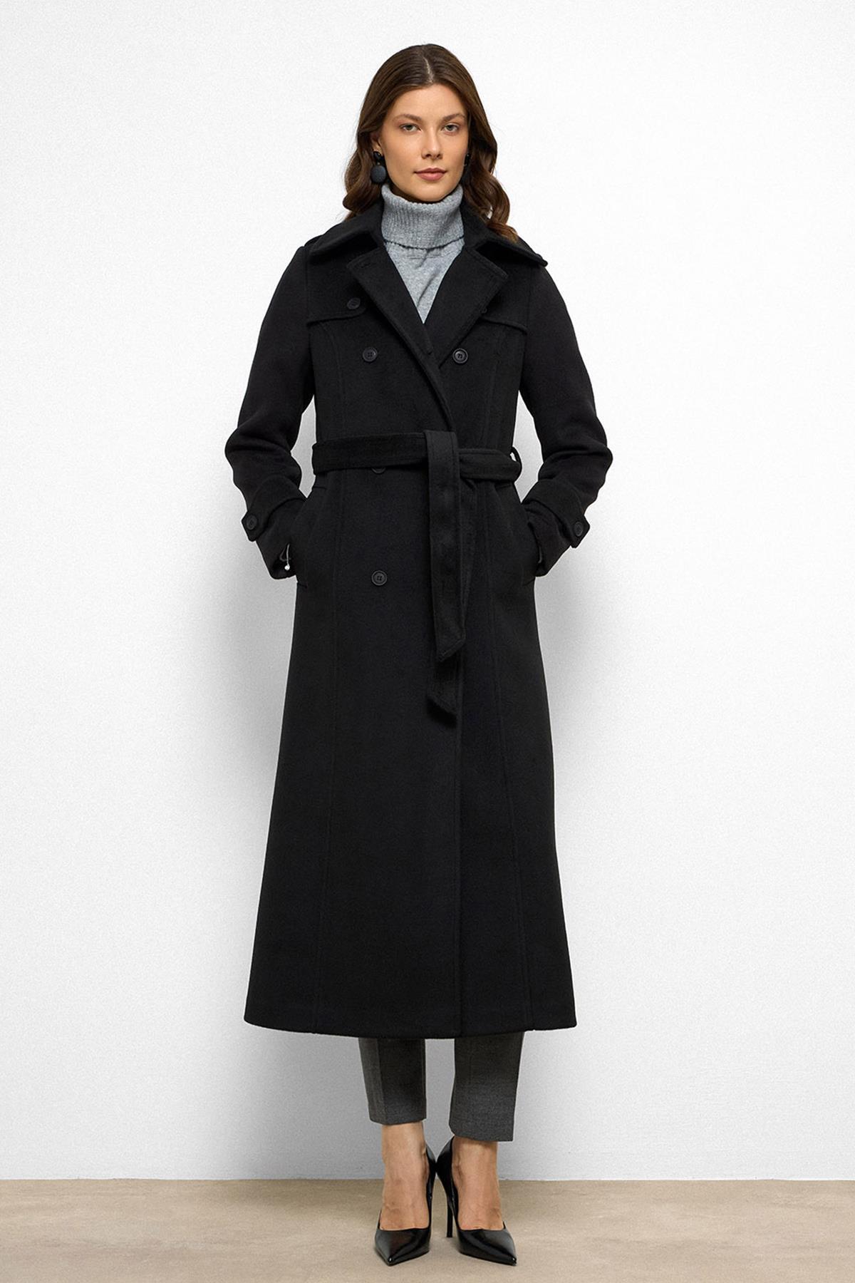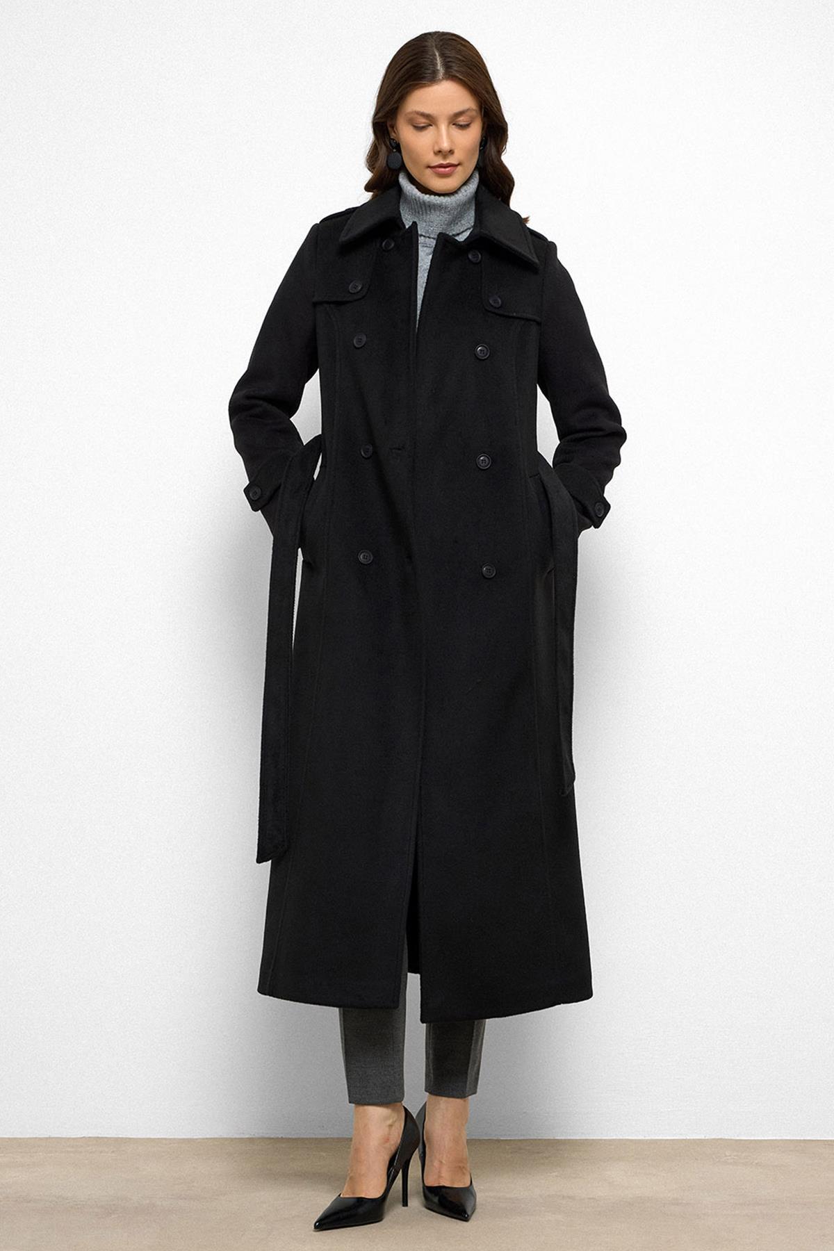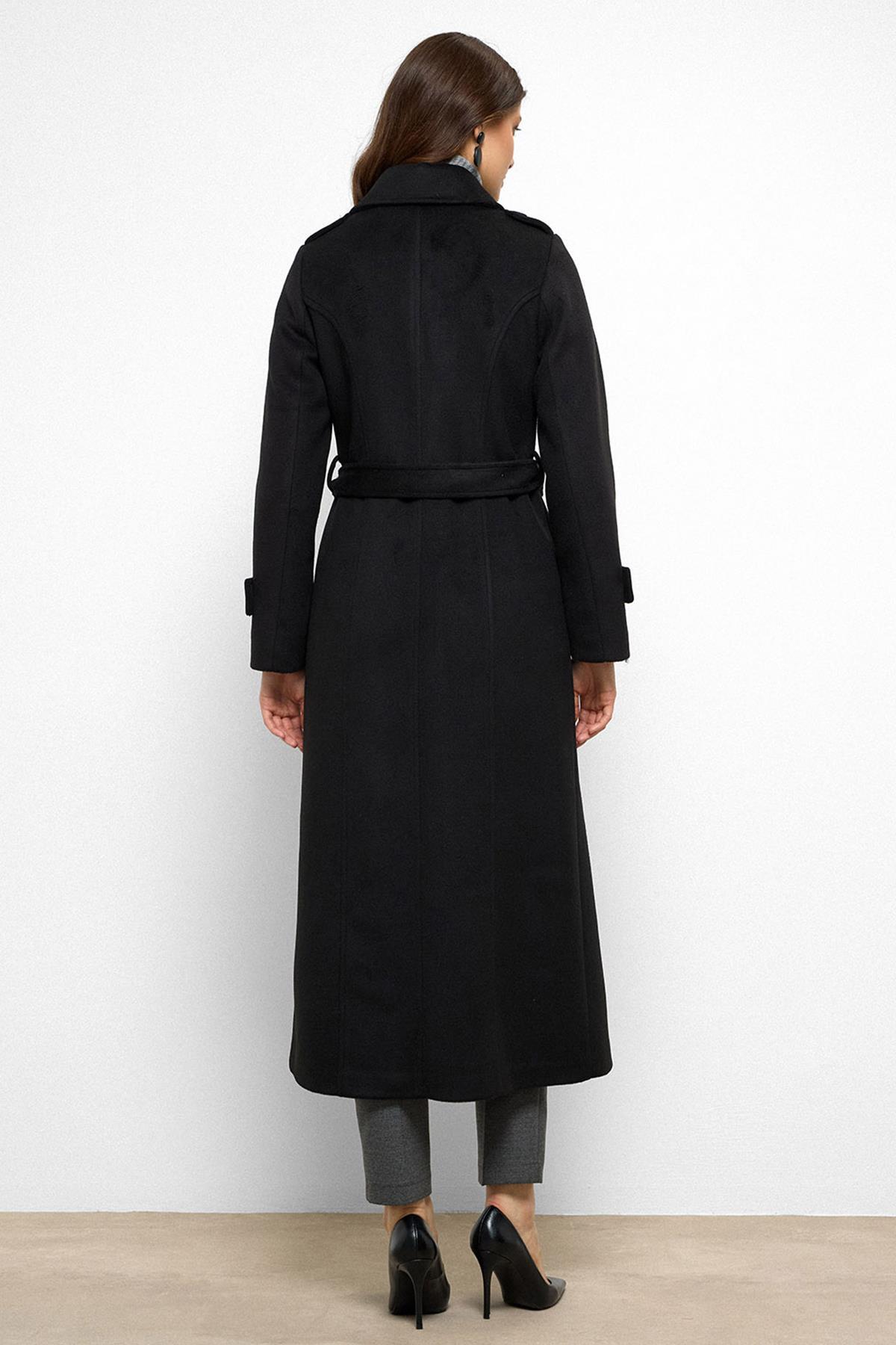 Cape Detailed Double Breasted Long Coat BLACK 3087