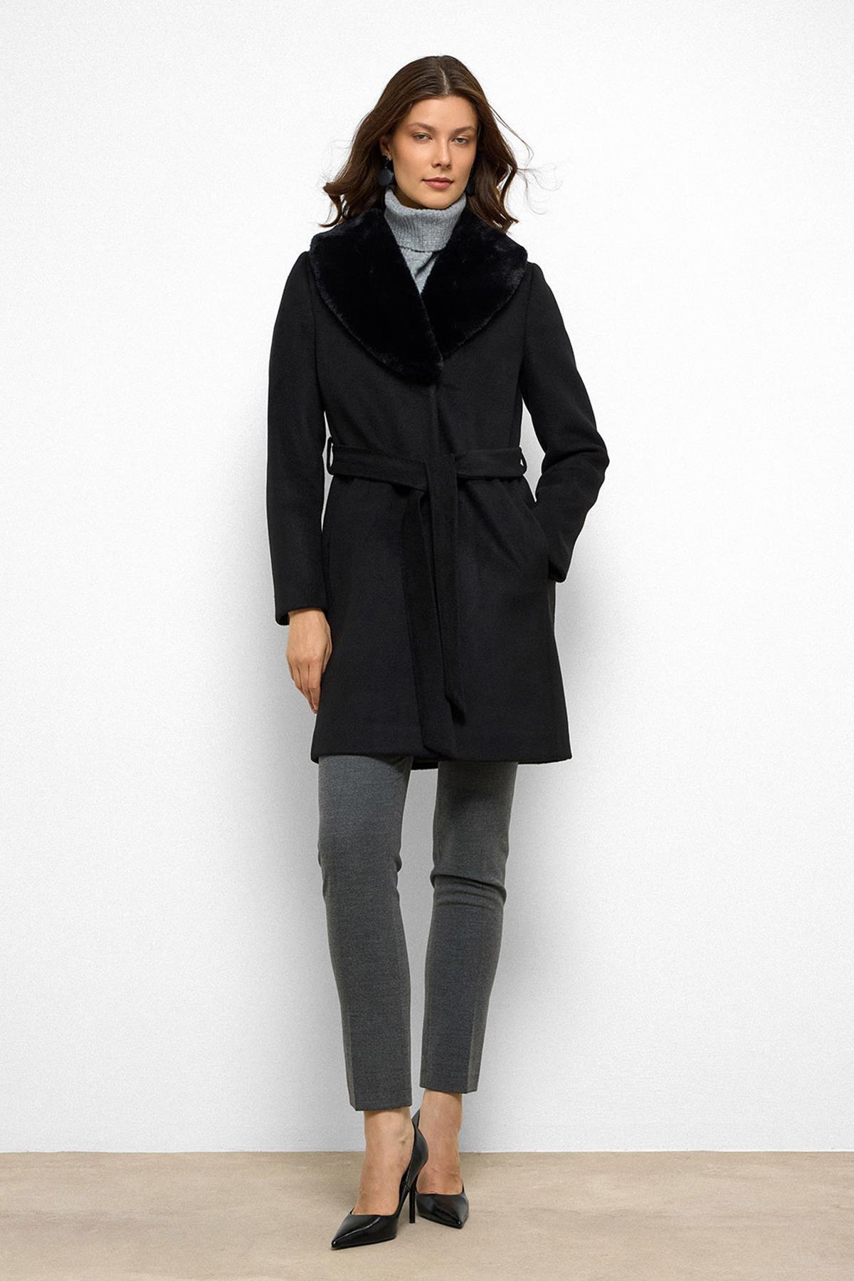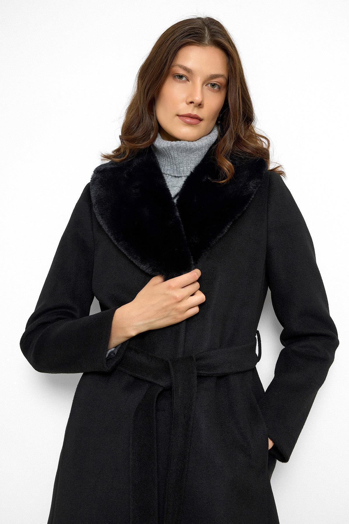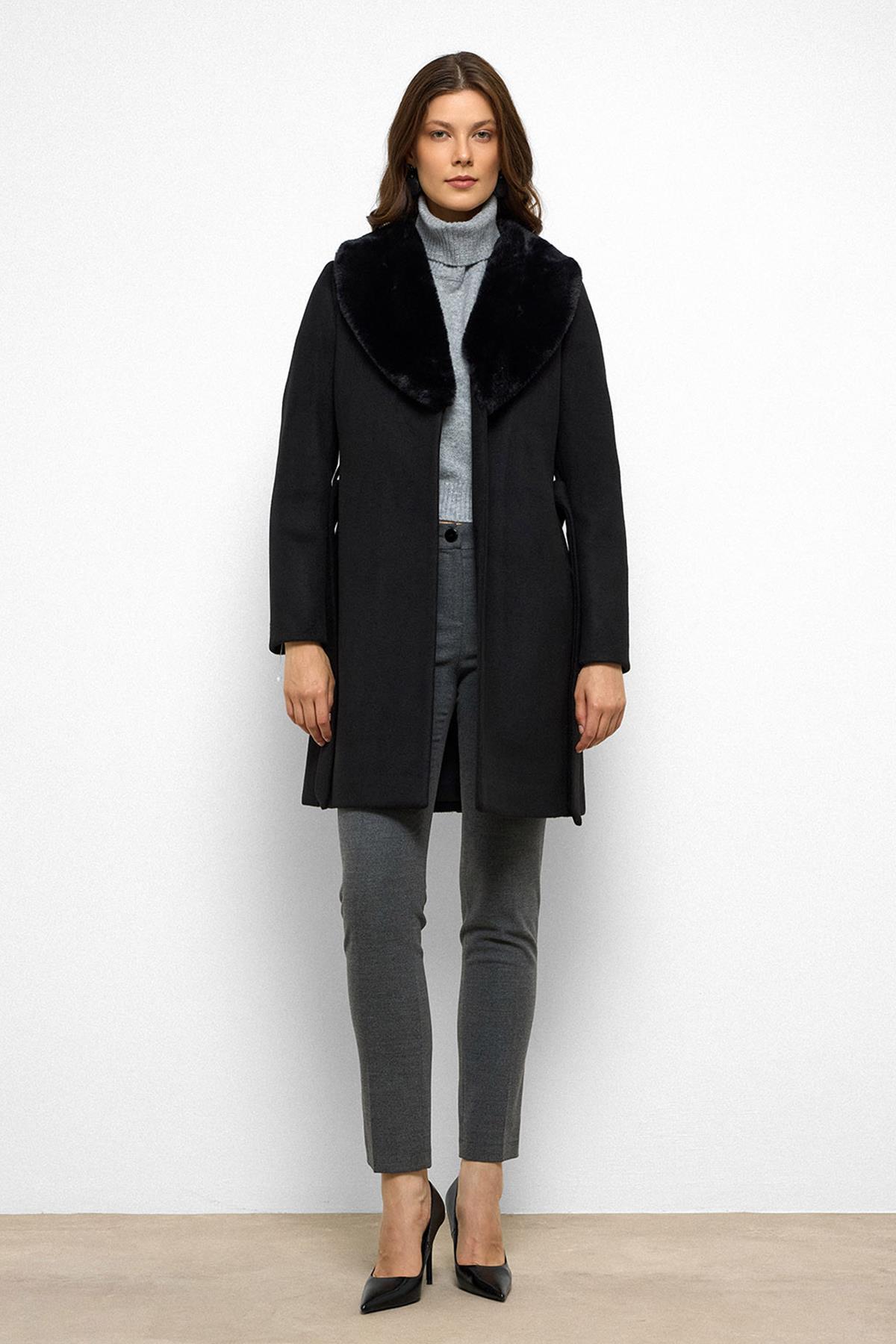 Olcay Shawl Collar Furry Waist Tied Coat BLACK 3093 | ByTR