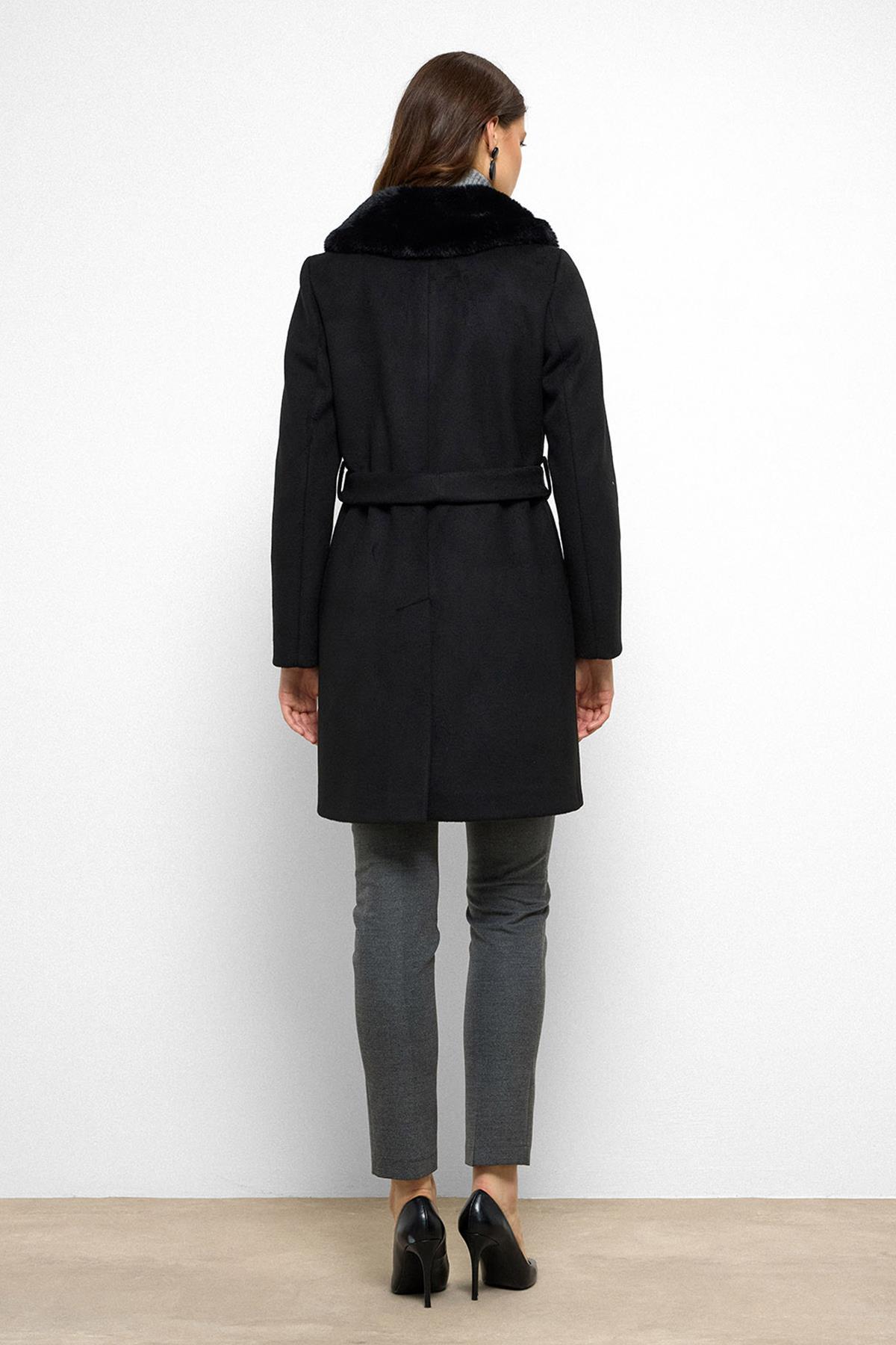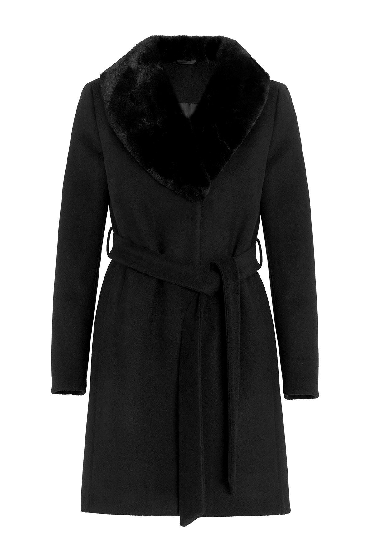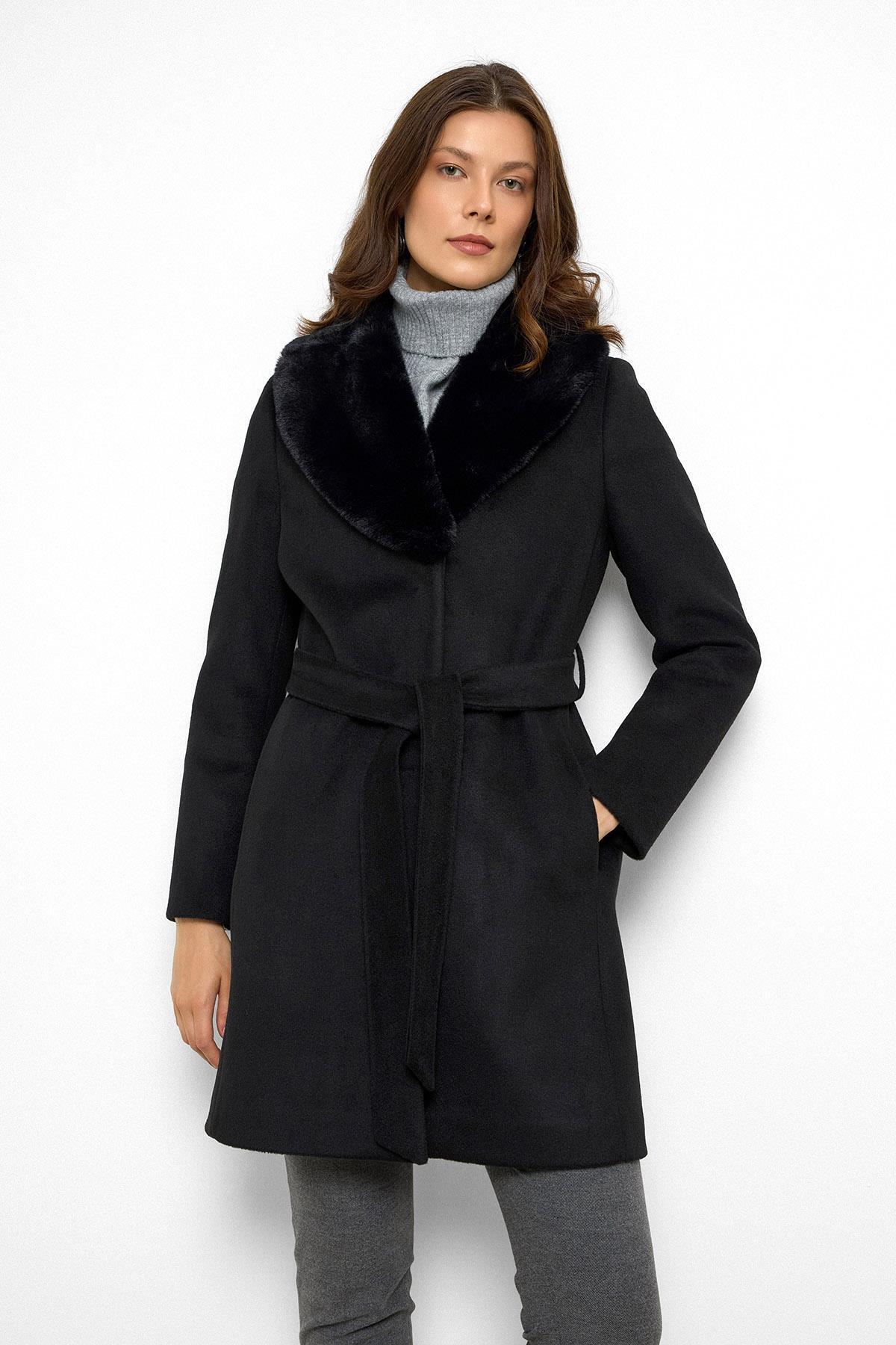 Olcay Shawl Collar Furry Waist Tied Coat BLACK 3093 | ByTR