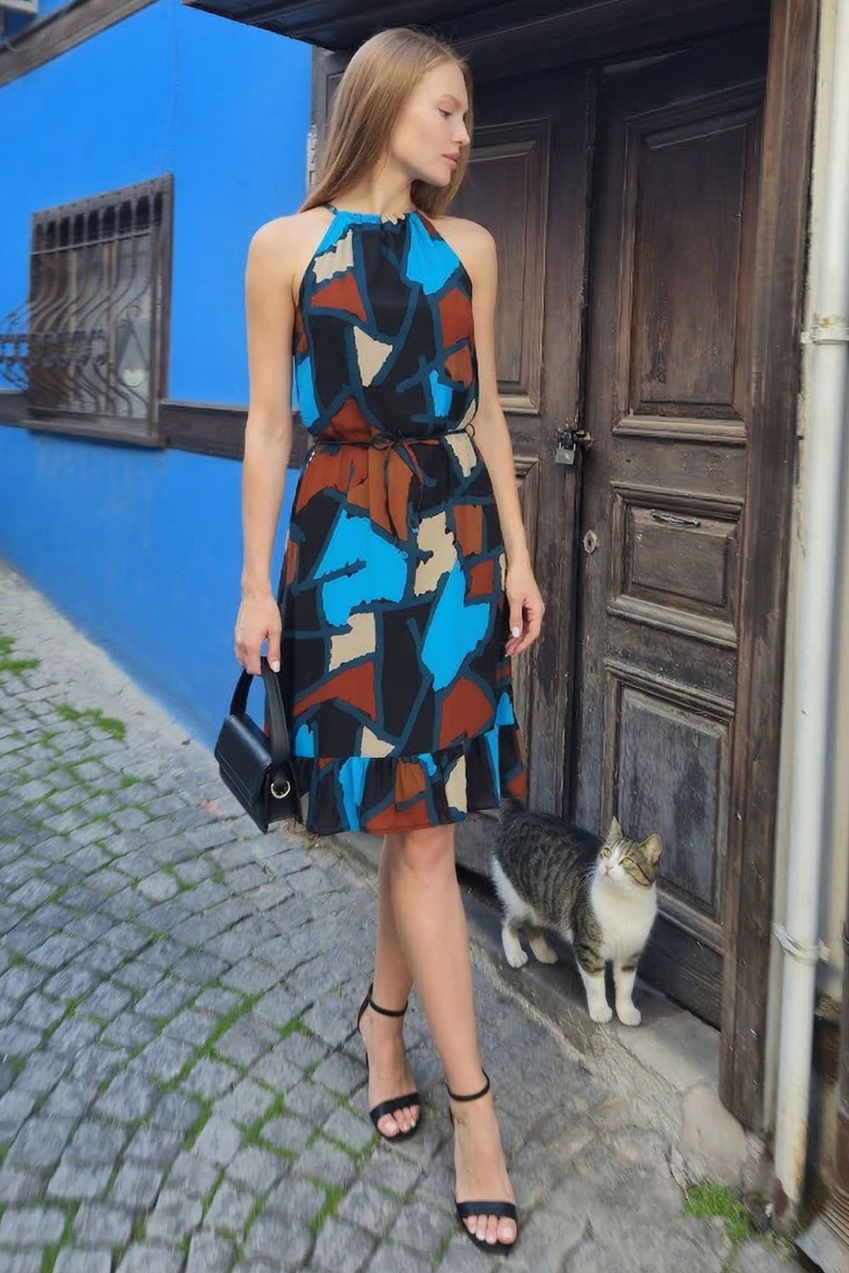 armonika Women's Blue Neck Tied Waist Belted Frilly Skirt Dress ARM-23Y001112 | ByTR