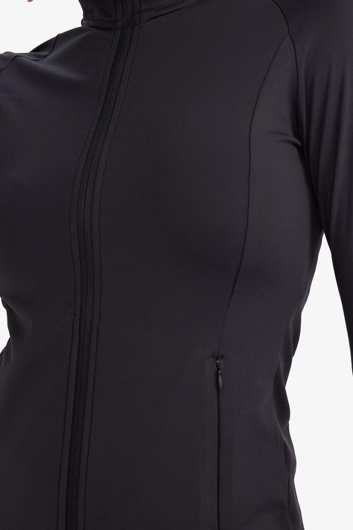 Fitted upright neck sports cardigan offers both a functional and stylish look with its double pocketed and zippered design.