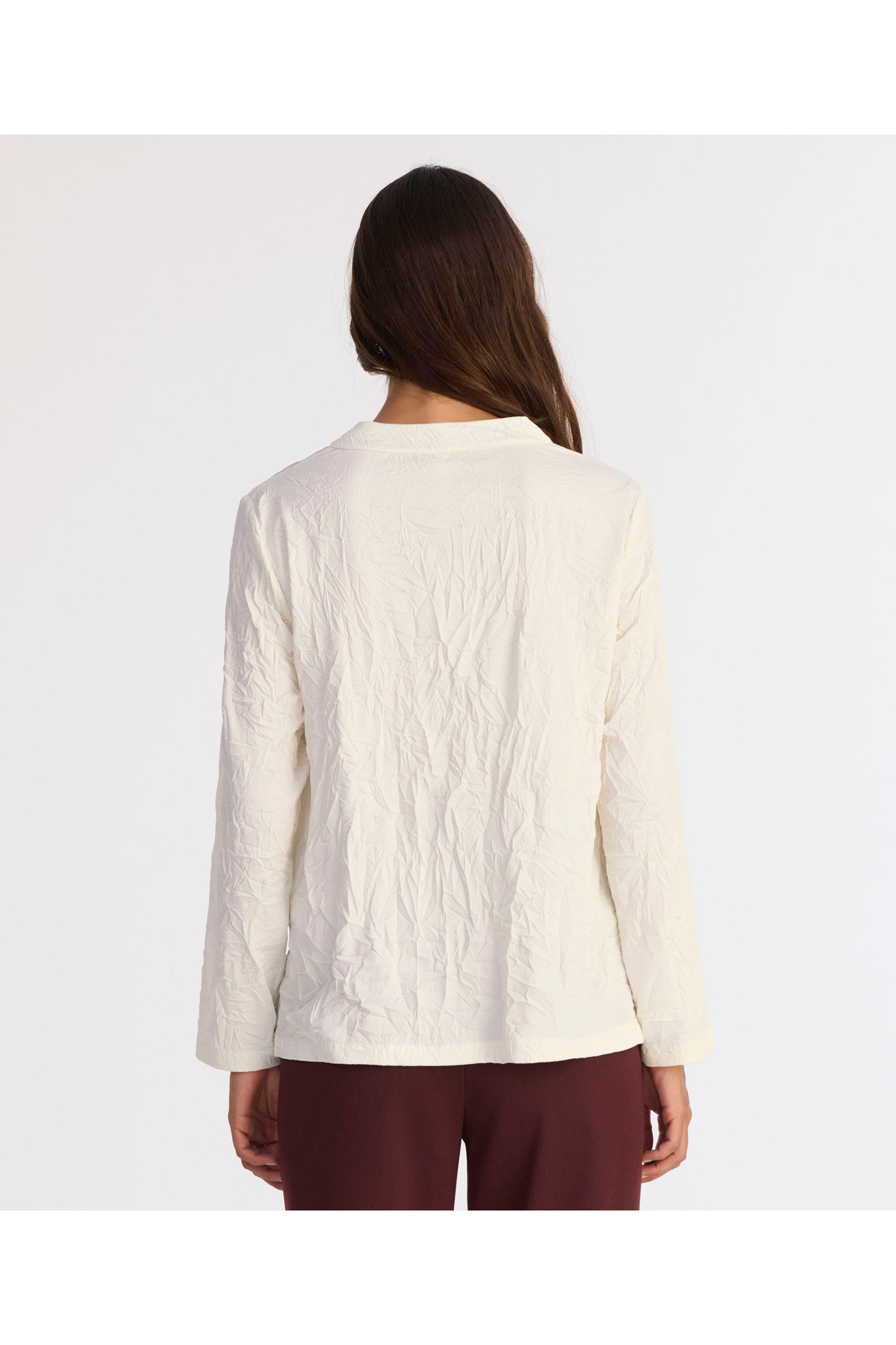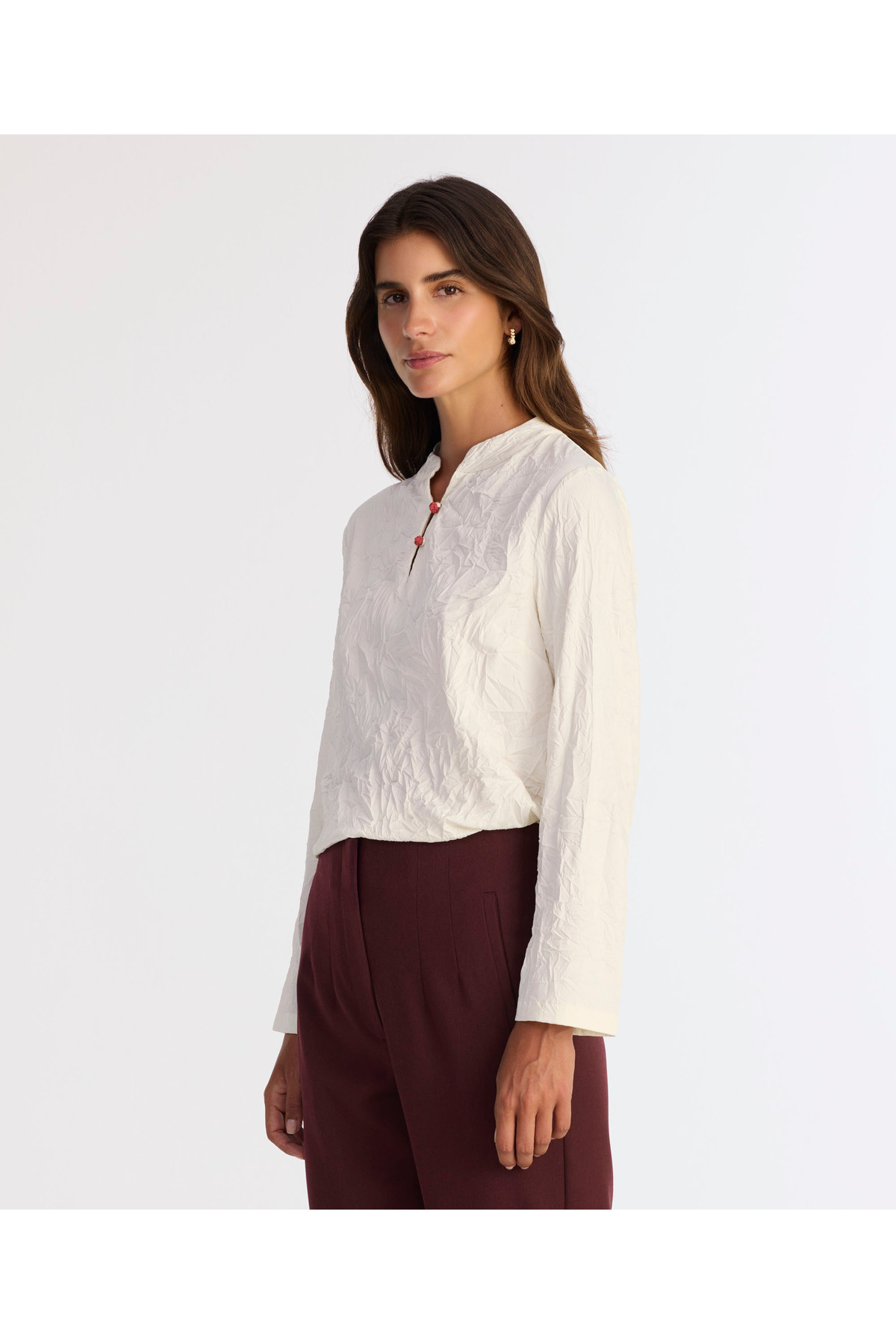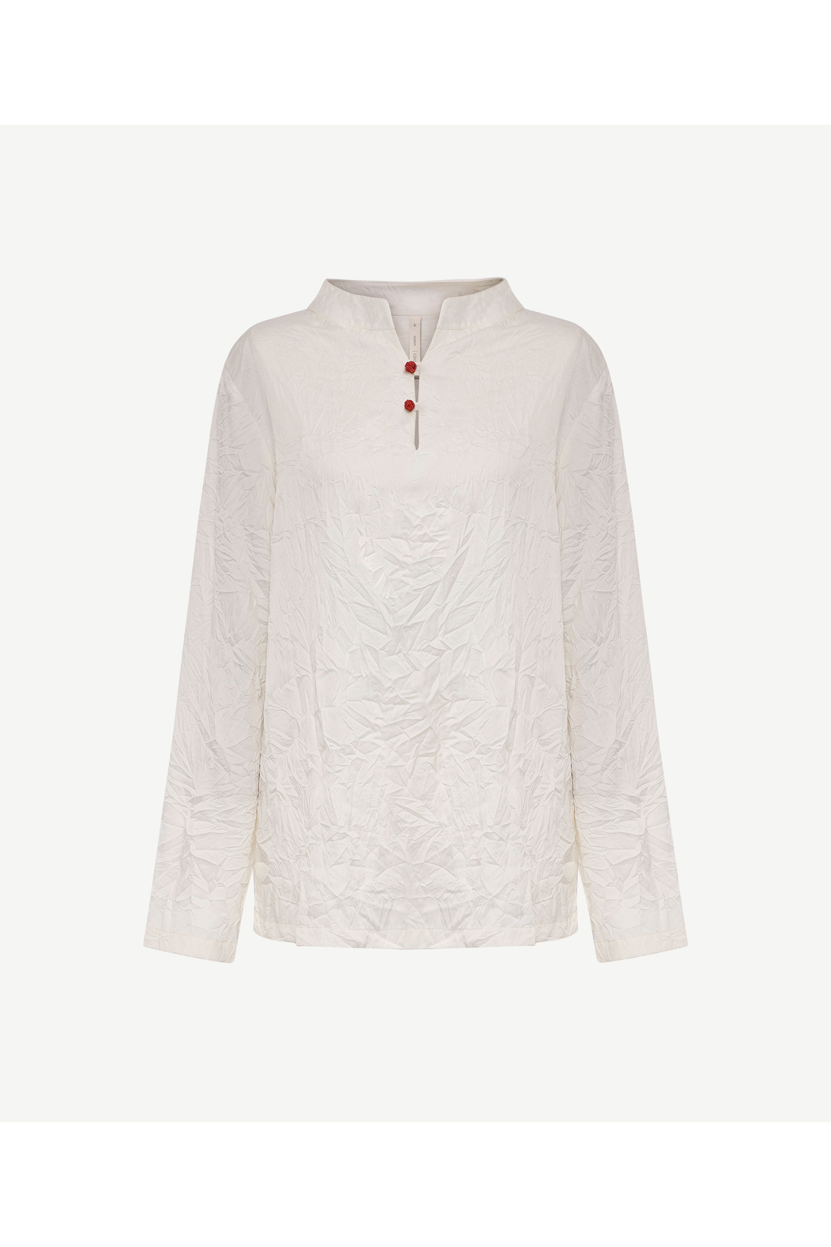 This piece, which attracts attention with its wrinkled texture and contrast button details, appeals to those who are looking for an original and comfortable style.