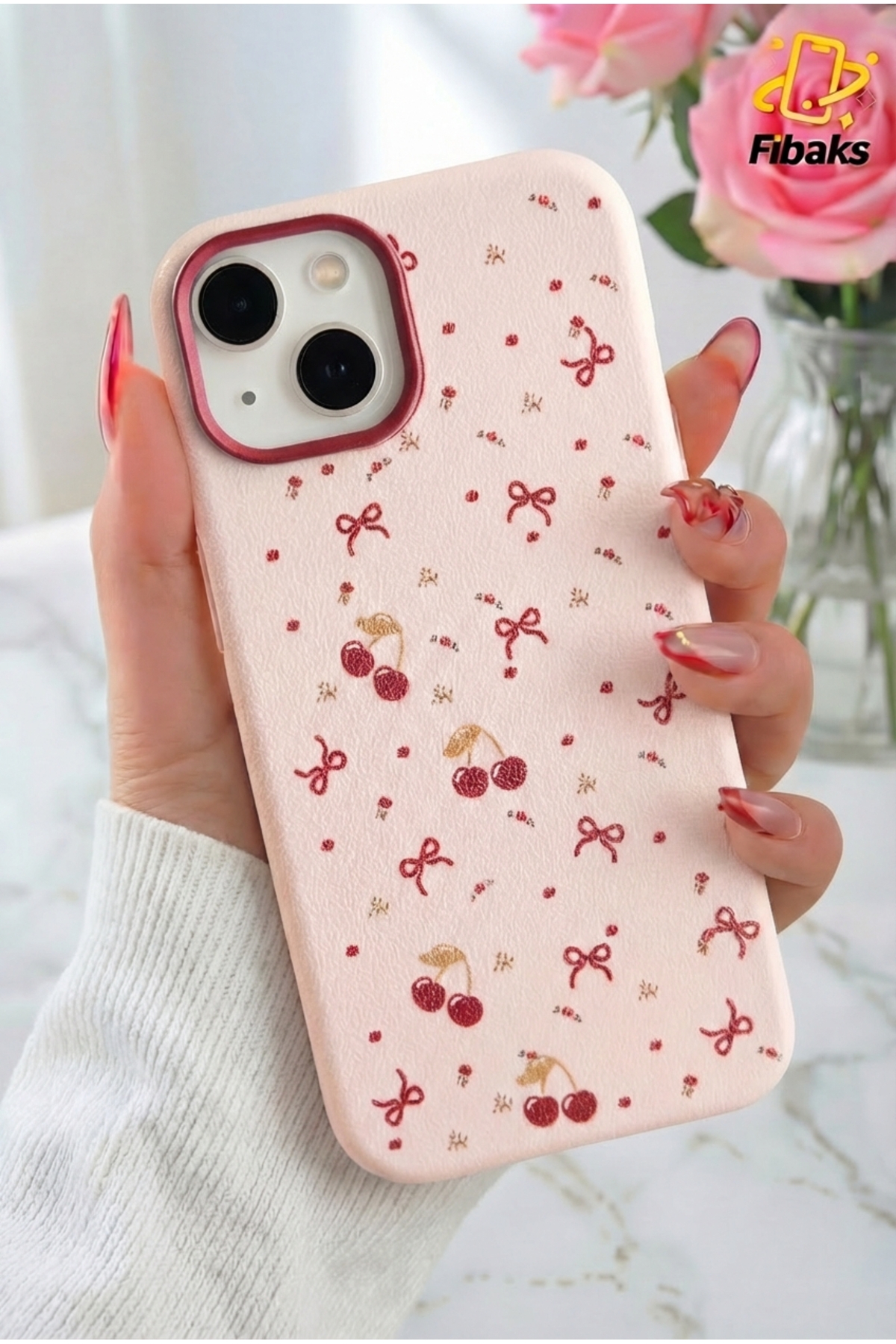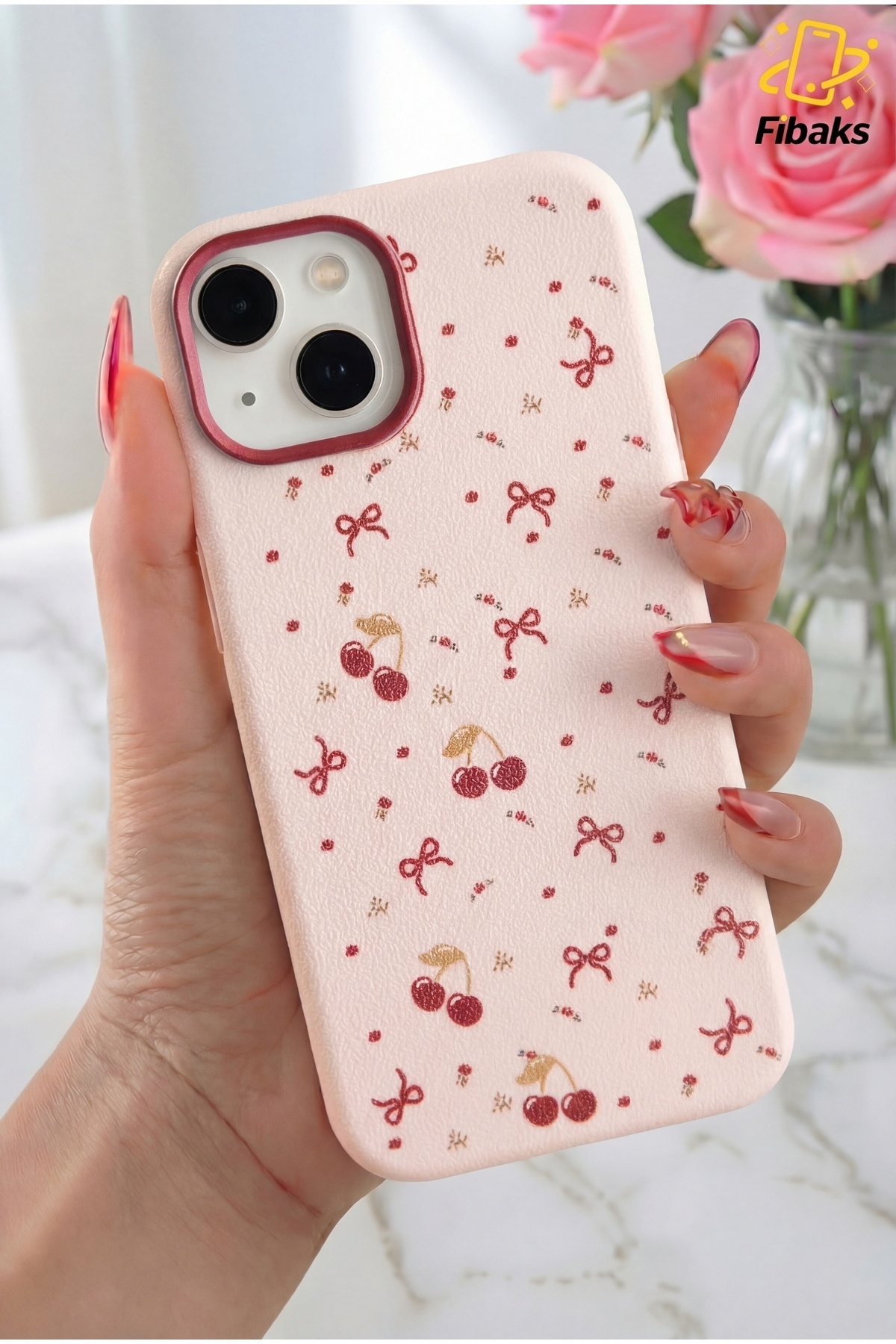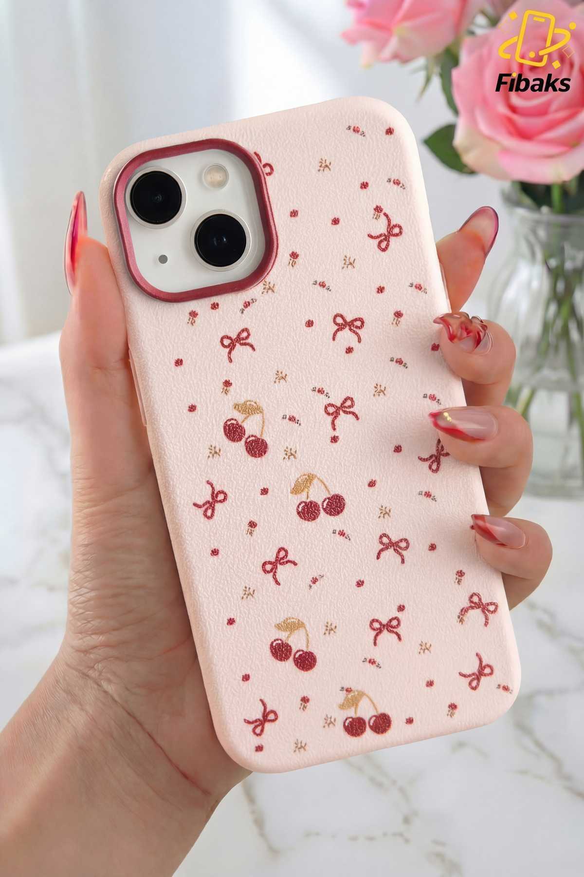 The cherry and bow patterned silicone case specially designed for Apple iPhone 13, 14 and 15 models protects your phone in a stylish way.