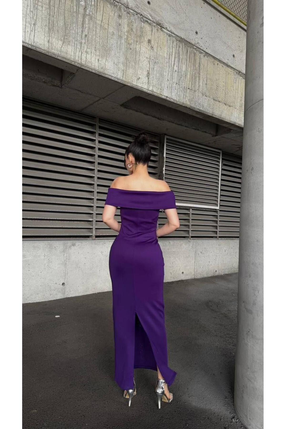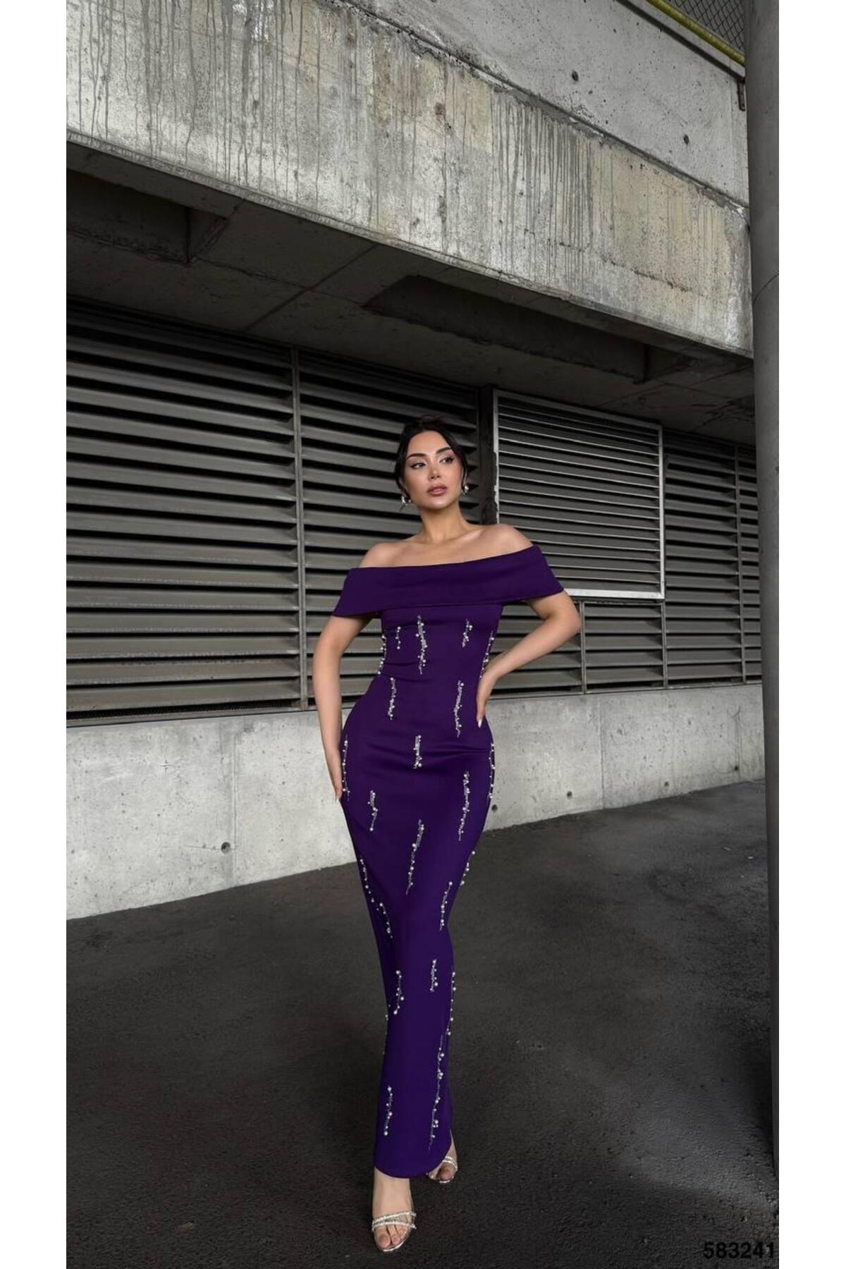 Modafeminen Stone Detailed Strapless Collar Scuba Fabric Dress Purple 583241 | ByTR