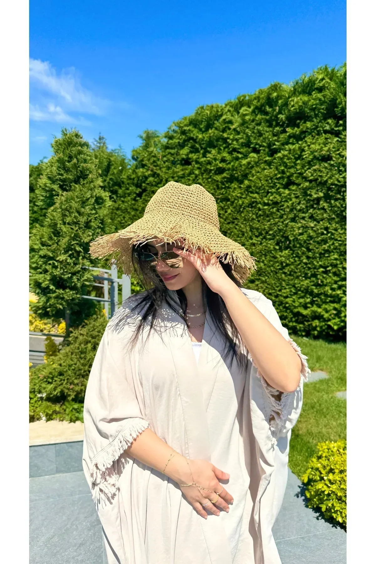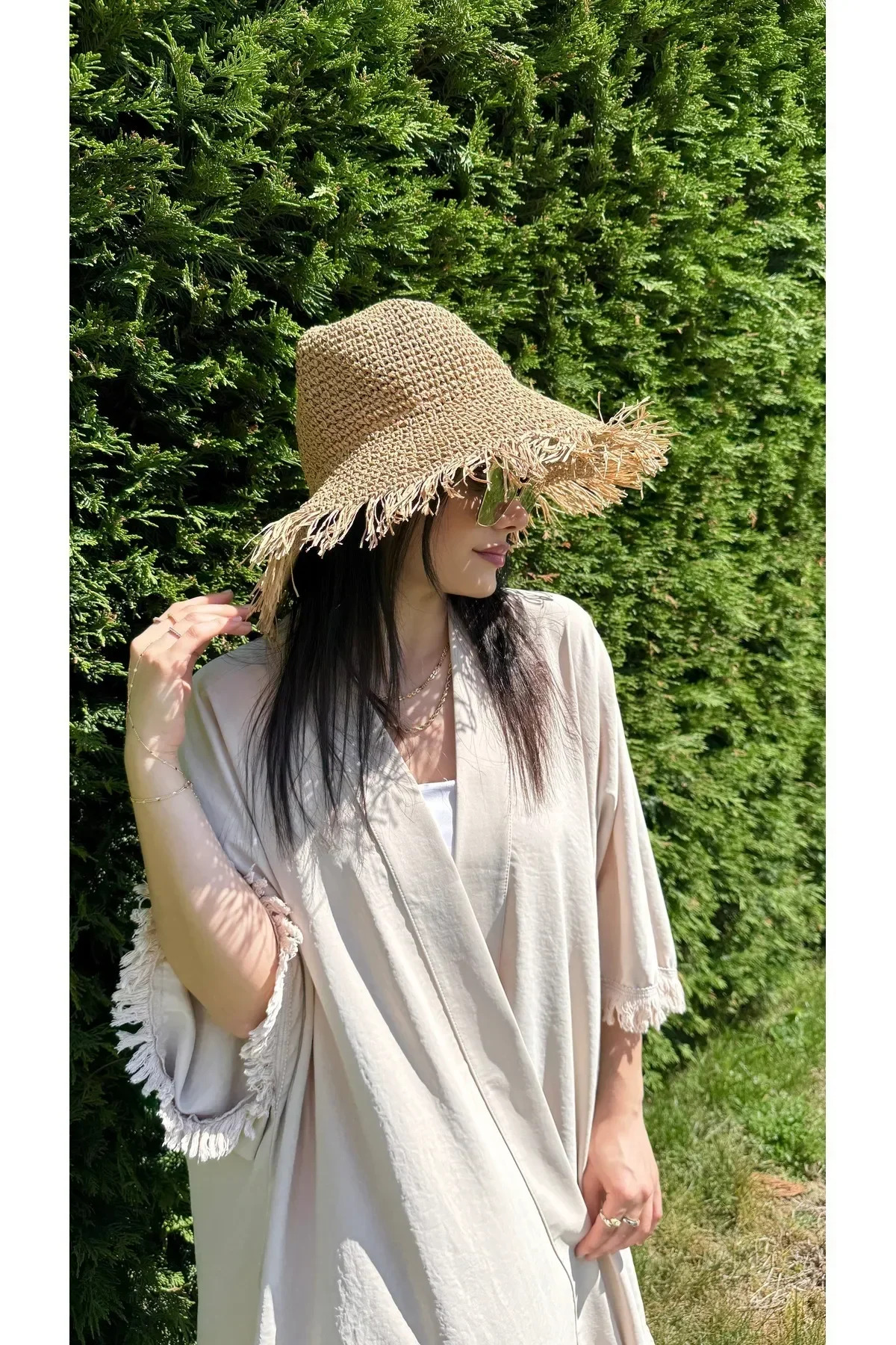 Straw hat, which attracts attention with its natural texture, offers coolness and style in summer.