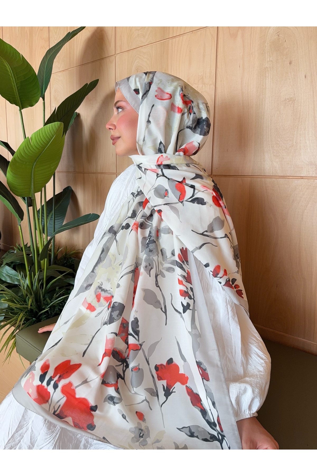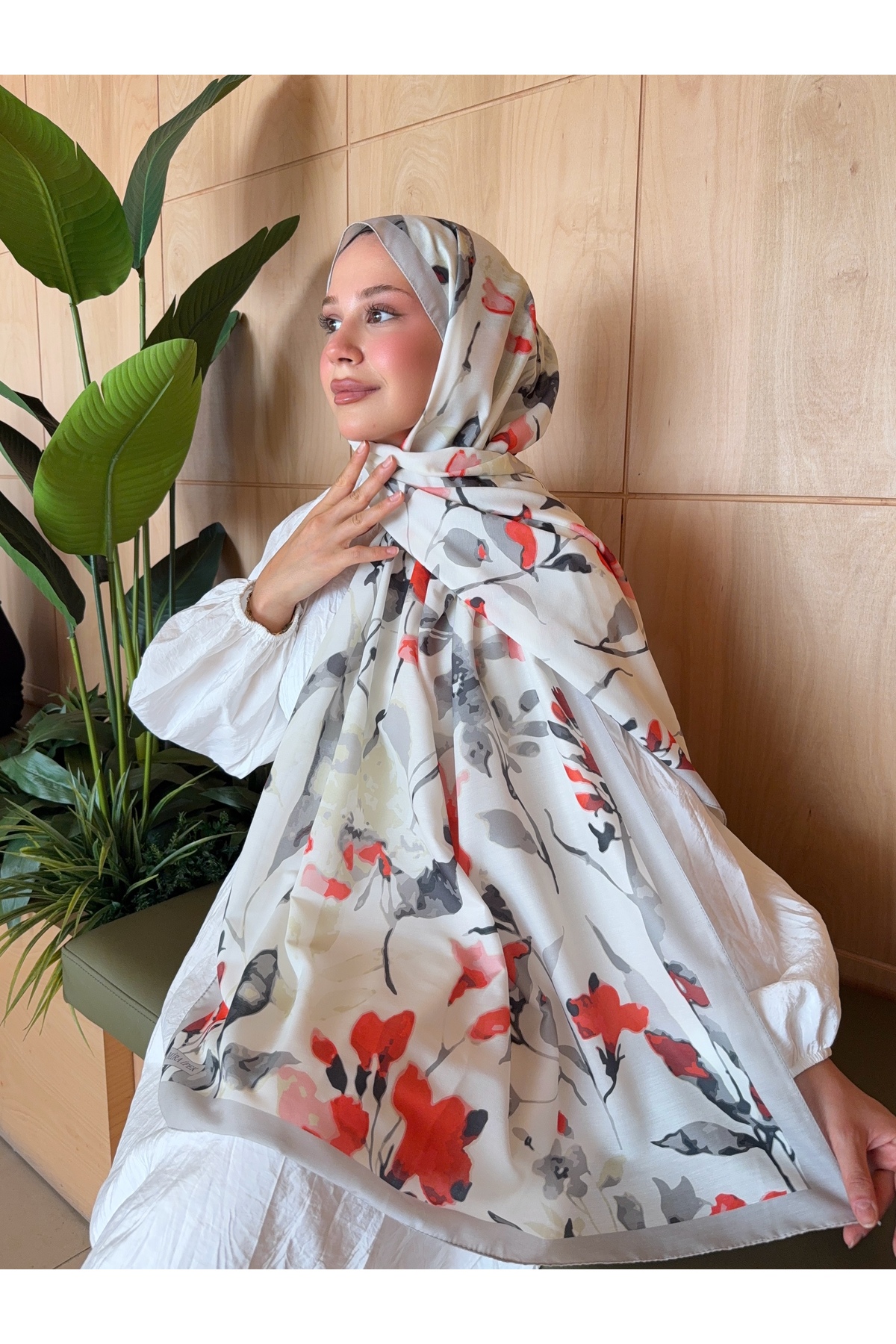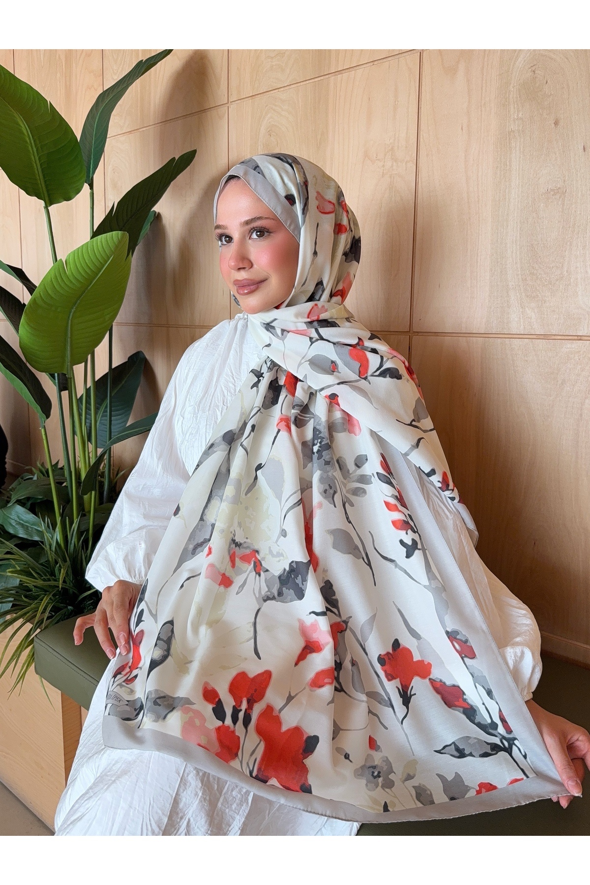 Mira İpek Patterned Cotton Soft Shawl Mena Series Ecru Red Flower ps62 | ByTR