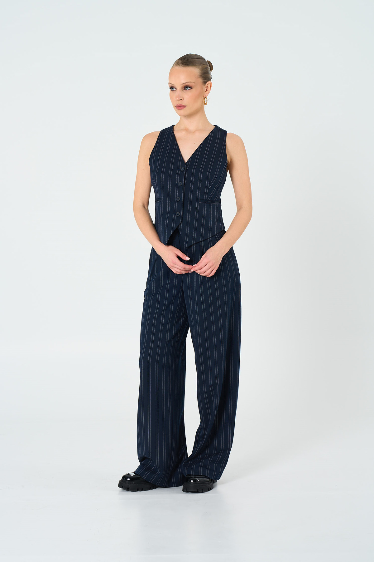 This model, signed by Navy Blue Striped Vest Thalure, combines classic tailoring with modern details