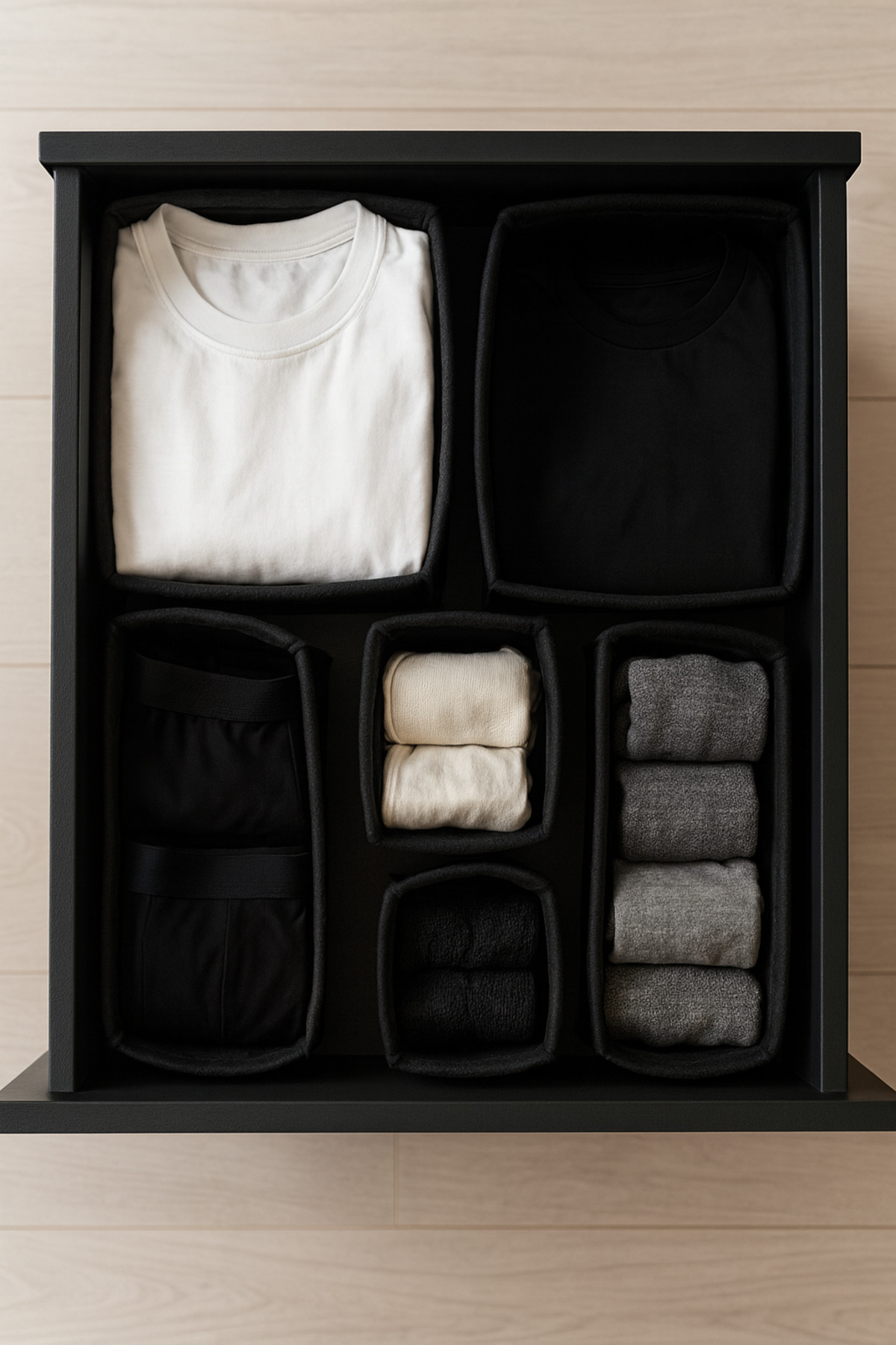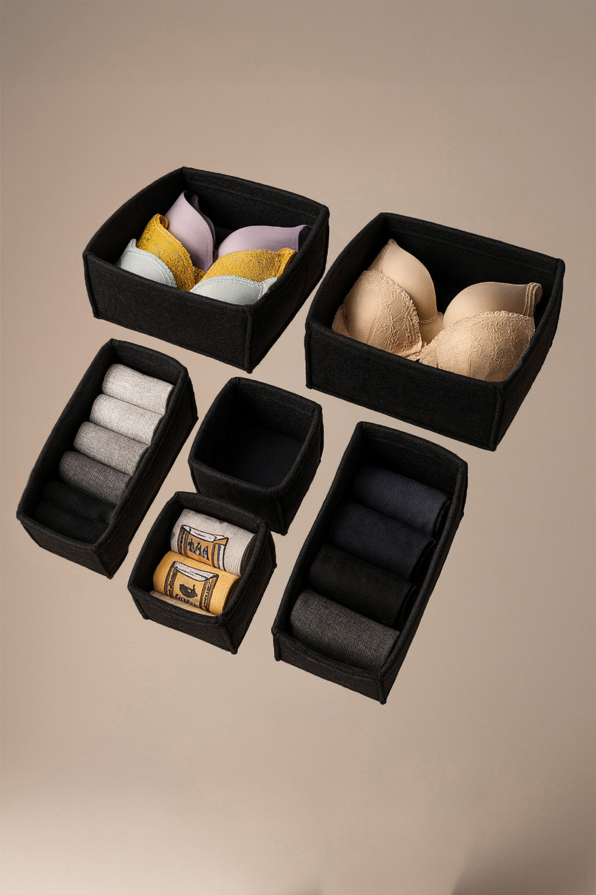 Black 6 Compartment Drawer and Wardrobe Organizer Set is an ideal solution for keeping order in wardrobes and drawers.