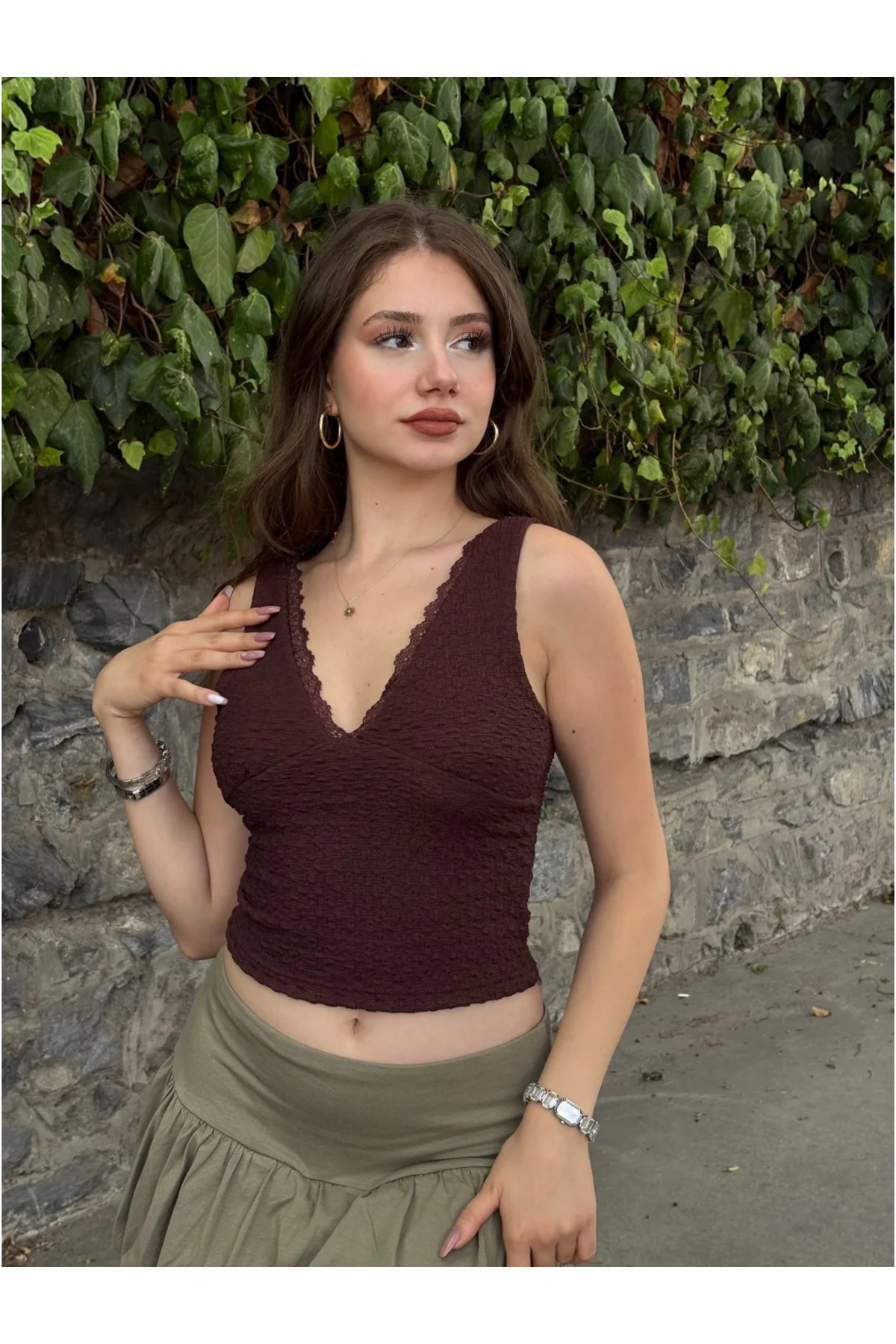 Decorated with elegant lace details, wafer textured crop blouse completes your elegance in summer.