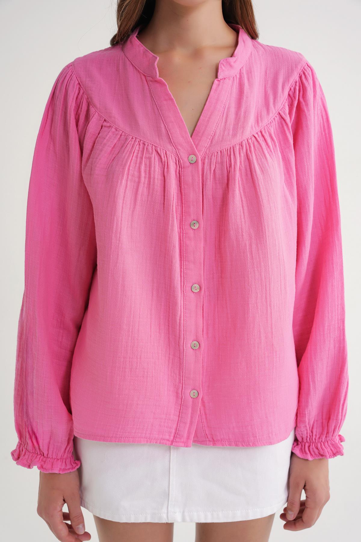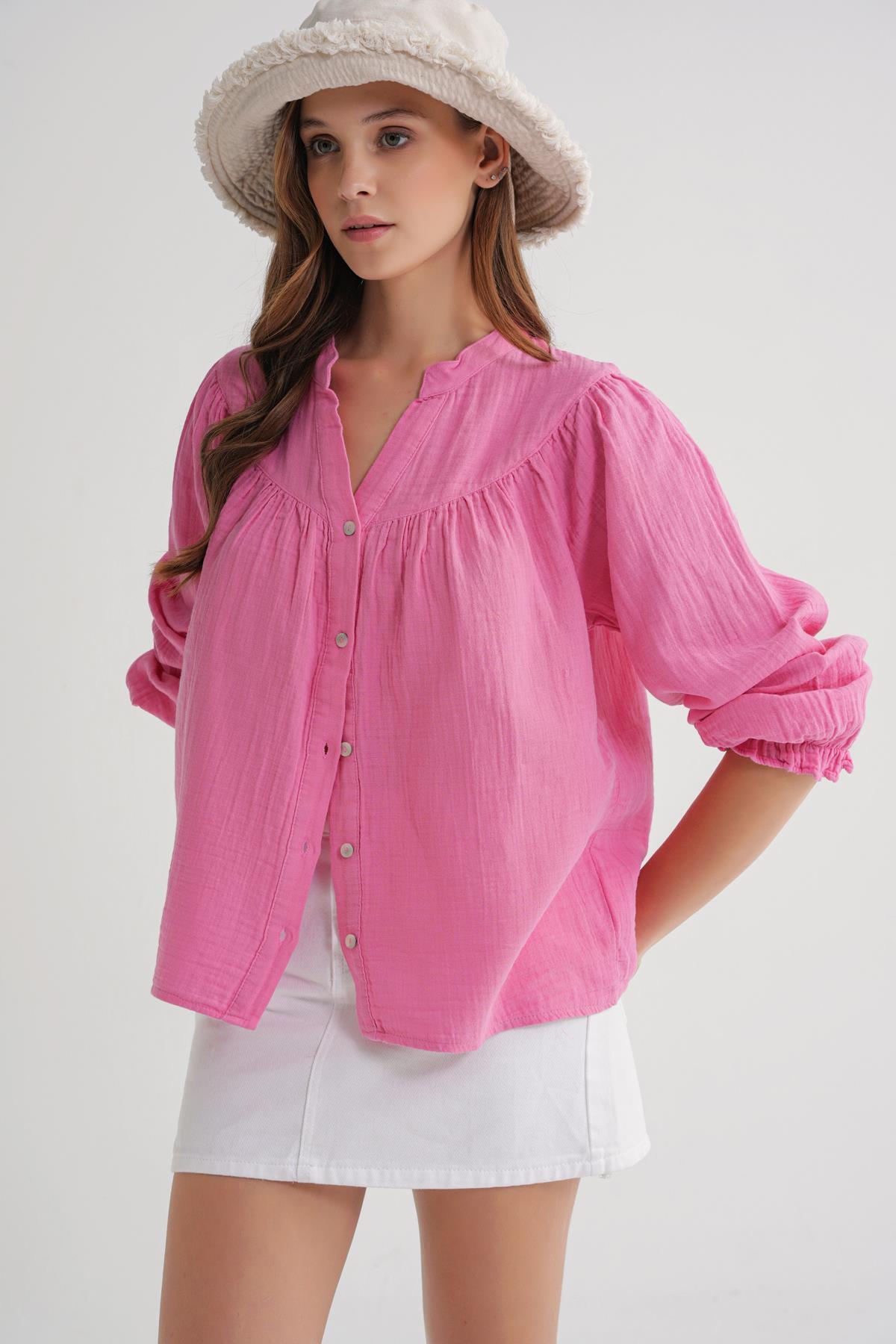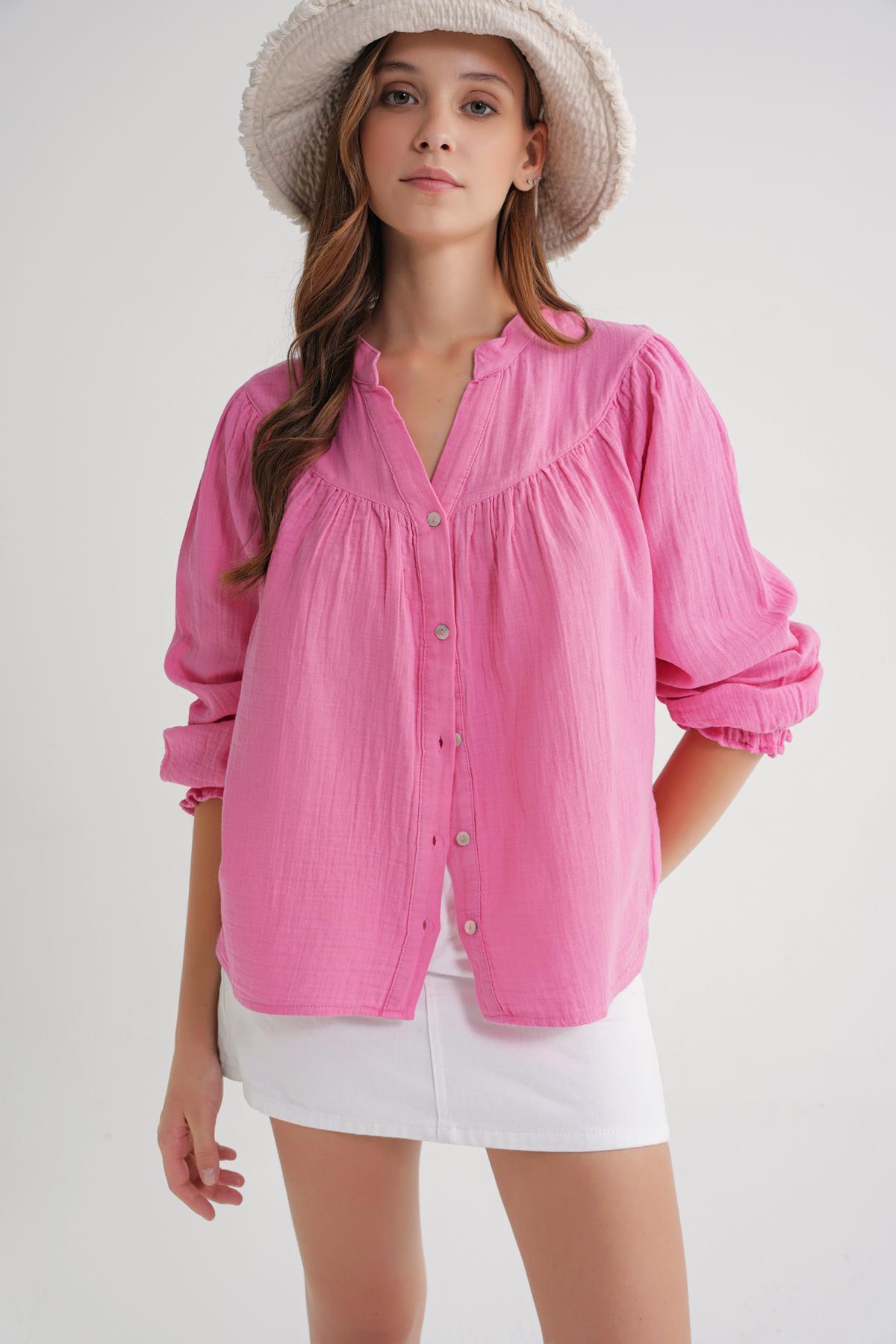 4733 Women's Shirring Yoke Long Sleeve Muslin Shirt Pink