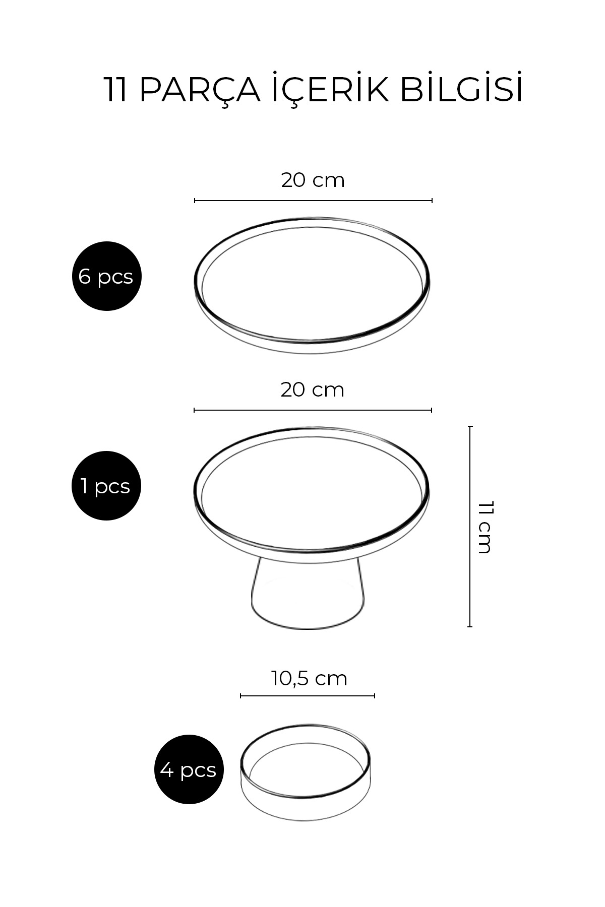 Package Content : 6 Pieces 19 cm Stackable Plates 4 Jam Bowls Olive Bowl Diameter : 10.5cm Height : 3.5cm 1 Piece Footed Presentation 19x19x11cm