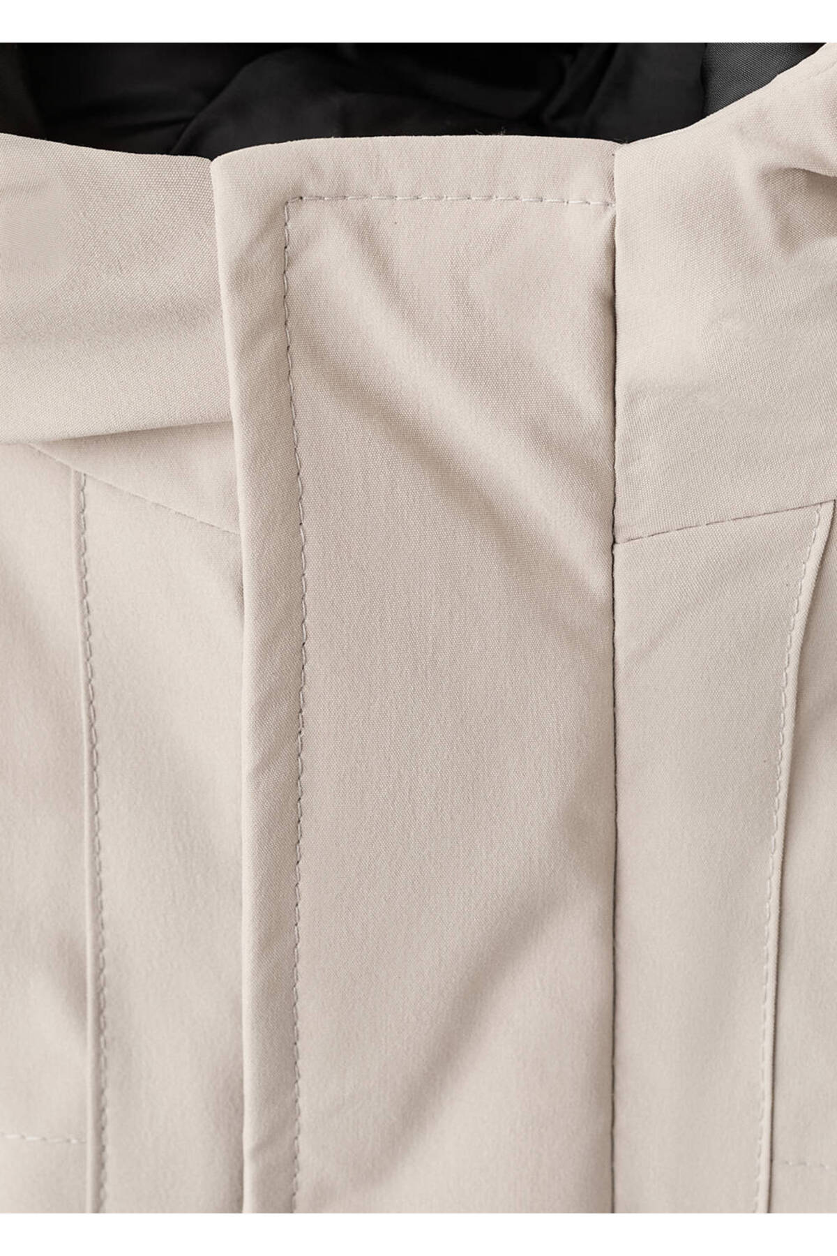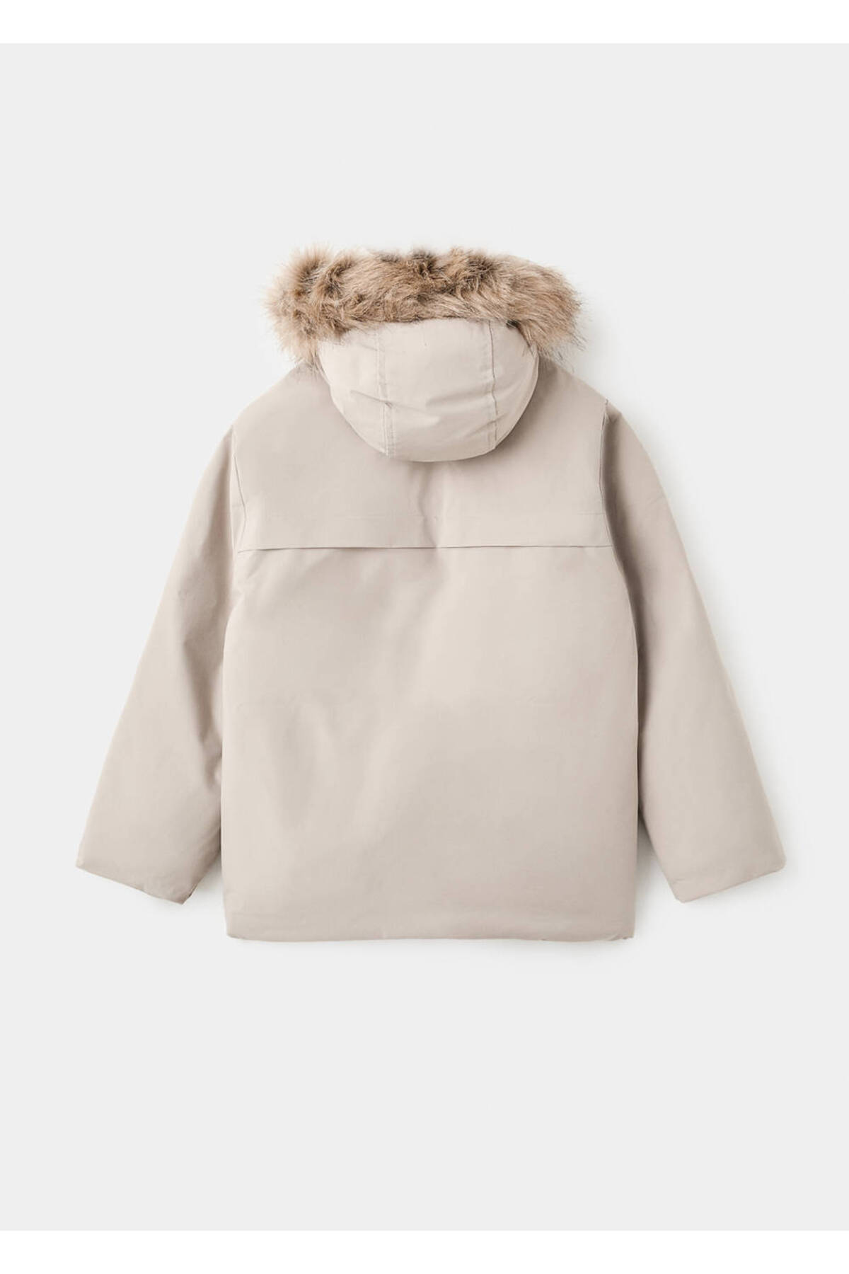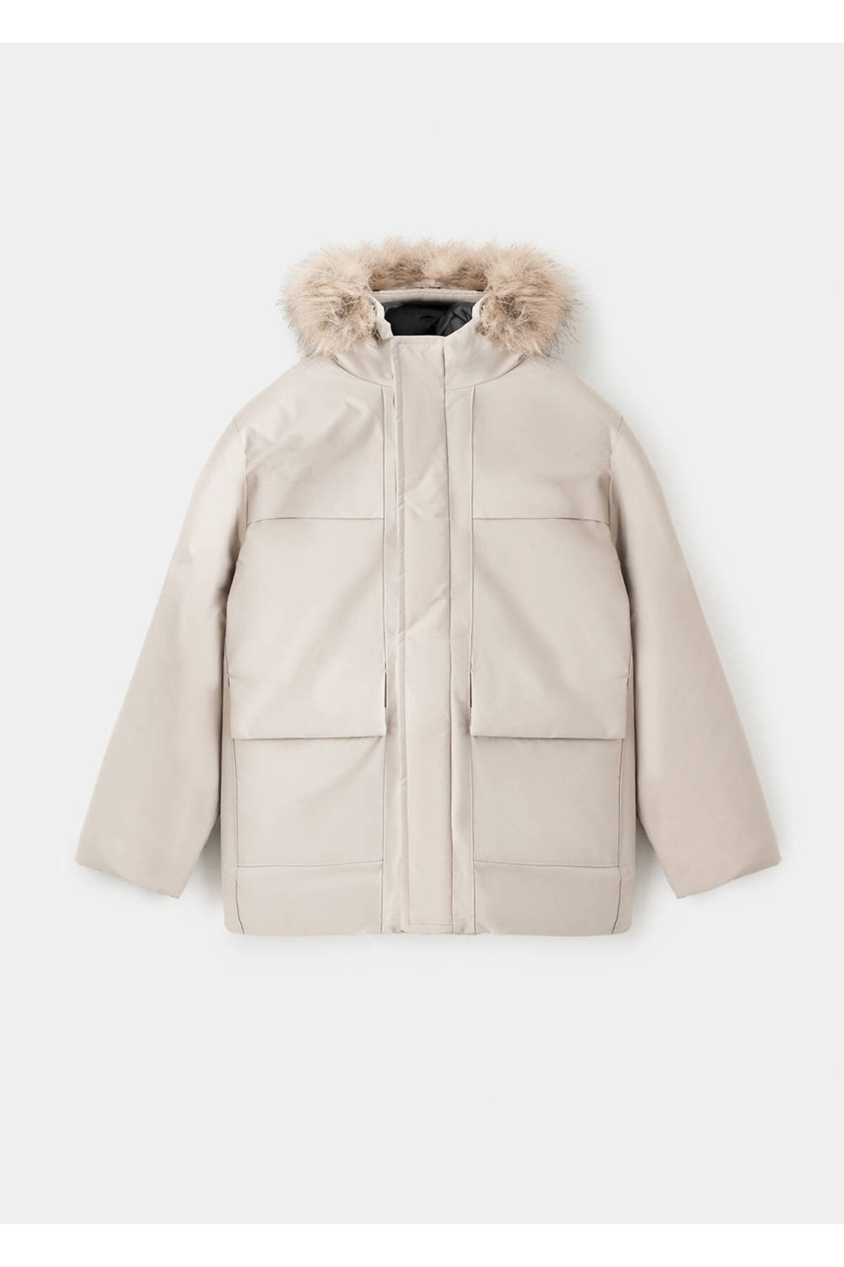 Straight Design, Synthetic feather detail hood, Two front pockets, Zipper and button closure.