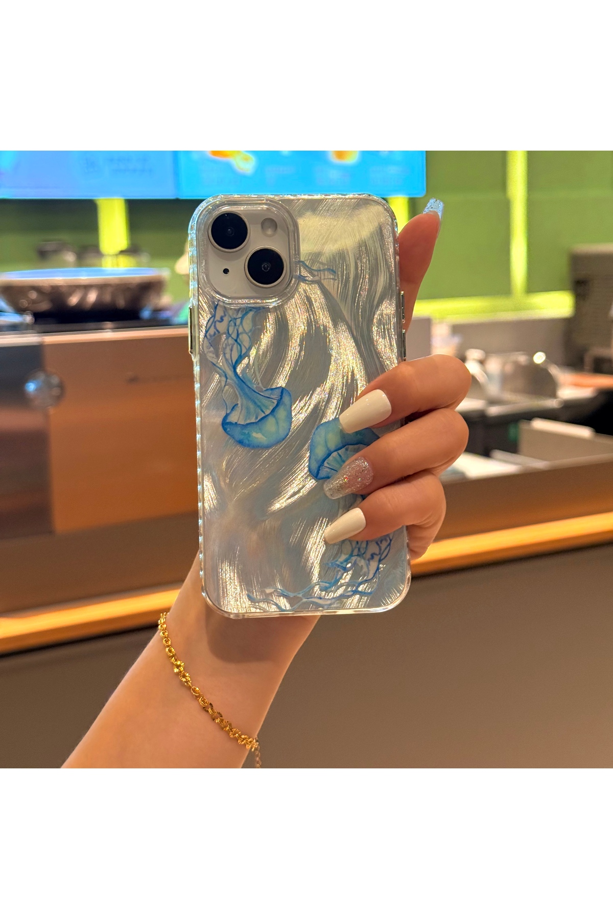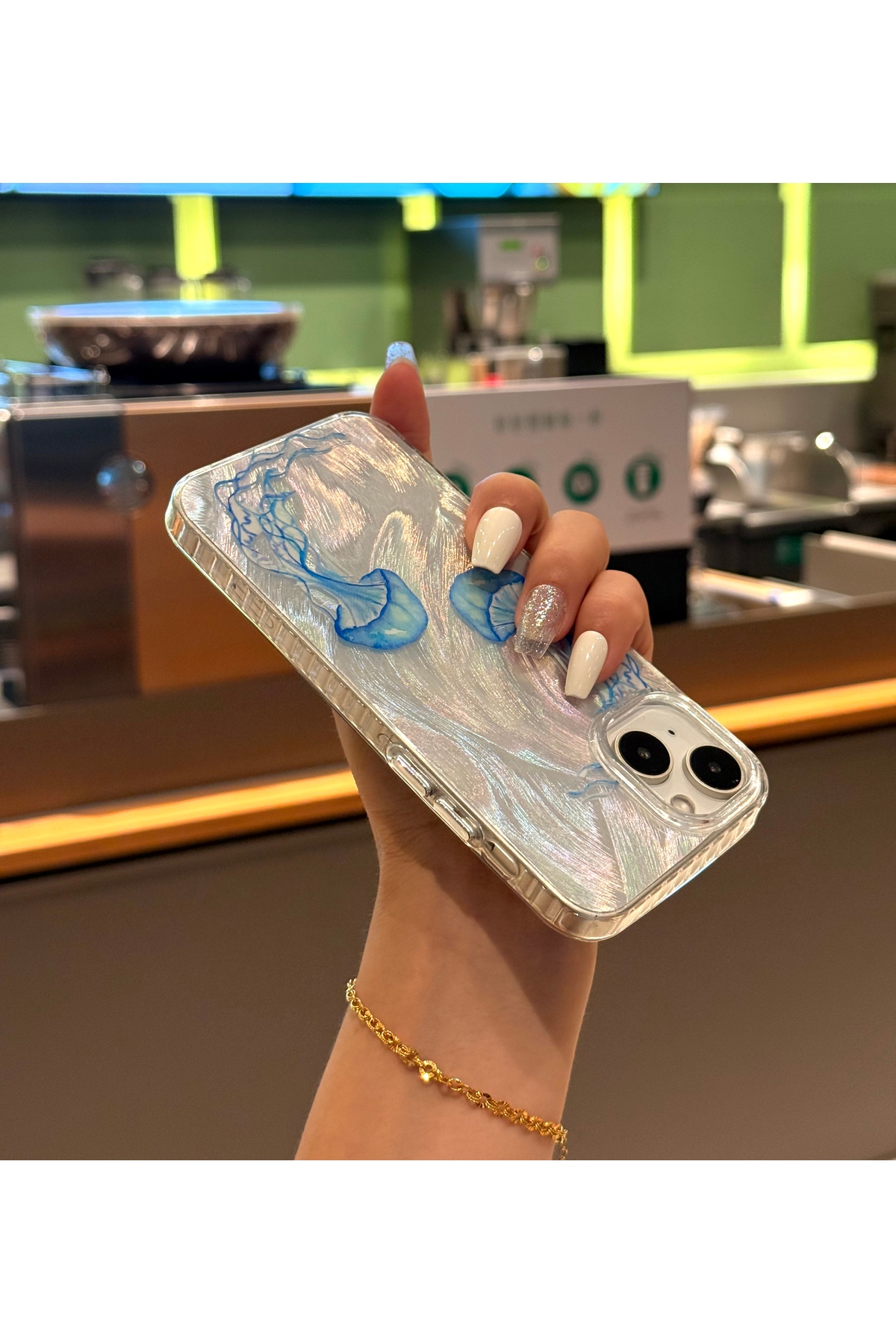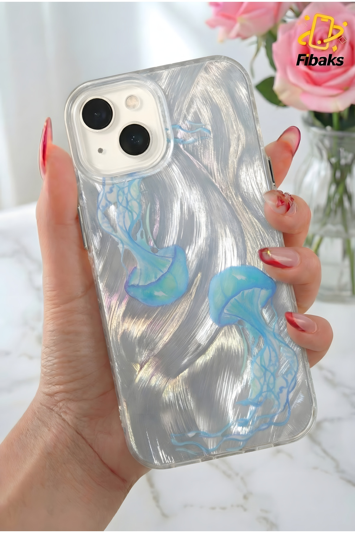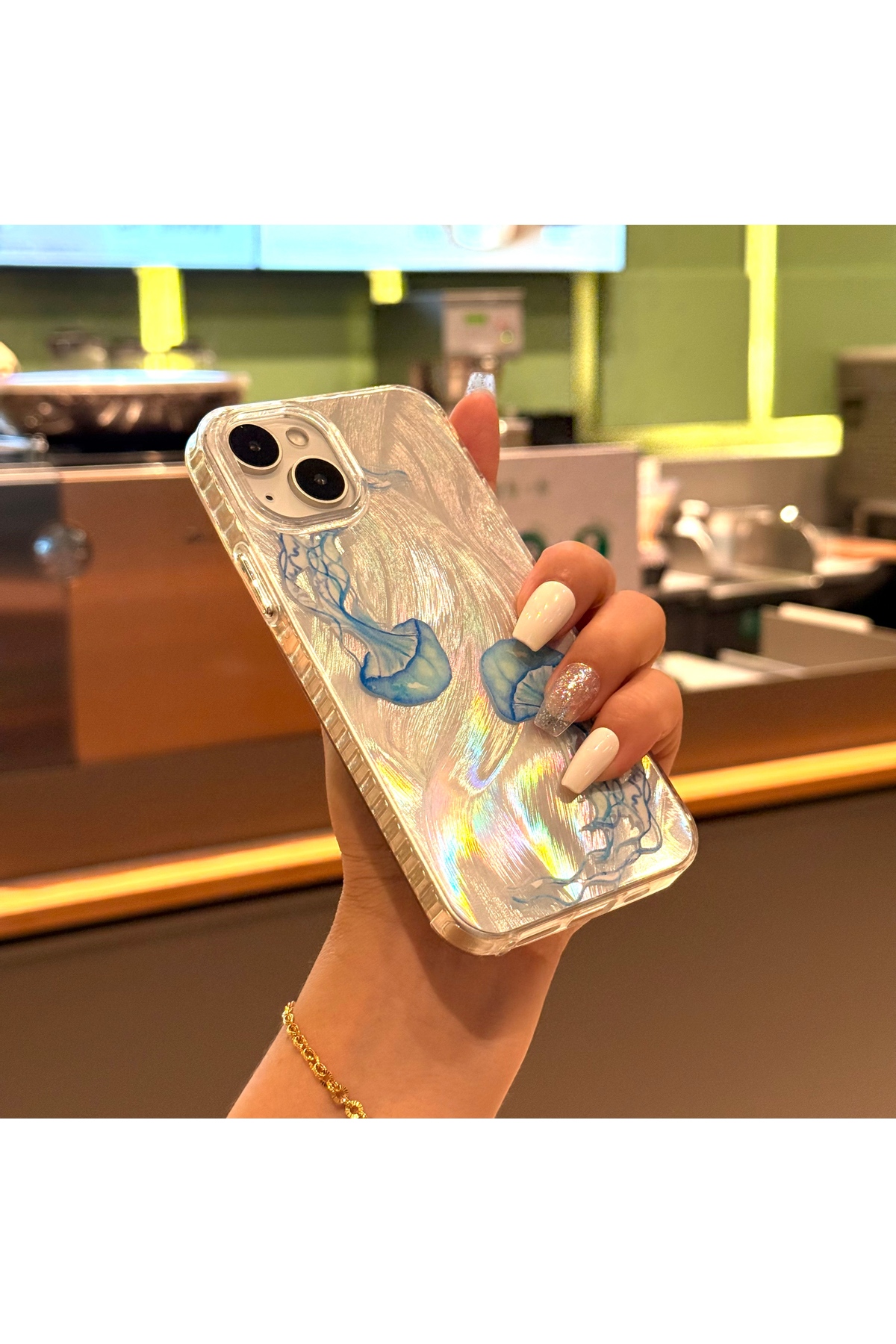 Protect your phone in style with the holographic blue jellyfish patterned case designed for iPhone 13, iPhone 14 , iPhone 15 models.