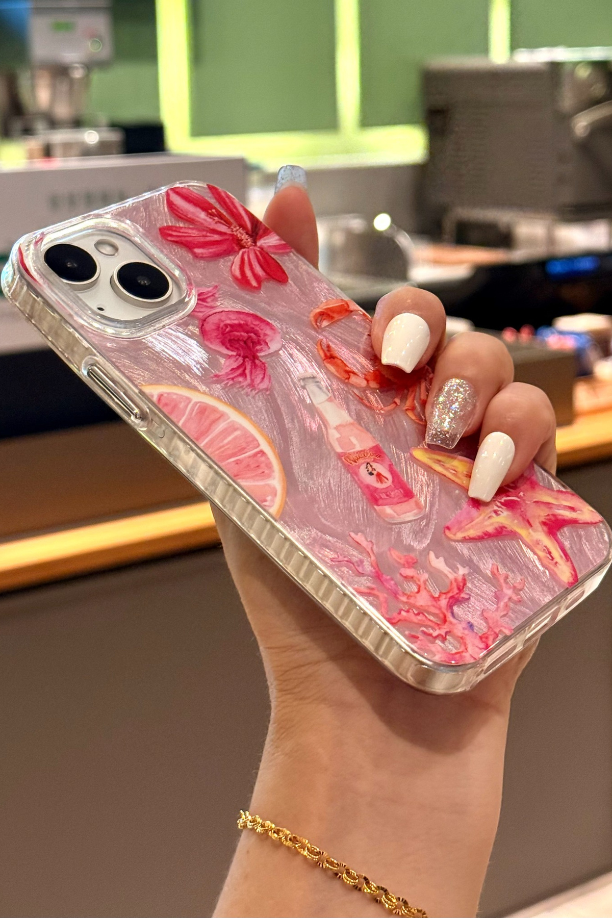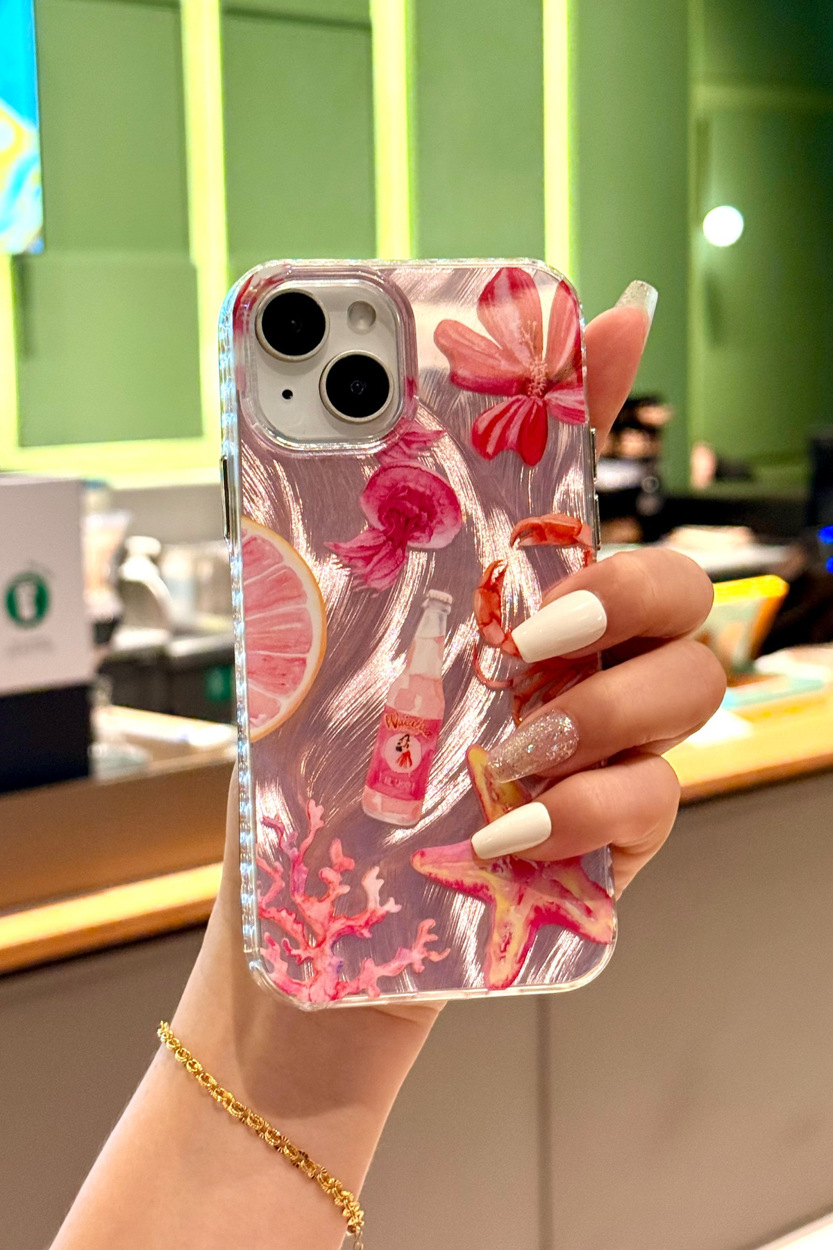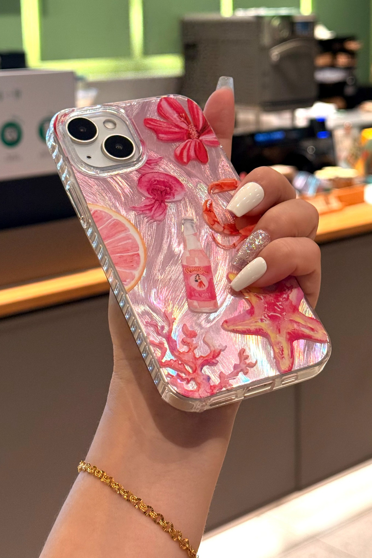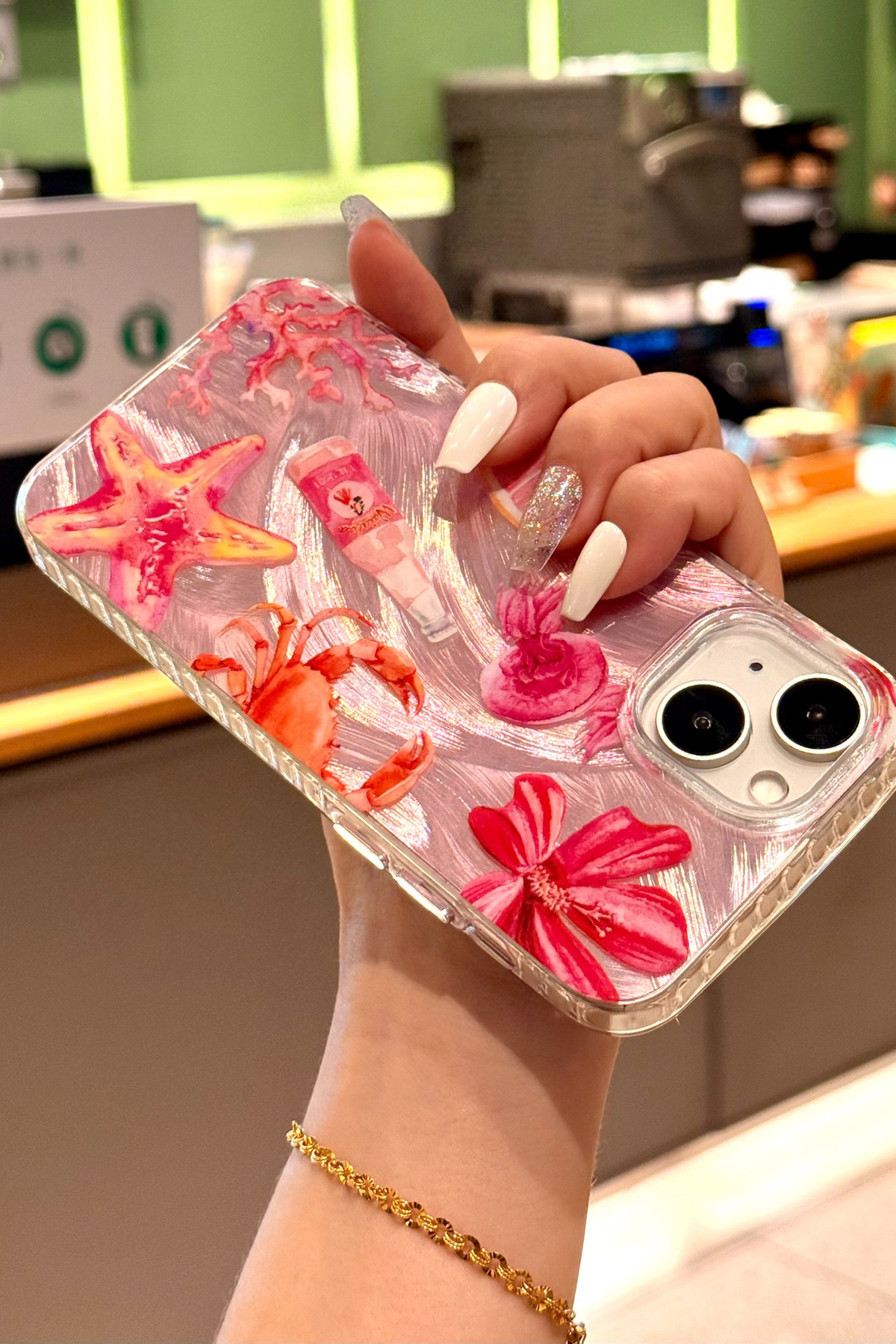 Protect your phone in style with a holographic pink crab coral pattern cover designed specifically for iPhone 13, iPhone 14 and iPhone 15.
