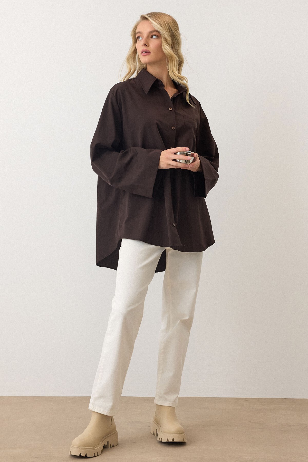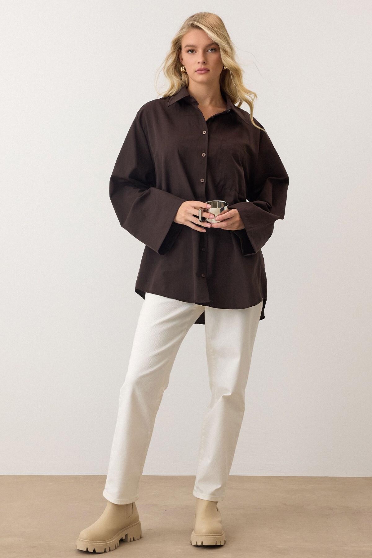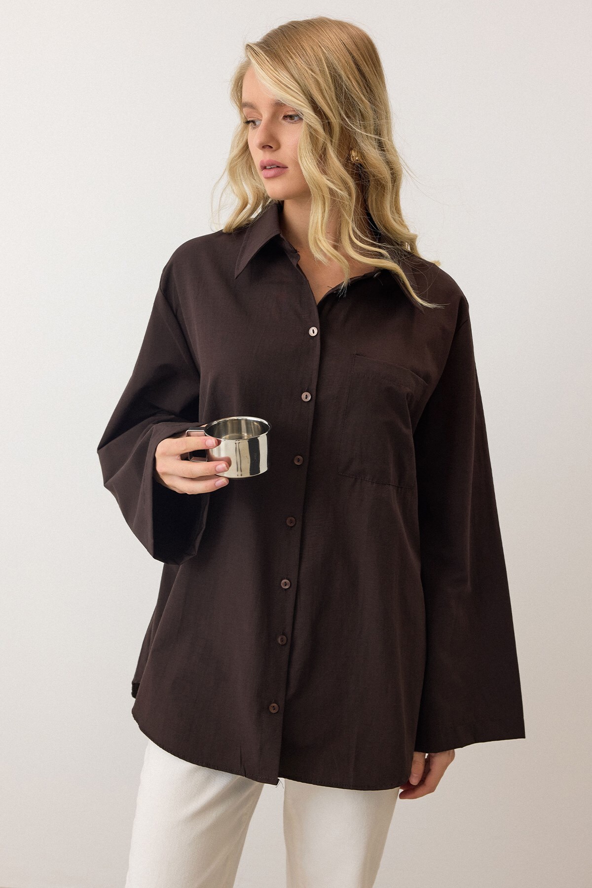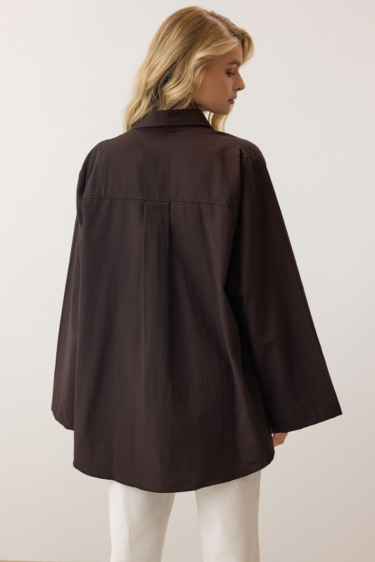 Olcay Spanish Sleeve Loose Cotton Shirt BROWN 9365 | ByTR