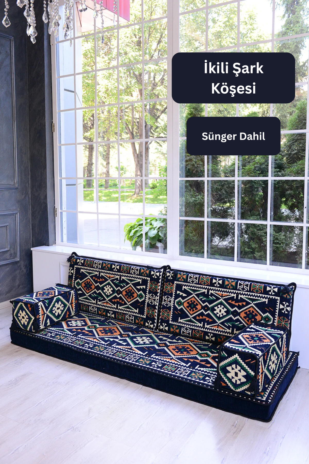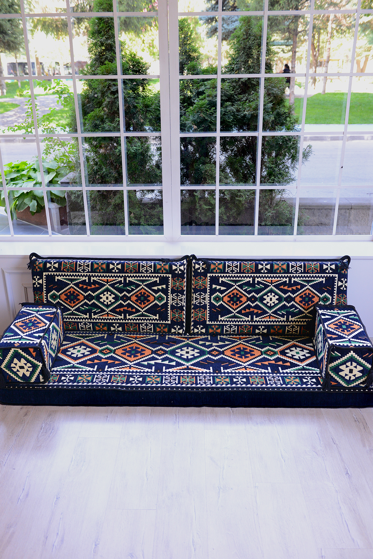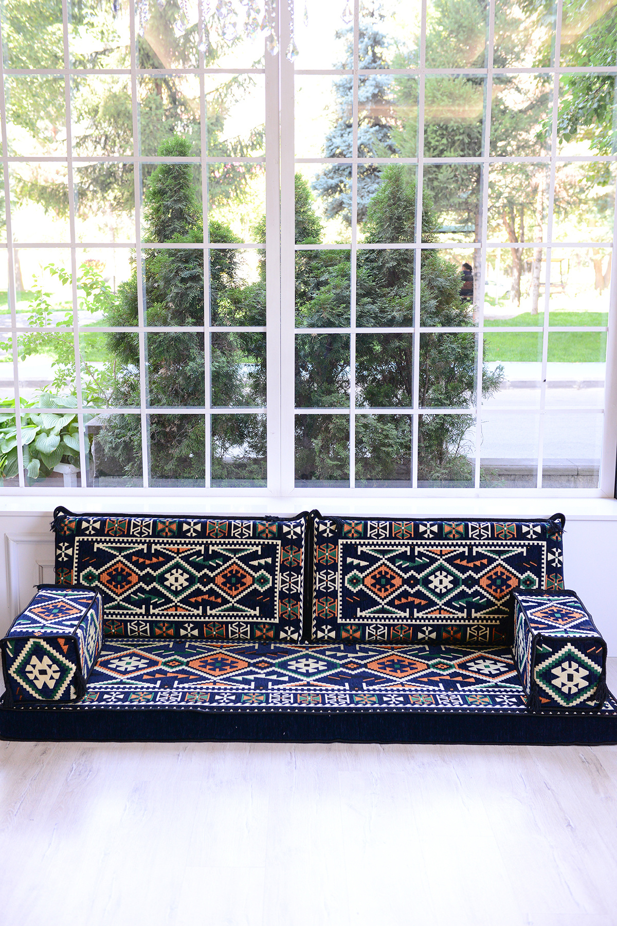 It consists of 5 pieces in total: 1 LONG SITTING CUSHION (70 x 190 x 10 cm), 2 BACK CUSHIONS (42 x 92 x 10 cm) , 2 ARMREST CUSHIONS (22 x 22 x 50 cm).