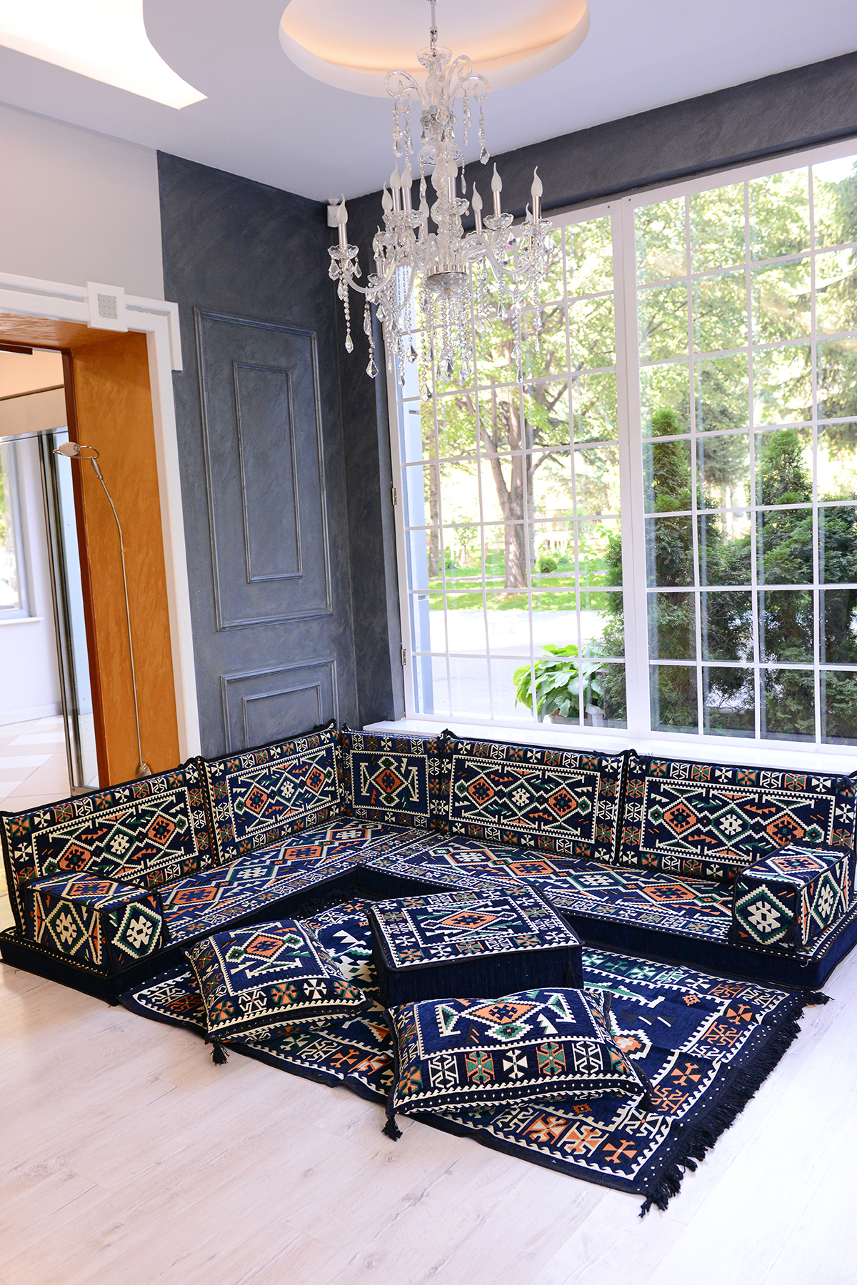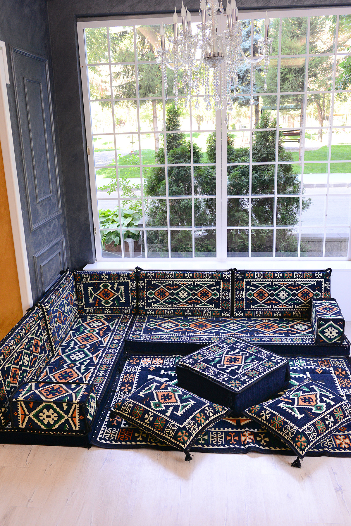 It consists of a total of 13 pieces, including 2 LONG SITTING CUSHIONS (70 x 190 x 10 cm), 4 BACK cushions (42 x 92 x 10 cm), 1 INTERMEDIATE BACK CUSHION (42 x 60 x 10 cm) , 2 ARMREST CUSHIONS (22 x 22 x 50 cm), 1 OTTOMAN SPONGE POUFFE COFFEE TABLE( 60 x 60 x 20 cm), 2 FILLED FLOOR cushions (45 x 65 cm) and 1 RUG ( 120 cm x 180 cm ).