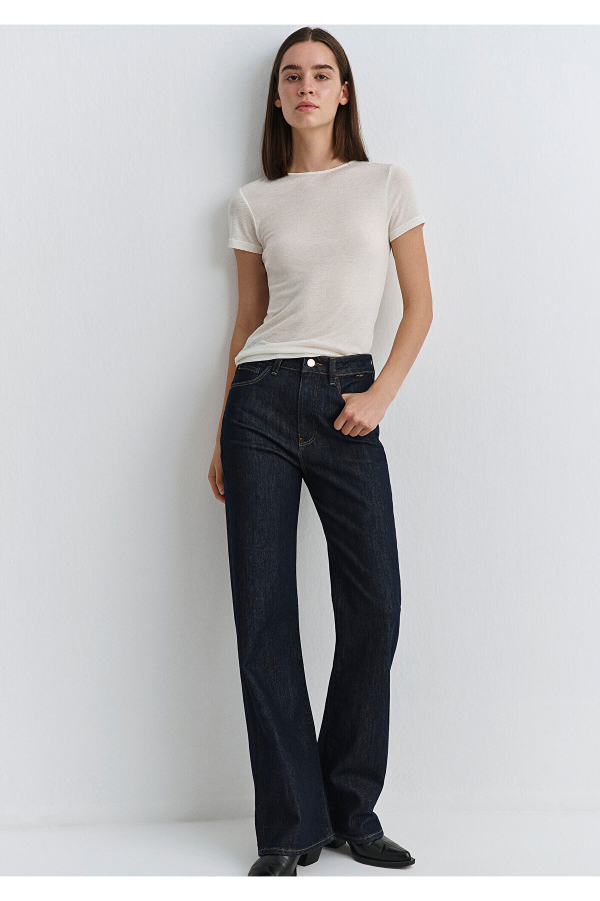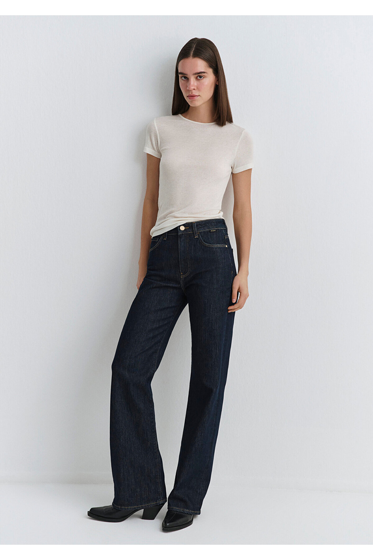 High waist sitting on waist and hips, Wide Leg Jean widening after hips.