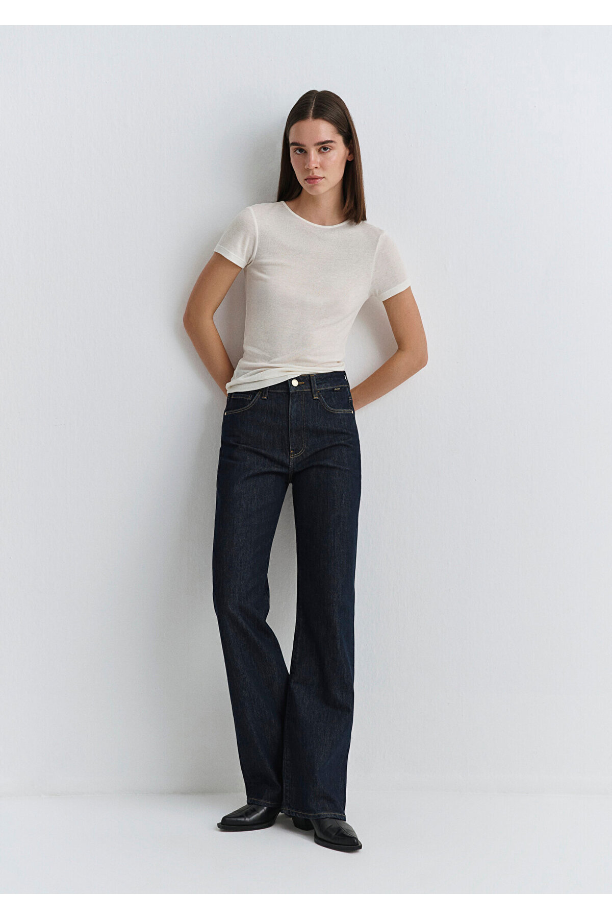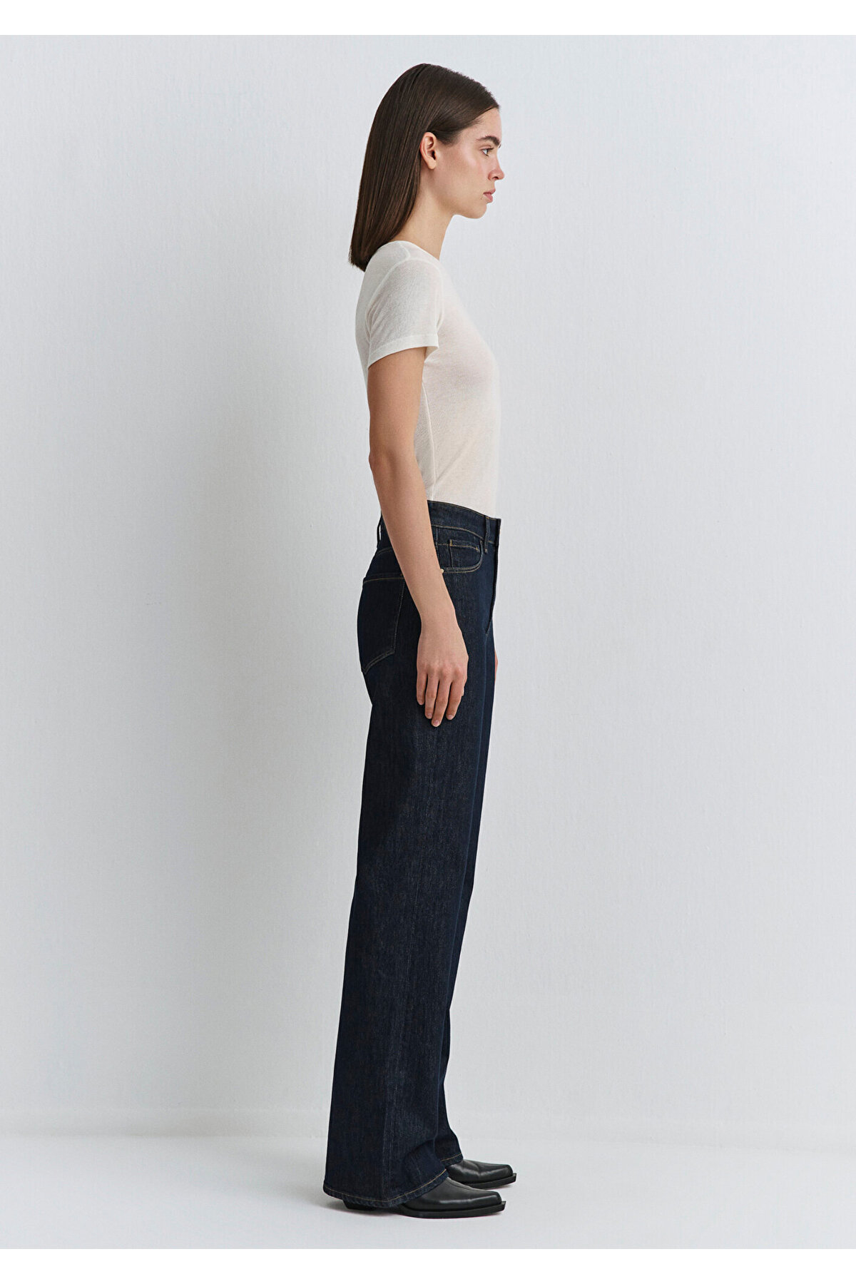 High waist sitting on waist and hips, Wide Leg Jean widening after hips.