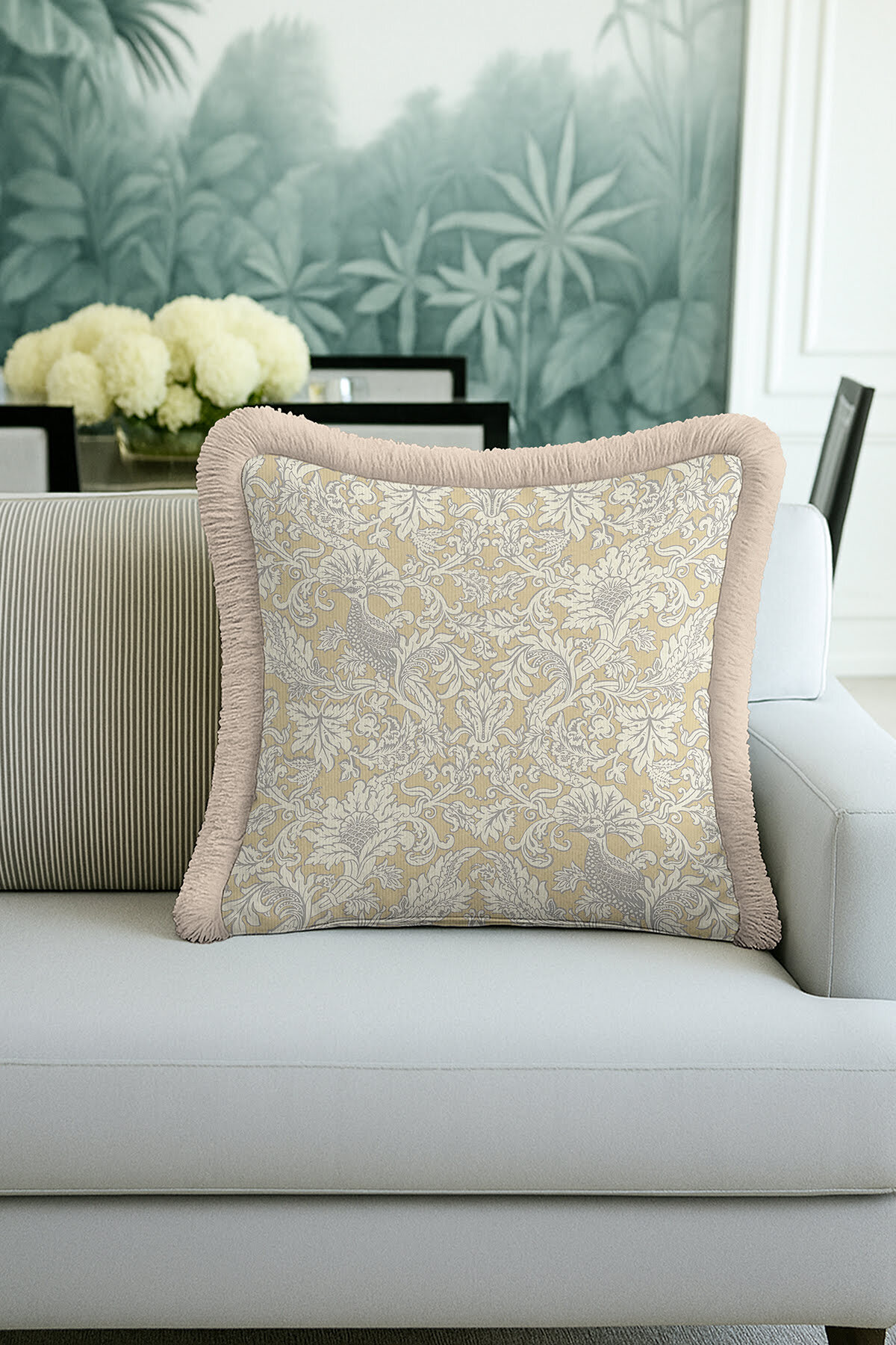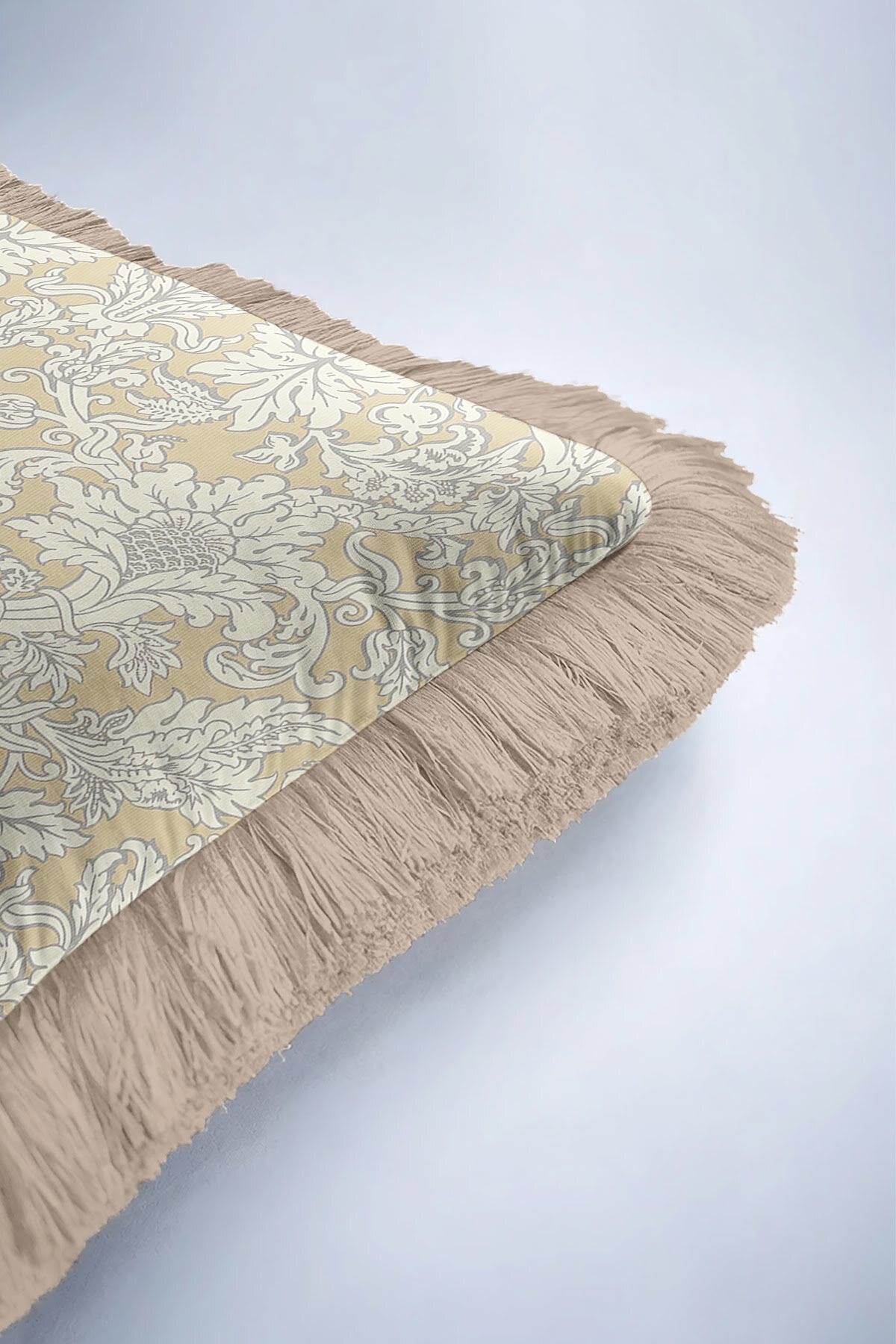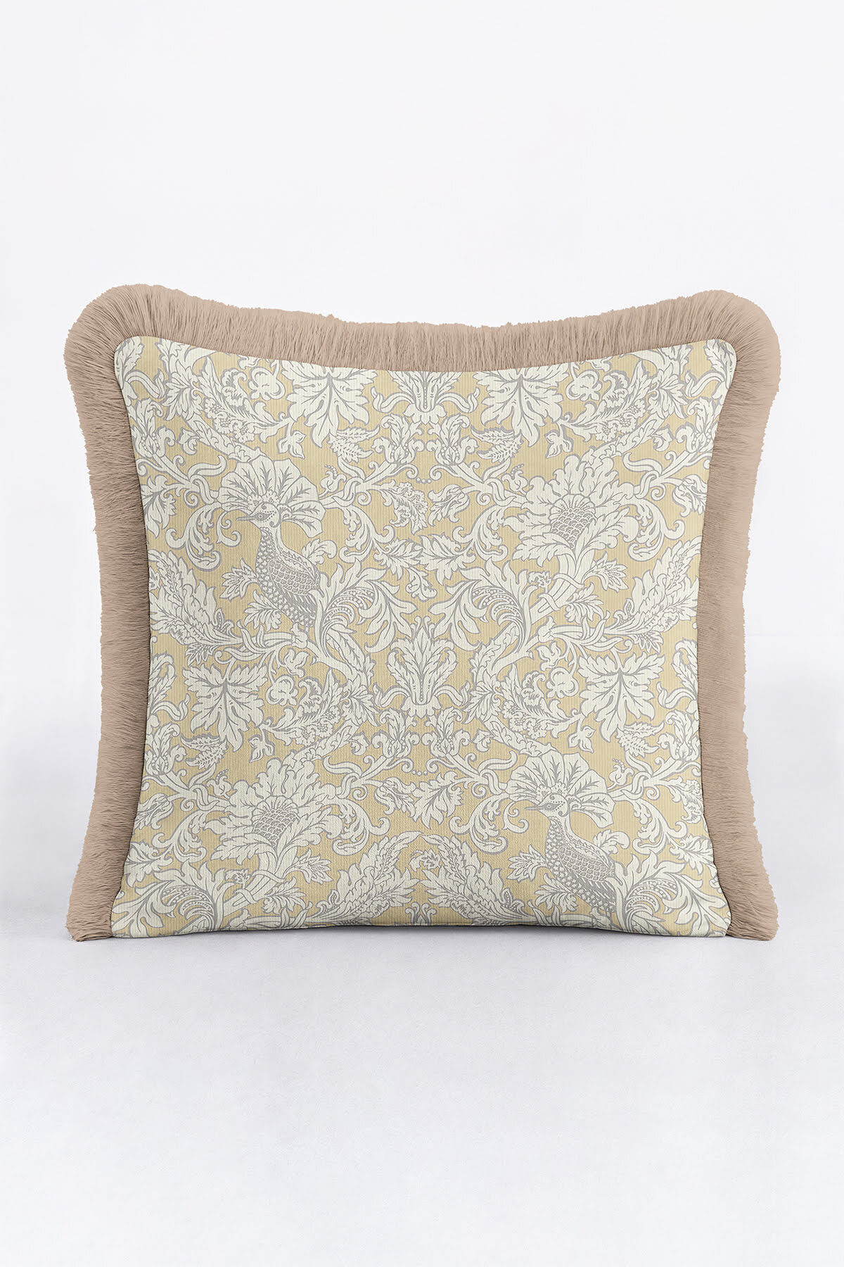 Evimde Bambaşka Baroque Rich Bird Pattern Fringed Pillowcase-Cream Yellow Deluxe Cream Beige Tasseled Pillowcase | ByTR