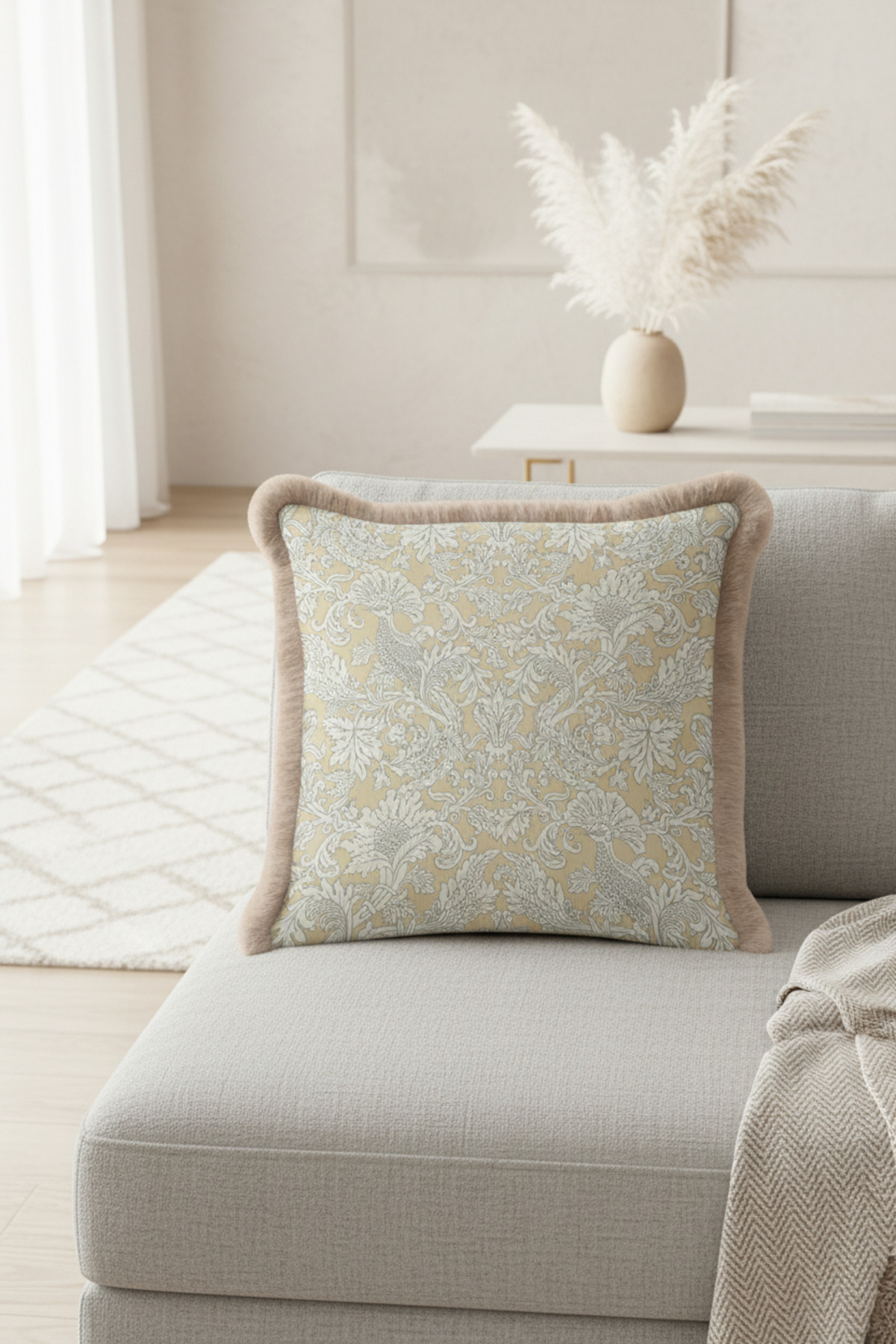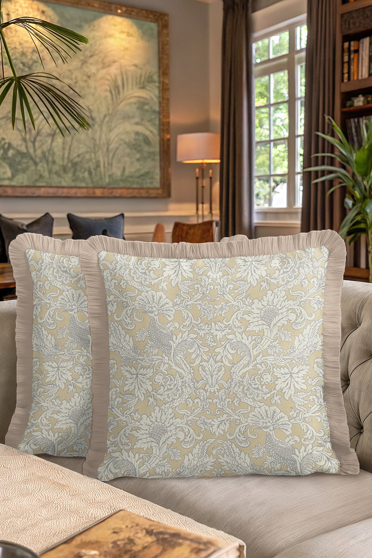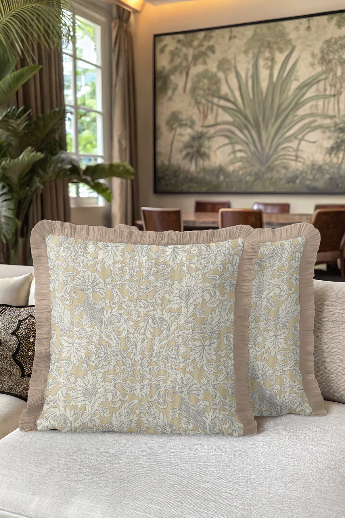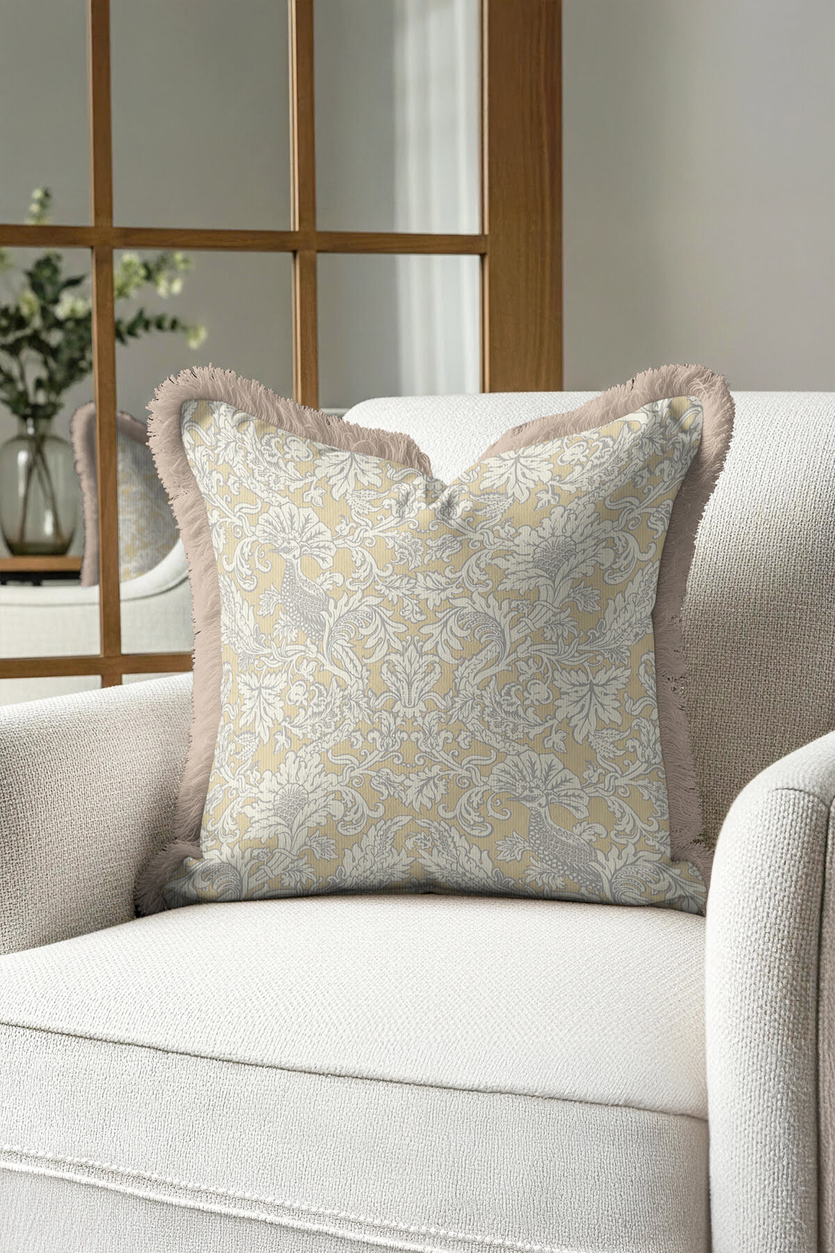 Evimde Bambaşka Baroque Rich Bird Pattern Fringed Pillowcase-Cream Yellow Deluxe Cream Beige Tasseled Pillowcase | ByTR