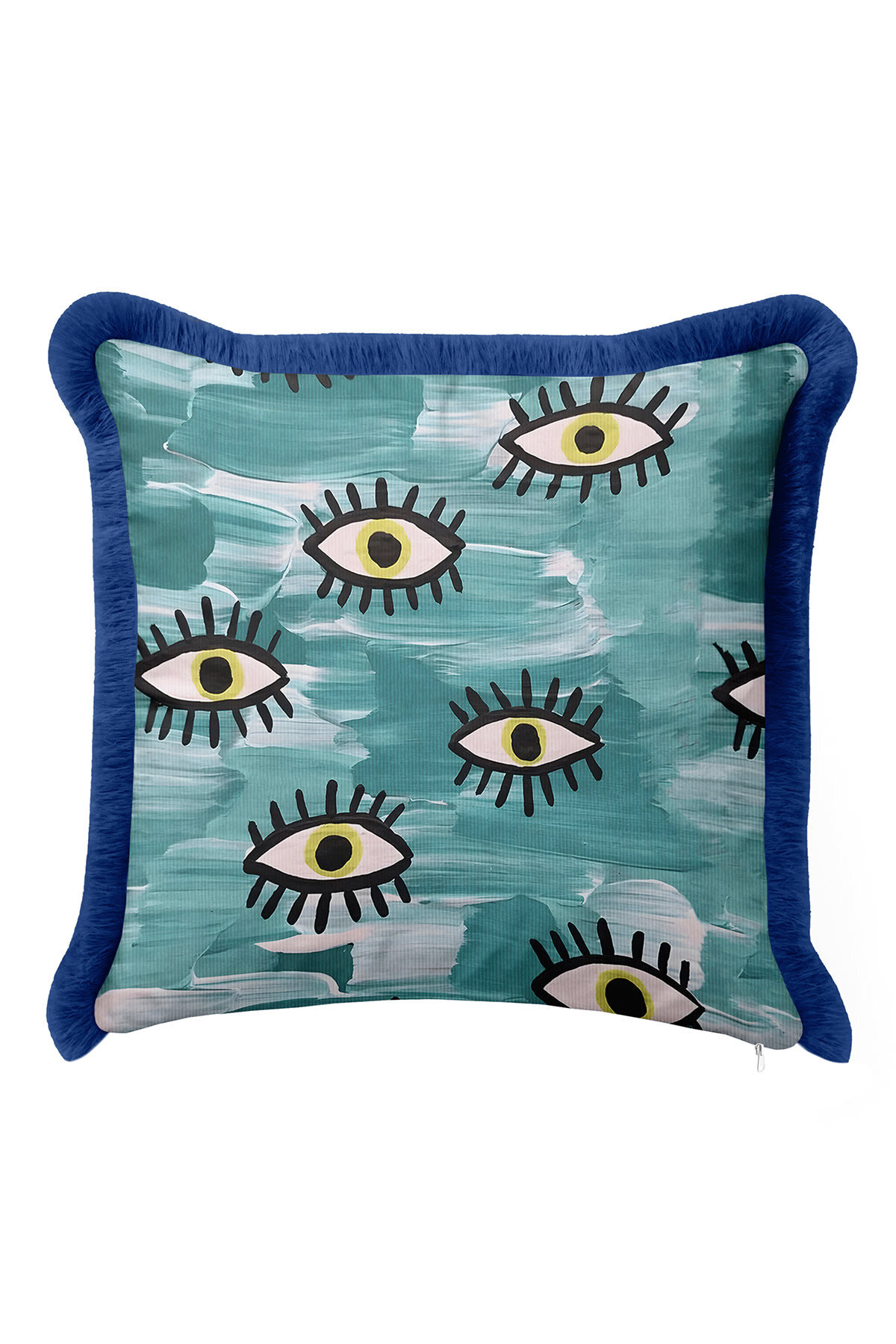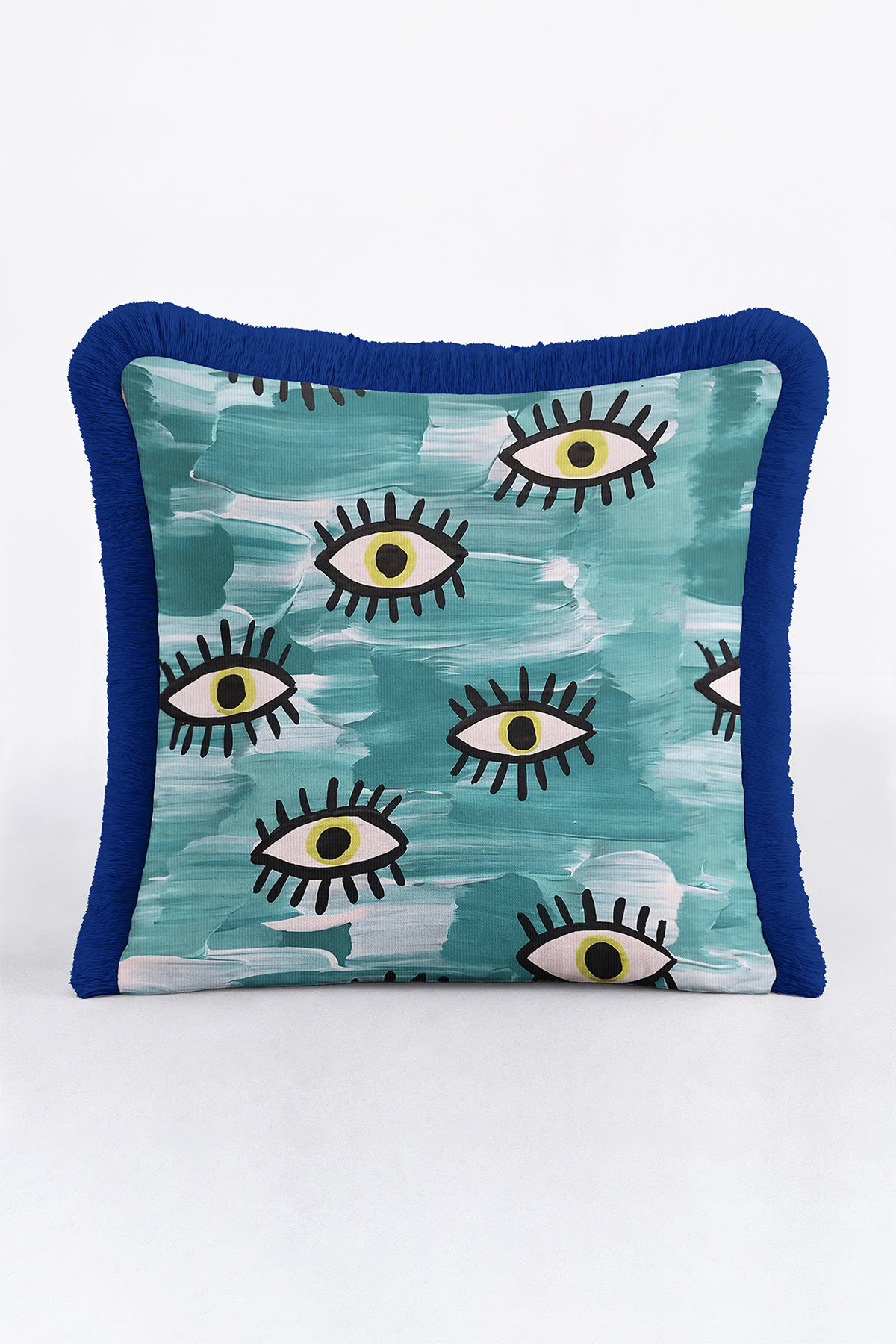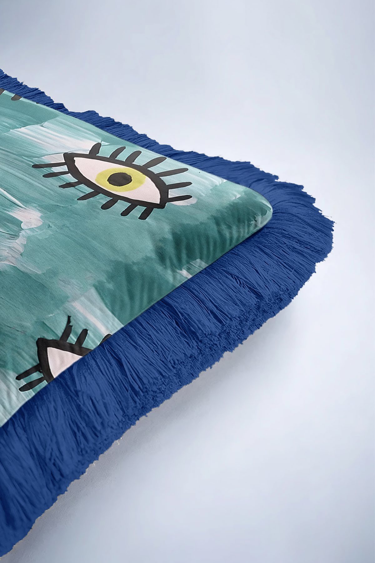 Abstract Eyes Bohemian Blue Tasseled Pillowcase Made of60% Cotton + 40% Polyester fabric with a soft velvet texture.