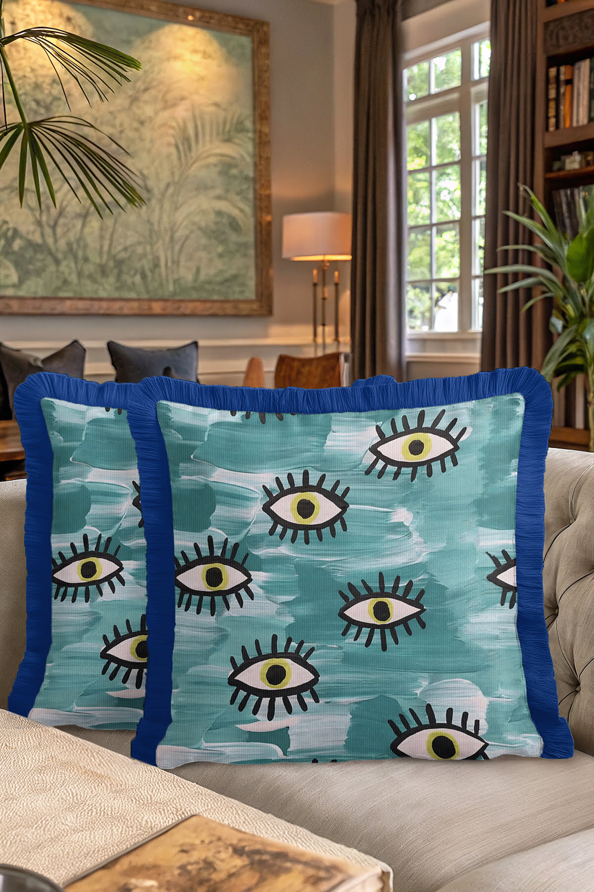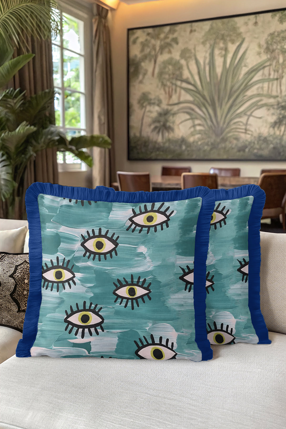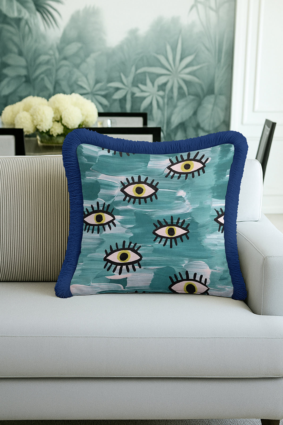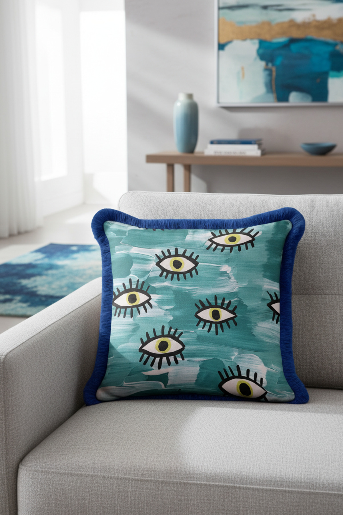 Abstract Eyes Bohemian Blue Tasseled Pillowcase Made of60% Cotton + 40% Polyester fabric with a soft velvet texture.