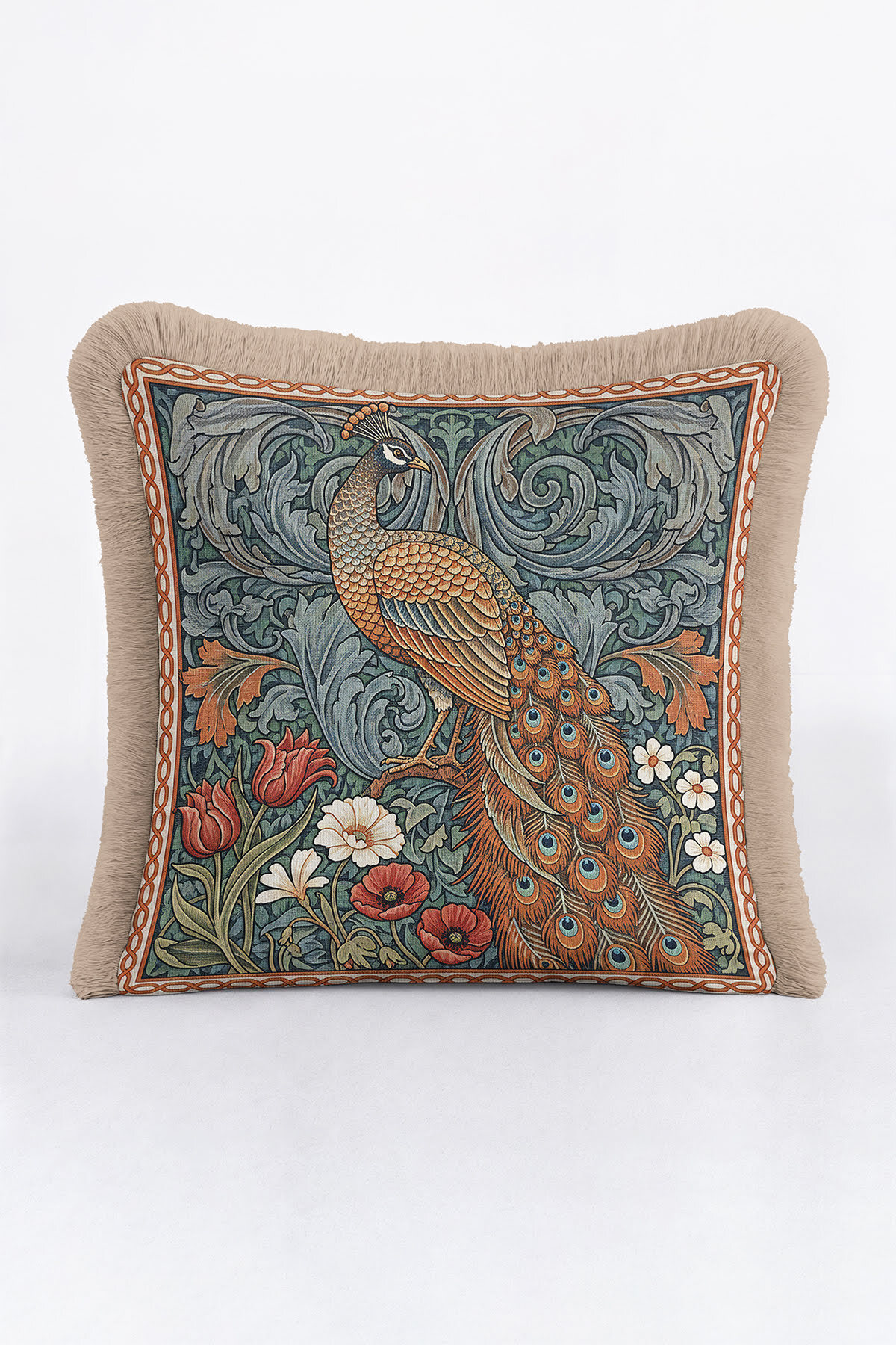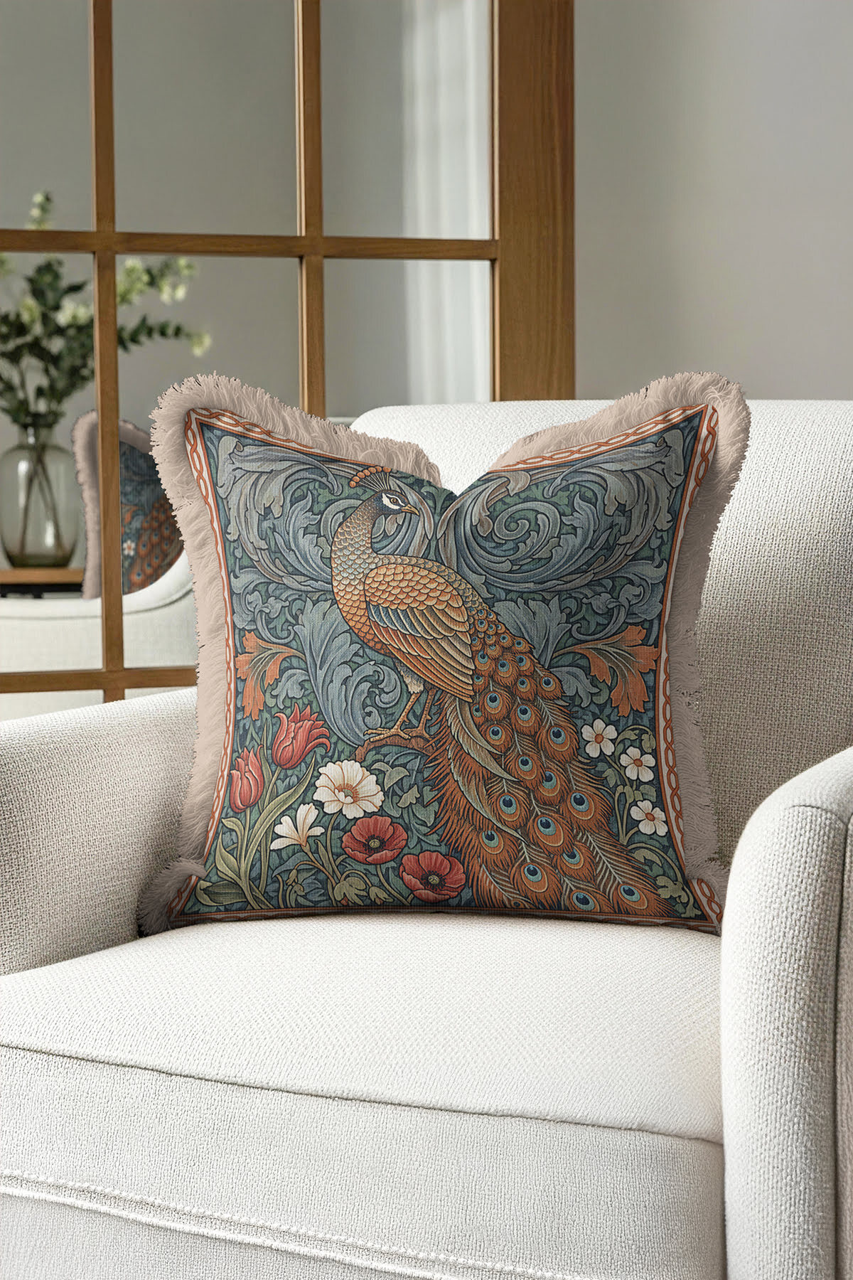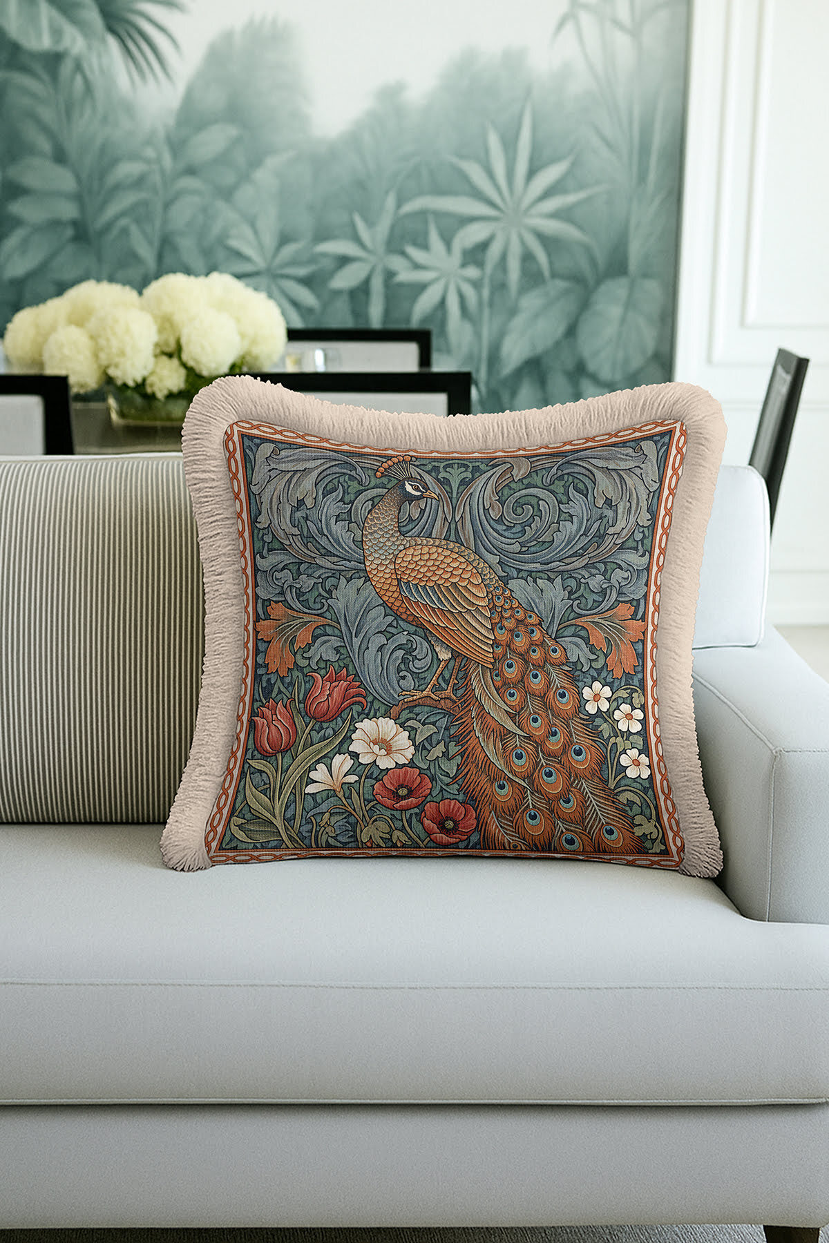 Ethnic Peacock Flower Motif Tasseled Pillowcase Made of60% Cotton + 40% Polyester fabric with a soft velvet texture.