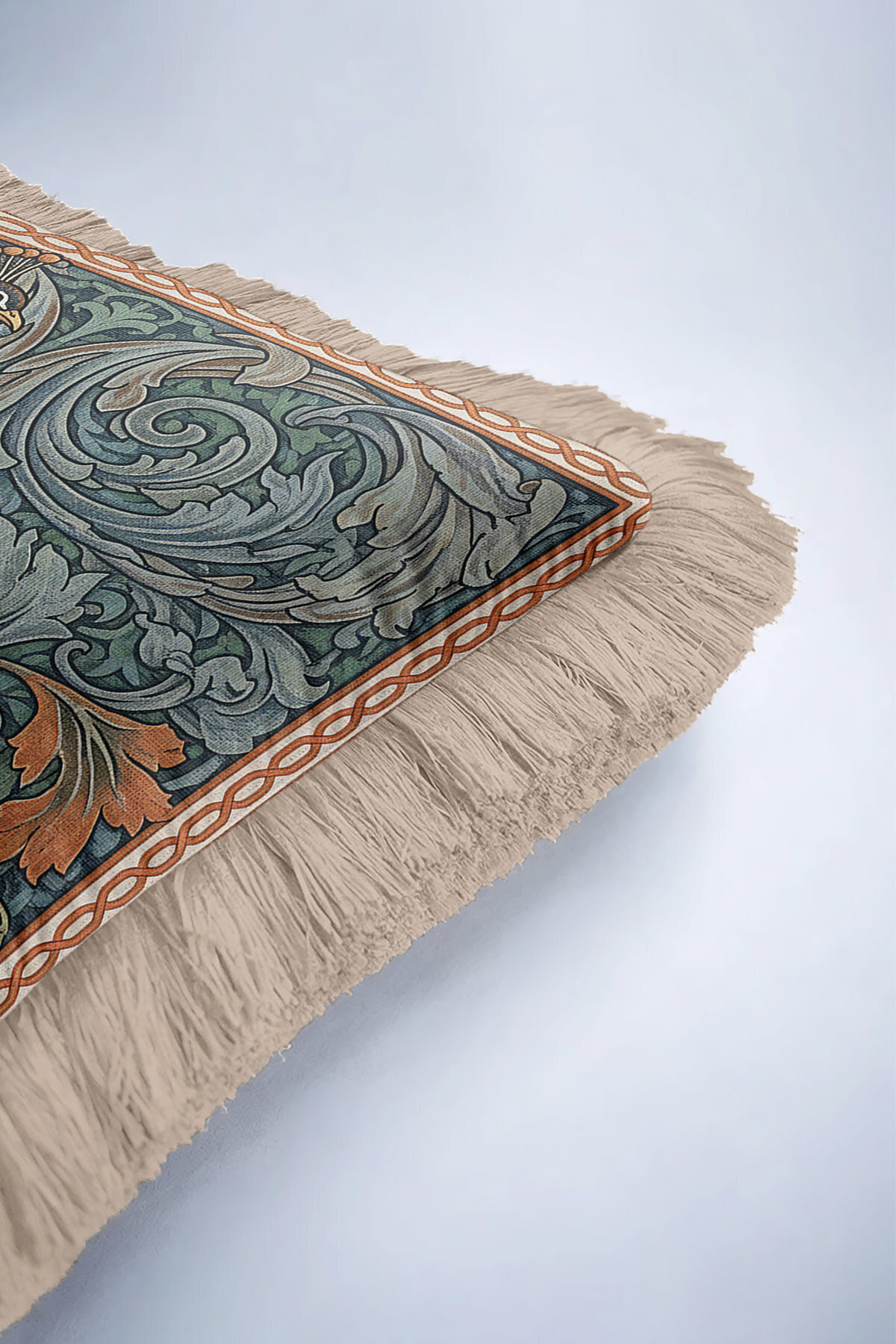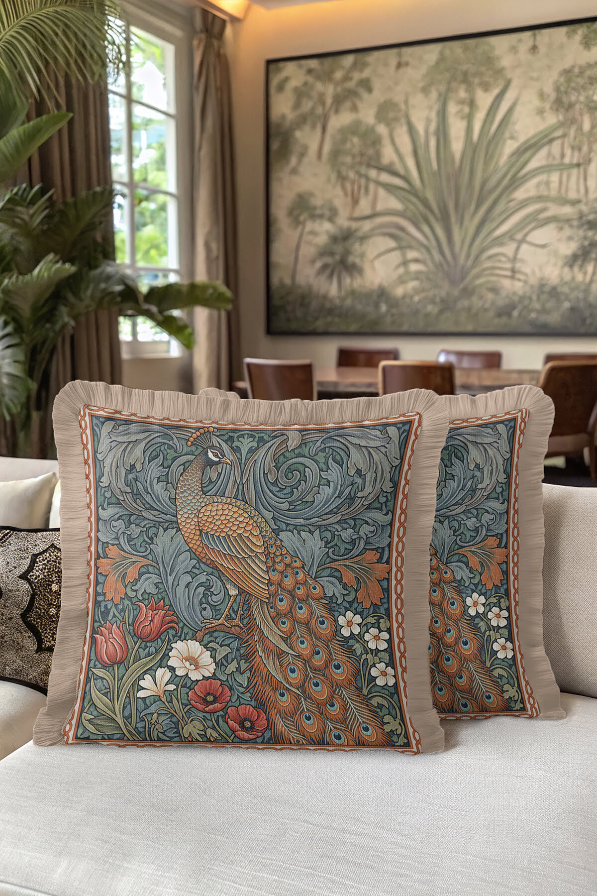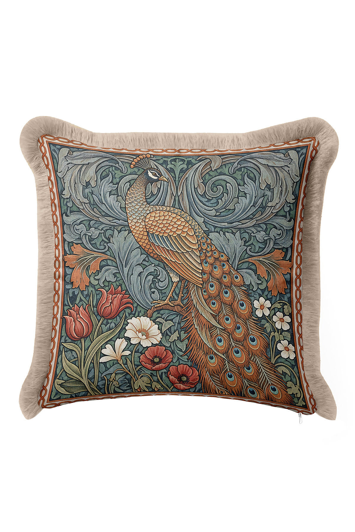 Ethnic Peacock Flower Motif Tasseled Pillowcase Made of60% Cotton + 40% Polyester fabric with a soft velvet texture.