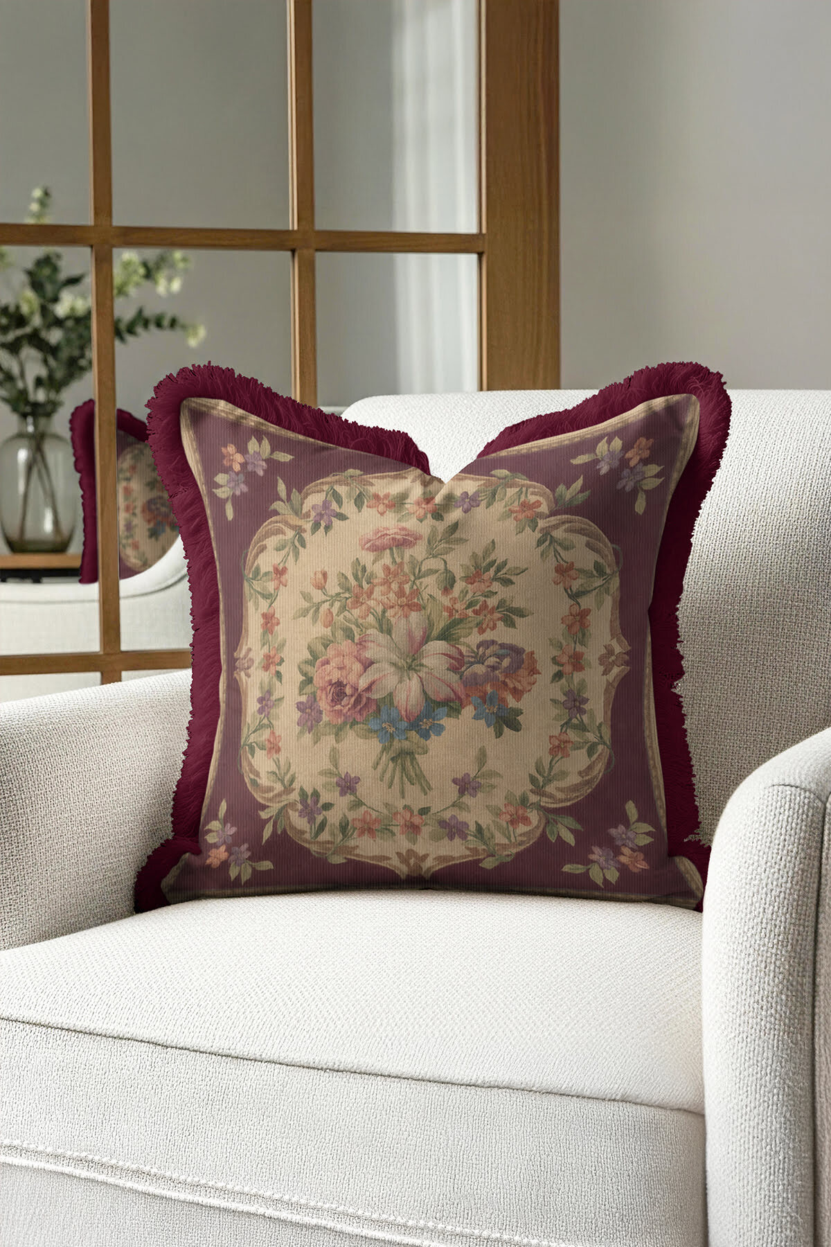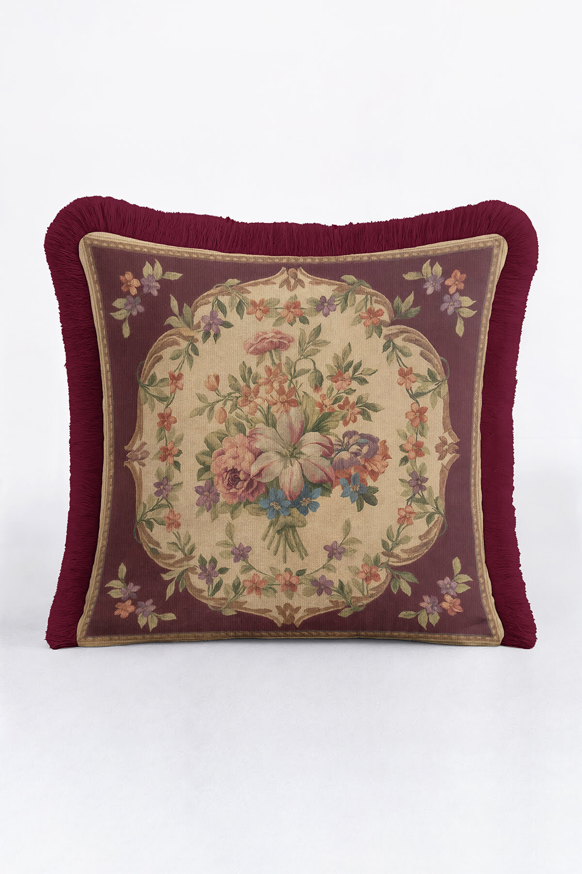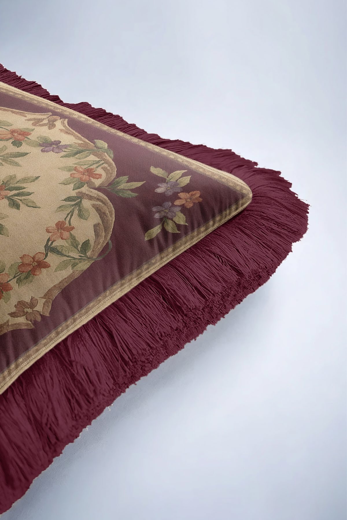 Evimde Bambaşka Elegant Flower Pattern Fringed Pillowcase - Vintage Burgundy Cream Fringed Pillowcase | ByTR