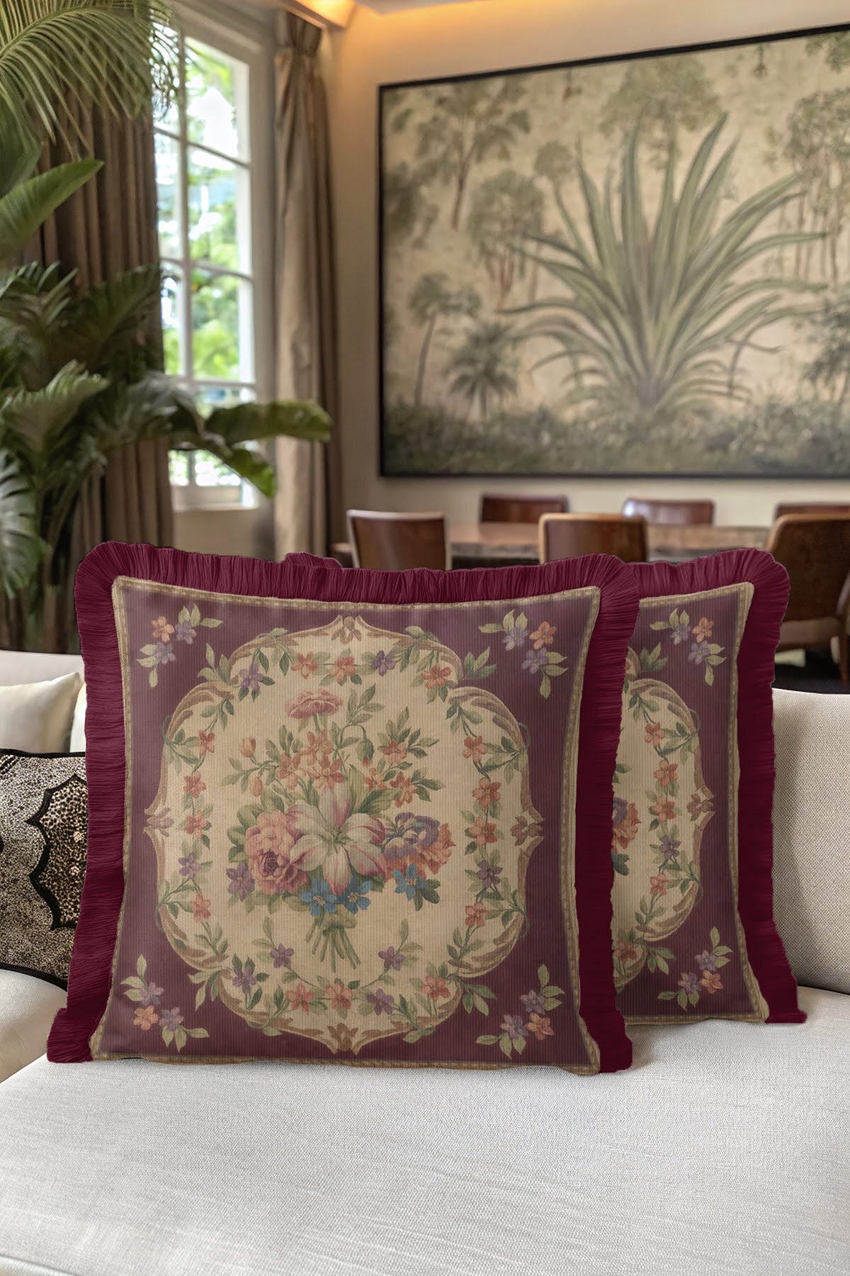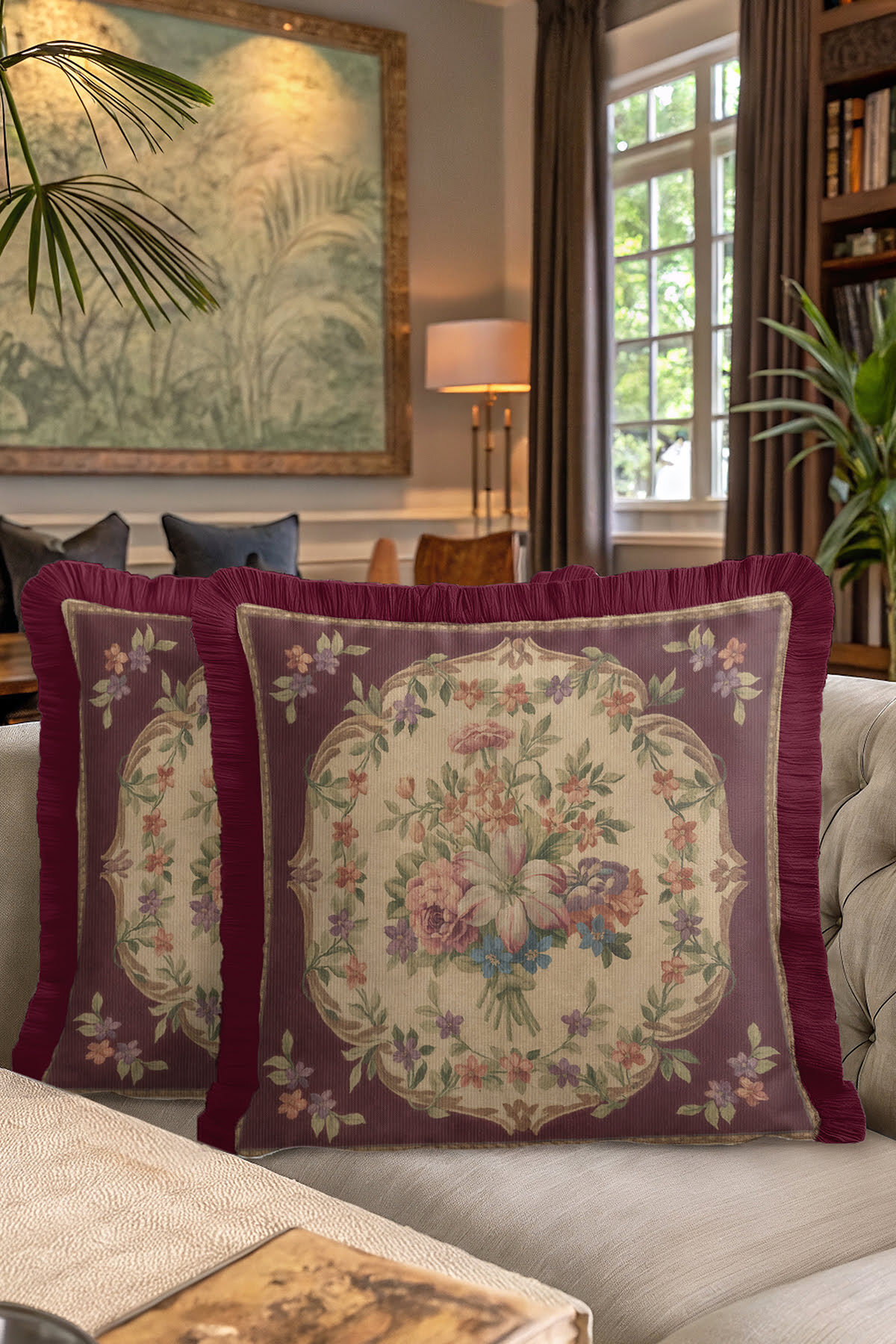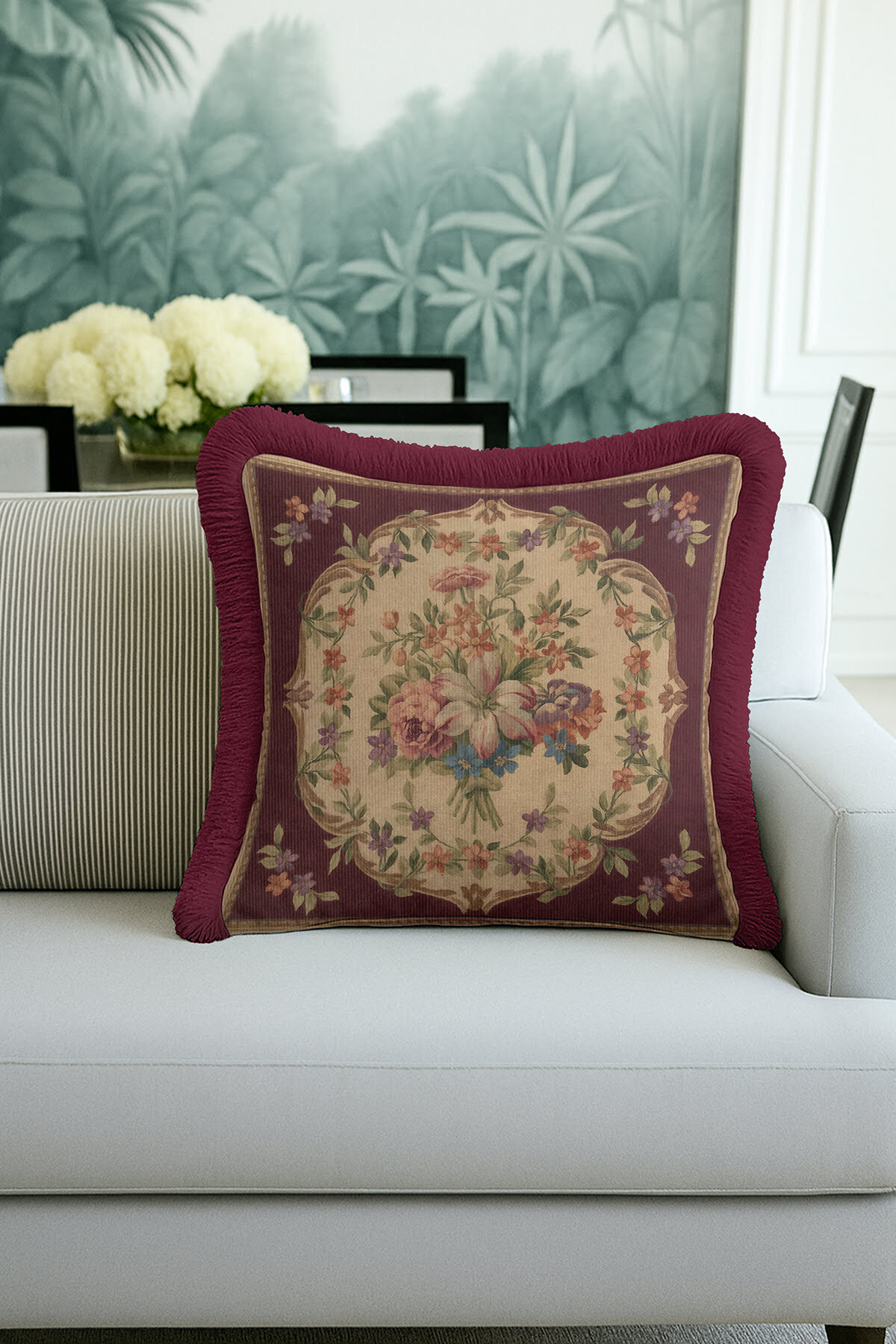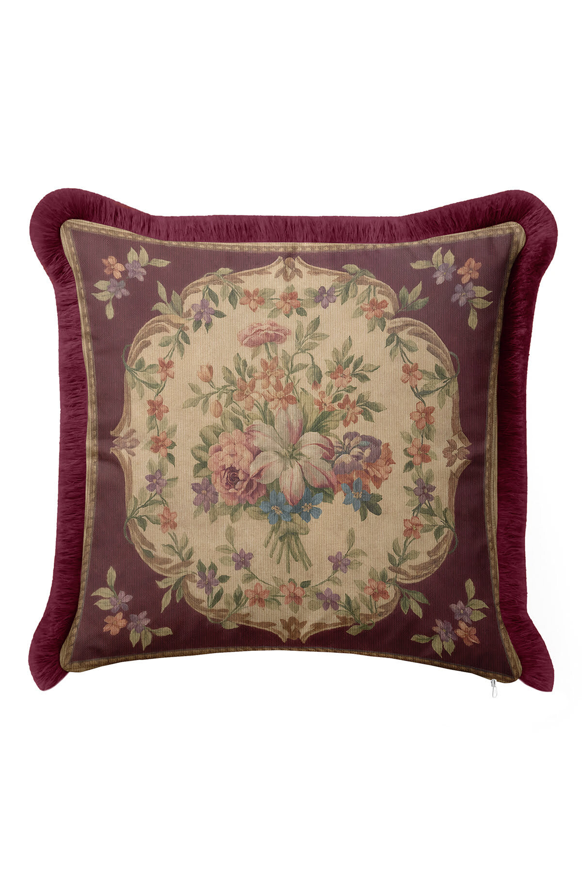 Evimde Bambaşka Elegant Flower Pattern Fringed Pillowcase - Vintage Burgundy Cream Fringed Pillowcase | ByTR