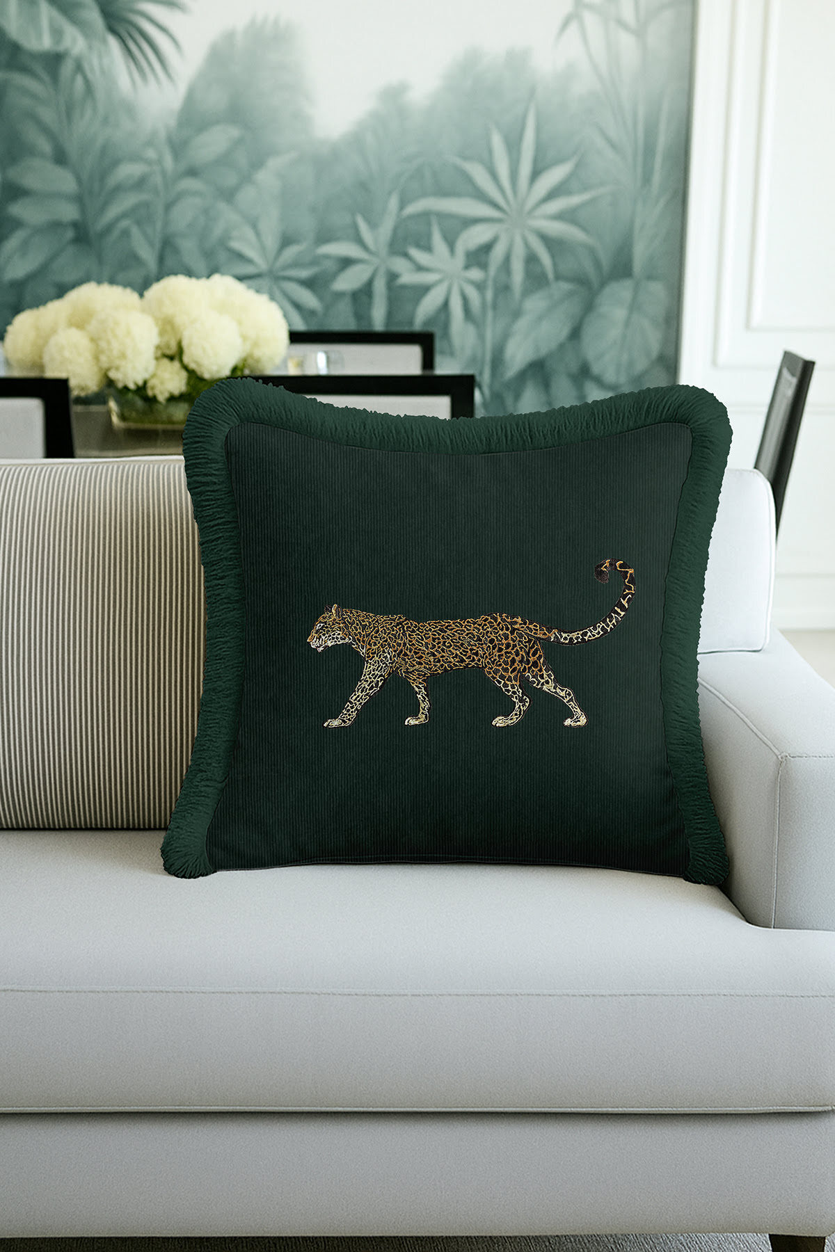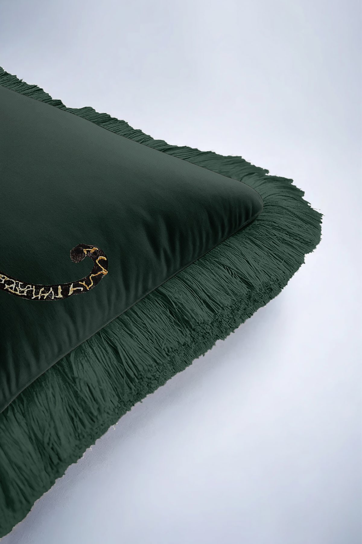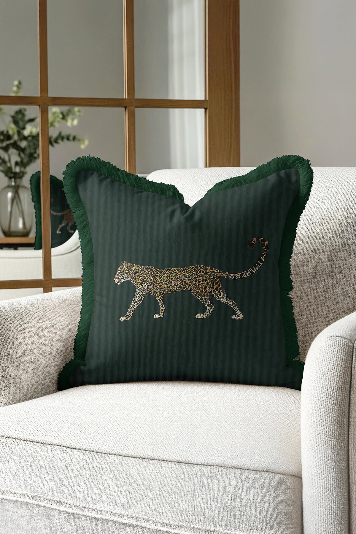Evimde Bambaşka Luxury Leopard Pattern Fringed Pillowcase - Sapphire Green Elegant Bohemian Tassel Pillowcase | ByTR